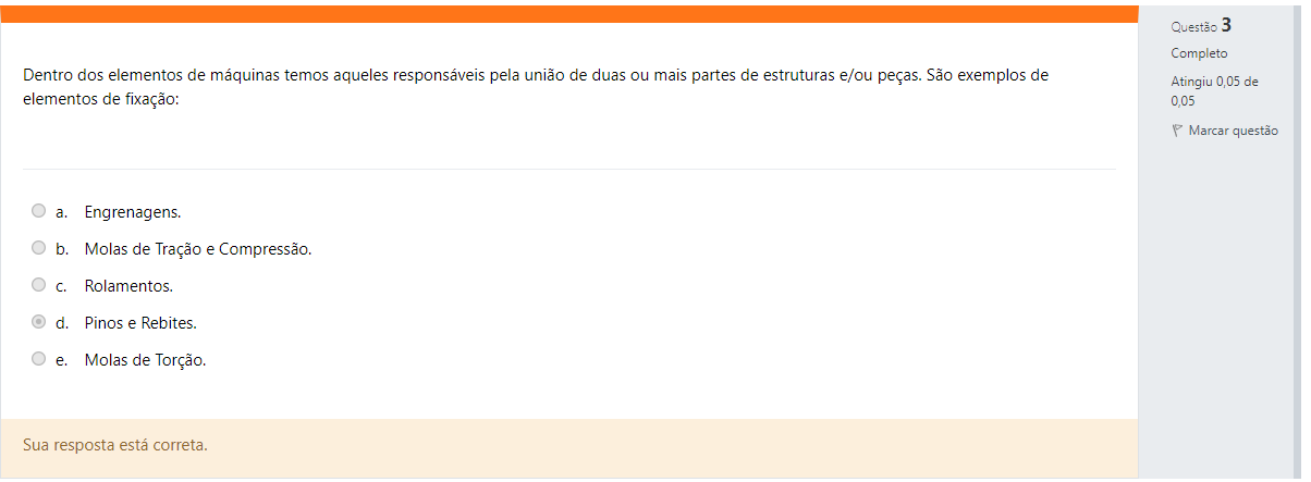 Questão 3 Completo Dentro dos elementos de máquinas temos aqueles responsáveis pela união de duas ou mais partes de estruturas e/ou peças. São exemplos de Atingiu 0,05 de elementos de fixação: Marcar questão a. Engrenagens. b. Molas de Tração e Compressão. C. d. Pinos e Rebites. e. Molas de Torção. Sua resposta está correta.
