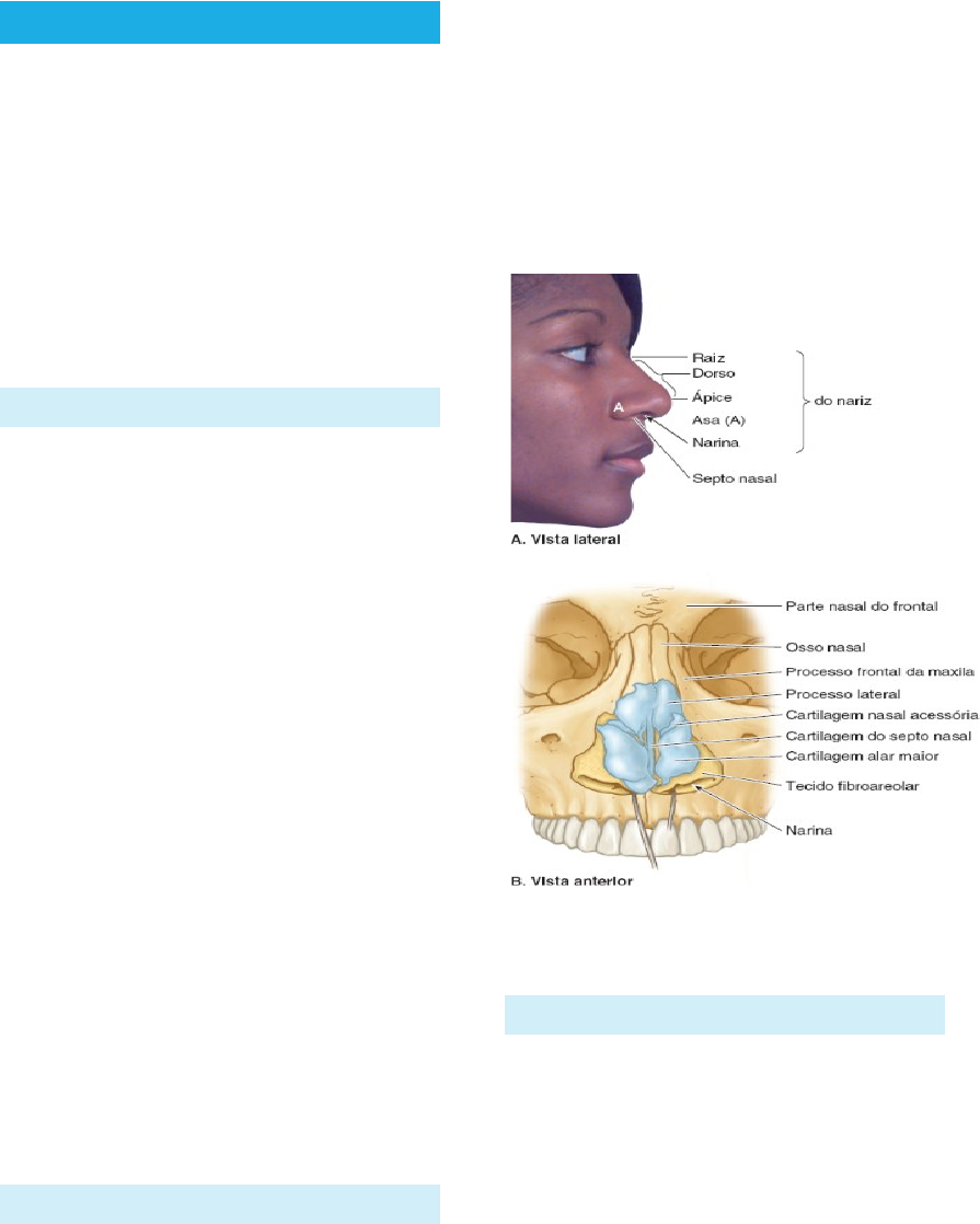<p>nariz</p><p>O nariz é a parte do sistema respiratório situada acima do palato duro, contendo o órgão periférico do olfato. Inclui a parte externa do nariz e a cavidade nasal, que é dividida em direita e esquerda pelo septo nasal As funções do nariz são olfação, respiração, filtração de poeira, umidificação do ar inspirado, além de recepção e eliminação de secreções dos seios paranasais e ductos lacrimonasais.</p><p>Parte externa</p><p>A parte externa do nariz é a parte visível que se projeta da face. Seu esqueleto é principalmente cartilagíneo. As dimensões e o formato dos narizes variam, por causa das diferenças nessas cartilagens.</p><p>· O dorso do nariz estende-se da raiz até o ápice (ponta) do nariz.</p><p>· A face inferior do nariz é perfurada por duas aberturas piriformes, as narinas (aberturas nasais anteriores), que são limitadas lateralmente pelas asas do nariz.</p><p>· A parte óssea superior do nariz, inclusive sua raiz, é coberta por pele fina.</p><p>A pele sobre a parte cartilagínea do nariz é coberta por pele mais espessa, que contém muitas glândulas sebáceas. A pele estende-se até o vestíbulo do nariz, onde há um número variável de pelos rígidos (vibrissas). Como geralmente estão úmidos, esses pelos filtram partículas de poeira do ar que entra na cavidade nasal. A junção da pele e da túnica mucosa está além da área que tem pelos.</p><p>ESQUELETO DO NARIZ</p><p>O esqueleto de sustentação do nariz é formado por osso e cartilagem hialina. A parte óssea do nariz consiste em ossos nasais, processos frontais das maxilas, parte nasal do frontal e sua espinha nasal, e partes ósseas do septo nasal. A parte cartilagínea do nariz é formada por cinco cartilagens principais:</p><p>· duas cartilagens laterais (processos laterais das cartilagens do septo),</p><p>· duas cartilagens alares e uma cartilagem do septo.</p><p>· As cartilagens alares, em forma de U, são livres e móveis. Elas dilatam ou estreitam as narinas quando há contração dos músculos que atuam sobre o nariz.</p><p>Septo nasal</p><p>O septo nasal divide a cavidade nasal em duas partes. O septo tem uma parte óssea e uma parte cartilagínea móvel flexível. Os principais componentes do septo nasal são a lâmina perpendicular do etmoide, o vômer e a cartilagem do septo. A fina lâmina perpendicular do etmoide, que forma a parte superior do septo nasal, desce a partir da lâmina cribriforme. Superiormente a essa lâmina ela se estende como a crista etmoidal. O vômer, um osso fino e plano, forma a parte posteroinferior do septo nasal, com alguma contribuição das cristas nasais da maxila e do palatino. A cartilagem do septo tem uma articulação do tipo macho e fêmea com as margens do septo ósseo.</p><p>Cavidades nasais</p><p>O termo cavidade nasal, neste livro, refere-se a toda a cavidade ou à metade direita ou esquerda, dependendo do contexto. A entrada da cavidade nasal é anterior, através das narinas. Abre-se posteriormente na parte nasal da faringe através dos cóanos. É revestida por túnica mucosa, com exceção do vestíbulo nasal, que é revestido por pele.</p><p>A túnica mucosa do nariz está unida ao periósteo e pericôndrio dos ossos e cartilagens que sustentam o nariz. A túnica mucosa é contínua com o revestimento de todas as câmaras com as quais as cavidades nasais se comunicam: a parte nasal da faringe na parte posterior, os seios paranasais nas partes superior e lateral, e o saco lacrimal e a túnica conjuntiva na parte superior. Os dois terços inferiores da túnica mucosa do nariz correspondem à área respiratória e o terço superior é a área olfatória.</p><p>O ar que passa sobre a área respiratória é aquecido e umedecido antes de atravessar o restante das vias respiratórias superiores até os pulmões. A área olfatória contém o órgão periférico do olfato; a aspiração leva ar até essa área.</p><p>LIMITES DAS CAVIDADES NASAIS</p><p>As cavidades nasais têm teto, assoalho e paredes medial e lateral:</p><p>•O teto das cavidades nasais é curvo e estreito, com exceção da extremidade posterior, onde o corpo do esfenoide, que é oco, forma o teto. É dividido em três partes (frontonasal, etmoidal e esfenoidal), nomeadas de acordo com os ossos que formam cada parte (Figura 8.104)</p><p>•O assoalho das cavidades nasais é mais largo do que o teto e é formado pelos processos palatinos da maxila e pelas lâminas horizontais do palatino</p><p>•A parede medial das cavidades nasais é formada pelo septo nasal</p><p>•As paredes laterais das cavidades nasais são irregulares por causa de três lâminas ósseas, as conchas nasais, que se projetam inferiormente, como persianas.</p><p>CARACTERÍSTICAS DAS CAVIDADES NASAIS</p><p>As conchas nasais (superior, média e inferior) curvam-se em sentido inferomedial, pendendo da parede lateral como persianas ou cortinas curtas. As conchas ou turbinados de muitos mamíferos (sobretudo de mamíferos corredores e daqueles que vivem em ambientes hostis) são estruturas muito convolutas, semelhantes a rolos, que oferecem uma grande área de superfície para troca de calor. Tanto seres humanos com conchas nasais simples, semelhantes a lâminas, quanto animais com conchas complexas, têm um recesso ou meato nasal (passagem na cavidade nasal) sob cada formação óssea. Assim, a cavidade nasal é dividida em cinco passagens: um recesso esfenoetmoidal posterossuperior, três meatos nasais laterais (superior, médio e inferior) e um meato nasal comum medial, no qual se abrem as quatro passagens laterais. A concha nasal inferior é a mais longa e mais larga das conchas, sendo formada por um osso independente (de mesmo nome, concha nasal inferior) coberto por uma túnica mucosa que contém grandes espaços vasculares que aumentam, afetando o calibre da cavidade nasal. As conchas nasais média e superior são processos mediais do etmoide. A infecção ou irritação da tún