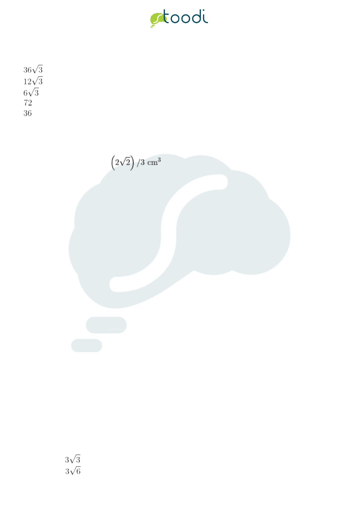<p>Página 1</p><p>Copyright (c) 2013 - 2018 Stoodi Ensino e Treinamento a Distância LTDA - EPP - Todos os direitos reservados</p><p>1. Stoodi</p><p>A soma das medidas das arestas de um tetraedro é 36 cm. Qual sua área total, em cm2?</p><p>a.</p><p>b.</p><p>c.</p><p>d.</p><p>e.</p><p>2. UFSJ 2012</p><p>Se o volume de um tetraedro regular é , a medida de sua aresta é, em centímetros:</p><p>a. 3</p><p>b. 2/3</p><p>c. 6</p><p>d. 2</p><p>3. PUC</p><p>Um imperador de uma antiga civilização mandou construir uma pirâmide que seria usada como seu túmulo. As características dessa</p><p>pirâmide são</p><p>• 1º Sua base é um quadrado com 100 m de lado.</p><p>• 2º Sua altura é de 100 m.</p><p>Para construir cada parte da pirâmide equivalente a 1000 m3 , os escravos, utilizados como mão de obra, gastavam, em média, 54</p><p>dias. Mantida essa média, o tempo necessário para a construção da pirâmide, medido em anos de 360 dias, foi de:</p><p>a. 40 anos.</p><p>b. 50 anos.</p><p>c. 60 anos.</p><p>d. 90 anos.</p><p>e. 150 anos</p><p>4. MACKENZIE 2014</p><p>Se um tetraedro regular tem arestas de comprimento 6 m, então podemos afirmar que:</p><p>a. a altura é igual a m.</p><p>b. a altura é igual a m.</p><p>Página 2</p><p>Copyright (c) 2013 - 2018 Stoodi Ensino e Treinamento a Distância LTDA - EPP - Todos os direitos reservados</p><p>c. a altura é igual a 4,5 m.</p><p>d. o volume é igual a</p><p>e. o volume é igual a</p><p>5. Stoodi</p><p>Qual o volume, em cm3, de uma pirâmide cuja base é um triângulo eqüilátero de lado 3 e cuja altura mede 5 cm?</p><p>a.</p><p>b.</p><p>c.</p><p>d.</p><p>e.</p><p>6. Stoodi</p><p>A base de uma pirâmide reta é um quadrado cujo lado mede cm. Se as arestas laterais da pirâmide medem 17 cm, o seu</p><p>volume, em centímetros cúbicos, é:</p><p>a. 520</p><p>b. 640</p><p>c. 680</p><p>d. 750</p><p>e. 780</p><p>7. UFRGS</p><p>Se duplicarmos a medida da aresta da base de uma pirâmide quadrangular regular e reduzirmos sua altura à metade, o volume desta</p><p>pirâmide:</p><p>a. será reduzido à quarta parte.</p><p>b. será reduzido à metade.</p><p>c. permanecerá inalterado.</p><p>d. será duplicado.</p><p>e. aumentará quatro vezes.</p><p>8. UEPB 2013</p><p>Página 3</p><p>Copyright (c) 2013 - 2018 Stoodi Ensino e Treinamento a Distância LTDA - EPP - Todos os direitos reservados</p><p>A altura de um tetraedro regular que possui área total e volume numericamente iguais. é:</p><p>a.</p><p>b. 36</p><p>c. 6</p><p>d.</p><p>e. 12</p><p>9. Stoodi</p><p>Nesta figura estão representados dois poliedros de Platão: o cubo ABCDEFGH e o octaedro MNOPQR.</p><p>Cada aresta do cubo mede 6 cm e os vértices do octaedro são os pontos centrais das faces do cubo. Então, é correto afirmar que a</p><p>área lateral e o volume do octaedro medem, respectivamente:</p><p>a. e</p><p>b. e</p><p>c. e</p><p>d. e</p><p>e. e</p><p>10. UPF 2012</p><p>Nesta flgura estão representados dois poliedros de Platão: o cubo ABCDEFGH e o octaedro MNOPOR.</p><p>Página 4</p><p>Copyright (c) 2013 - 2018 Stoodi Ensino e Treinamento a Distância LTDA - EPP - Todos os direitos reservados</p><p>Cada aresta do cubo mede 6 cm e os vértices do octaedro são os pontos centrais das faces do cubo. Então, é correto afirmar que a</p><p>área lateral e o volume do octaedro medem, respectivamente:</p><p>a.</p><p>b.</p><p>c.</p><p>d.</p><p>e.</p><p>11. INSPER 2011</p><p>Dois faraós do antigo Egito mandaram construir seus túmulos, ambos na forma de pirâmides quadrangulares regulares, num mesmo</p><p>terreno plano, com os centros de suas bases distando 120m. As duas pirâmides têm o mesmo volume, mas a área da base de uma</p><p>delas é o dobro da área da base da outra. Se a pirâmide mais alta tem 100m de altura, então a distância entre os vértices das duas</p><p>pirâmides, em metros, é igual a :</p><p>a. 100.</p><p>b. 120.</p><p>c. 130.</p><p>d. 150.</p><p>e. 160.</p><p>12. EPCAR (AFA) 2012</p><p>Um sólido maciço foi obtido quando a base de uma pirâmide hexagonal regular de altura 6cm foi colada à base de uma pirâmide reta</p><p>de base retangular e altura 3cm de forma que 4 dos 6 vértices da base da primeira coincidam com os vértices da base da segunda,</p><p>conforme figura. Desprezando-se o volume da cola, se a aresta da base da pirâmide hexagonal mede cm então, o volume do</p><p>sólido obtido, em cm3 é igual a:</p><p>a. 15</p><p>b. 20</p><p>Página 5</p><p>Copyright (c) 2013 - 2018 Stoodi Ensino e Treinamento a Distância LTDA - EPP - Todos os direitos reservados</p><p>c. 25</p><p>d. 30</p><p>13. FGV 2012</p><p>Arestas opostas de um tetraedro são arestas que não têm ponto em comum. Um inseto anda sobre a superfície de um tetraedro</p><p>regular de aresta 10cm partindo do ponto médio de uma aresta e indo para o ponto médio de uma aresta oposta à aresta de onde</p><p>partiu. Se o percurso foi feito pelo caminho mais curto possível, então o inseto percorreu a distância, em centímetros, igual a:</p><p>a. 10</p><p>b. 15</p><p>c. 10</p><p>d. 10</p><p>e. 5</p><p>14. ENEM 2016</p><p>É comum os artistas plásticos se apropriarem de entes matemáticos para produzirem, por exemplo, formas e imagens por meio de</p><p>manipulações. Um artista plástico, em uma de suas obras, pretende retratar os diversos polígonos obtidos pelas intersecções de um</p><p>plano com uma pirâmide regular de base quadrada.</p><p>Segundo a classificação dos polígonos, quais deles são possíveis de serem obtidos pelo artista plástico?</p><p>a. Quadrados, apenas.</p><p>b. Triângulos e quadrados, apenas.</p><p>c. Triângulos, quadrados e trapézios, apenas.</p><p>d. Triângulos, quadrados e trapézios, apenas .</p><p>e. Triângulos, quadrados, trapézios, quadriláteros irregulares e pentágonos, apenas.</p><p>15. IME 2014</p><p>Seja SABCD uma pirâmide, cuja base é um quadrilátero convexo ABCD A aresta SD é a altura da pirâmide. Sabe-se que</p><p>.O volume da pirâm