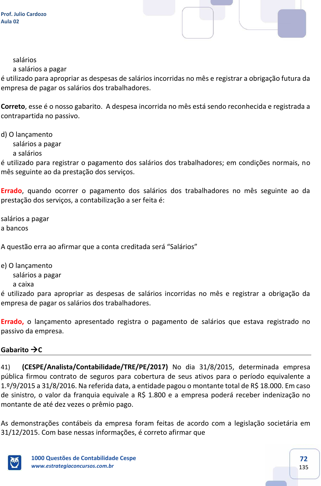 <p>Prof. Julio Cardozo</p><p>Aula 02</p><p>1000 Questões de Contabilidade Cespe</p><p>www.estrategiaconcursos.com.br</p><p>72</p><p>135</p><p>salários</p><p>a salários a pagar</p><p>é utilizado para apropriar as despesas de salários incorridas no mês e registrar a obrigação futura da</p><p>empresa de pagar os salários dos trabalhadores.</p><p>Correto, esse é o nosso gabarito. A despesa incorrida no mês está sendo reconhecida e registrada a</p><p>contrapartida no passivo.</p><p>d) O lançamento</p><p>salários a pagar</p><p>a salários</p><p>é utilizado para registrar o pagamento dos salários dos trabalhadores; em condições normais, no</p><p>mês seguinte ao da prestação dos serviços.</p><p>Errado, quando ocorrer o pagamento dos salários dos trabalhadores no mês seguinte ao da</p><p>prestação dos serviços, a contabilização a ser feita é:</p><p>salários a pagar</p><p>a bancos</p><p>A questão erra ao afirmar que a conta IヴWSキデ;S; ゲWヴ= さ“;ノ=ヴキラゲざ</p><p>e) O lançamento</p><p>salários a pagar</p><p>a caixa</p><p>é utilizado para apropriar as despesas de salários incorridas no mês e registrar a obrigação da</p><p>empresa de pagar os salários dos trabalhadores.</p><p>Errado, o lançamento apresentado registra o pagamento de salários que estava registrado no</p><p>passivo da empresa.</p><p>Gabarito C</p><p>41) (CESPE/Analista/Contabilidade/TRE/PE/2017) No dia 31/8/2015, determinada empresa</p><p>pública firmou contrato de seguros para cobertura de seus ativos para o período equivalente a</p><p>1.º/9/2015 a 31/8/2016. Na referida data, a entidade pagou o montante total de R$ 18.000. Em caso</p><p>de sinistro, o valor da franquia equivale a R$ 1.800 e a empresa poderá receber indenização no</p><p>montante de até dez vezes o prêmio pago.</p><p>As demonstrações contábeis da empresa foram feitas de acordo com a legislação societária em</p><p>31/12/2015. Com base nessas informações, é correto afirmar que</p>