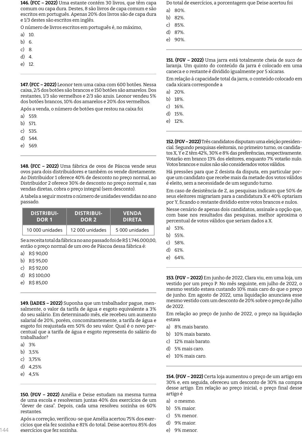 <p>144</p><p>146. (FCC – 2022) Uma estante contém 30 livros, que têm capa</p><p>comum ou capa dura. Destes, 8 são livros de capa comum e são</p><p>escritos em português. Apenas 20% dos livros são de capa dura</p><p>e 1/3 destes são escritos em inglês.</p><p>O número de livros escritos em português é, no máximo,</p><p>a) 10.</p><p>b) 6.</p><p>c) 8.</p><p>d) 4.</p><p>e) 12.</p><p>147. (FCC – 2022) Leonor tem uma caixa com 600 botões. Nessa</p><p>caixa, 2/5 dos botões são brancos e 150 botões são amarelos. Dos</p><p>restantes, 1/3 são vermelhos e 2/3 são azuis. Leonor vendeu 5%</p><p>dos botões brancos, 10% dos amarelos e 20% dos vermelhos.</p><p>Após a venda, o número de botões que restou na caixa foi</p><p>a) 559.</p><p>b) 571.</p><p>c) 535.</p><p>d) 544.</p><p>e) 569.</p><p>148. (FCC – 2022) Uma fábrica de ovos de Páscoa vende seus</p><p>ovos para dois distribuidores e também os vende diretamente.</p><p>Ao Distribuidor 1 oferece 40% de desconto no preço normal, ao</p><p>Distribuidor 2 oferece 30% de desconto no preço normal e, nas</p><p>vendas diretas, cobra o preço integral (sem desconto).</p><p>A tabela a seguir mostra o número de unidades vendidas no ano</p><p>passado.</p><p>DISTRIBUI-</p><p>DOR 1</p><p>DISTRIBUI-</p><p>DOR 2</p><p>VENDA</p><p>DIRETA</p><p>10 000 unidades 12 000 unidades 5 000 unidades</p><p>Se a receita total da fábrica no ano passado foi de R$ 1.746.000,00,</p><p>então o preço normal de um ovo de Páscoa dessa fábrica é:</p><p>a) R$ 90,00</p><p>b) R$ 95,00</p><p>c) R$ 92,00</p><p>d) R$ 100,00</p><p>e) R$ 85,00</p><p>149. (IADES – 2022) Suponha que um trabalhador pague, men-</p><p>salmente, o valor da tarifa de água e esgoto equivalente a 3%</p><p>do seu salário. Em determinado mês, ele recebeu um aumento</p><p>salarial de 20%, porém, concomitantemente, a tarifa de água e</p><p>esgoto foi reajustada em 50% do seu valor. Qual é o novo per-</p><p>centual que a tarifa de água e esgoto representa do salário do</p><p>trabalhador?</p><p>a) 3%</p><p>b) 3,5%</p><p>c) 3,75%</p><p>d) 4,25%</p><p>e) 4,5%</p><p>150. (FGV – 2022) Amélia e Deise estudam na mesma turma</p><p>de uma escola e resolveram juntas 40% dos exercícios de um</p><p>“dever de casa”. Depois, cada uma resolveu sozinha os 60%</p><p>restantes.</p><p>Após a correção, verificou-se que Amélia acertou 75% dos exer-</p><p>cícios que ela fez sozinha e 81% do total. Deise acertou 85% dos</p><p>exercícios que fez sozinha.</p><p>Do total de exercícios, a porcentagem que Deise acertou foi</p><p>a) 80%.</p><p>b) 82%.</p><p>c) 85%.</p><p>d) 87%.</p><p>e) 90%.</p><p>151. (FGV – 2022) Uma jarra está totalmente cheia de suco de</p><p>laranja. Um quinto do conteúdo da jarra é colocado em uma</p><p>caneca e o restante é dividido igualmente por 5 xícaras.</p><p>Em relação à capacidade total da jarra, o conteúdo colocado em</p><p>cada xícara corresponde a</p><p>a) 20%.</p><p>b) 18%.</p><p>c) 16%.</p><p>d) 15%.</p><p>e) 12%.</p><p>152. (FGV – 2022) Três candidatos disputam uma eleição presiden-</p><p>cial. Segundo pesquisas eleitorais, no primeiro turno, os candida-</p><p>tos X, Y e Z têm 42%, 30% e 8% das preferências, respectivamente.</p><p>Votarão em branco 13% dos eleitores, enquanto 7% votarão nulo.</p><p>Votos brancos e nulos não são considerados votos válidos.</p><p>Há pressões para que Z desista da disputa, em particular por-</p><p>que um candidato que recebe mais da metade dos votos válidos</p><p>é eleito, sem a necessidade de um segundo turno.</p><p>Em caso de desistência de Z, as pesquisas indicam que 50% de</p><p>seus eleitores migrariam para a candidatura X e 40% optariam</p><p>por Y, ficando o restante dividido entre votos brancos e nulos.</p><p>Nesse cenário de apenas dois candidatos, assinale a opção que,</p><p>com base nos resultados das pesquisas, melhor aproxima o</p><p>percentual de votos válidos que seriam dados a X.</p><p>a) 53%.</p><p>b) 55%.</p><p>c) 58%.</p><p>d) 61%.</p><p>e) 64%.</p><p>153. (FGV – 2022) Em junho de 2022, Clara viu, em uma loja, um</p><p>vestido por um preço P. No mês seguinte, em julho de 2022, o</p><p>mesmo vestido estava custando 10% mais caro do que o preço</p><p>de junho. Em agosto de 2022, uma liquidação anunciava esse</p><p>mesmo vestido com um desconto de 20% sobre o preço de julho</p><p>de 2022.</p><p>Em relação ao preço de junho de 2022, o preço na liquidação</p><p>estava</p><p>a) 8% mais barato.</p><p>b) 10% mais barato.</p><p>c) 12% mais barato.</p><p>d) 5% mais caro.</p><p>e) 10% mais caro.</p><p>154. (FGV – 2022) Certa loja aumentou o preço de um artigo em</p><p>30% e, em seguida, ofereceu um desconto de 30% na compra</p><p>desse artigo. Em relação ao preço inicial, o preço final desse</p><p>artigo é</p><p>a) o mesmo.</p><p>b) 5% maior.</p><p>c) 5% menor.</p><p>d) 9% maior.</p><p>e) 9% menor.</p><p>O conteúdo deste livro eletrônico é licenciado para Natalia Feijó Ribeiro - 096.457.457-80, vedada, por quaisquer meios e a qualquer título, a</p><p>sua reprodução, cópia, divulgação ou distribuição, sujeitando-se aos infratores à responsabilização civil e criminal.</p>