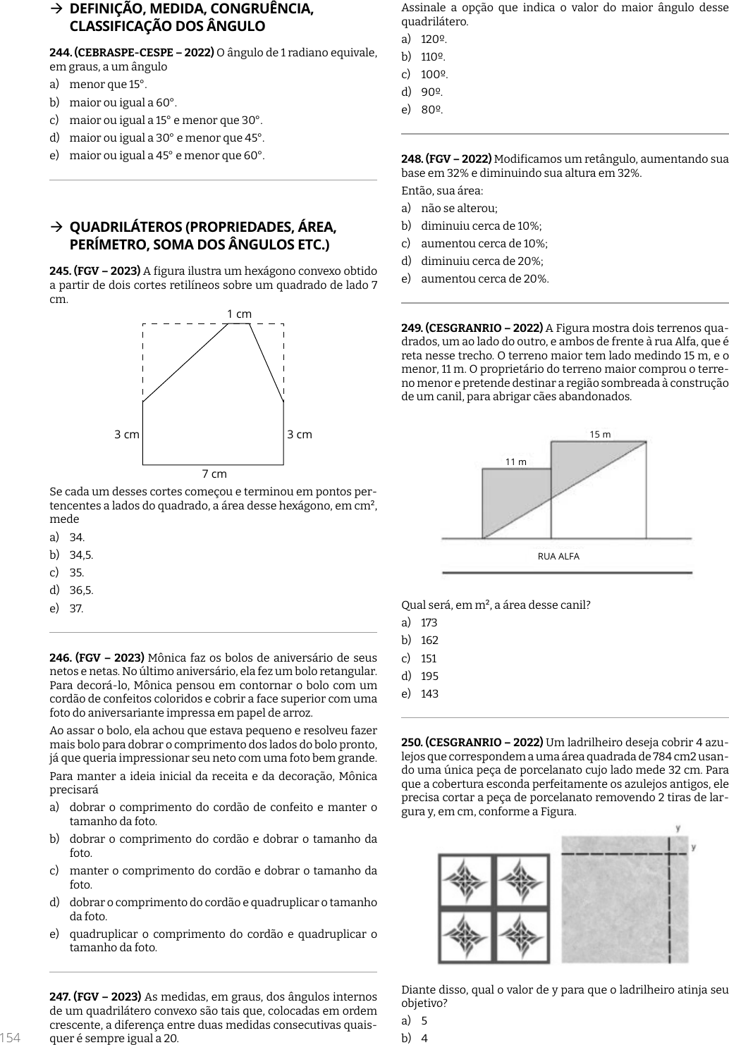 <p>154</p><p>Æ DEFINIÇÃO, MEDIDA, CONGRUÊNCIA,</p><p>CLASSIFICAÇÃO DOS ÂNGULO</p><p>244. (CEBRASPE-CESPE – 2022) O ângulo de 1 radiano equivale,</p><p>em graus, a um ângulo</p><p>a) menor que 15°.</p><p>b) maior ou igual a 60°.</p><p>c) maior ou igual a 15° e menor que 30°.</p><p>d) maior ou igual a 30° e menor que 45°.</p><p>e) maior ou igual a 45° e menor que 60°.</p><p>Æ QUADRILÁTEROS (PROPRIEDADES, ÁREA,</p><p>PERÍMETRO, SOMA DOS ÂNGULOS ETC.)</p><p>245. (FGV – 2023) A figura ilustra um hexágono convexo obtido</p><p>a partir de dois cortes retilíneos sobre um quadrado de lado 7</p><p>cm.</p><p>3 cm 3 cm</p><p>1 cm</p><p>7 cm</p><p>Se cada um desses cortes começou e terminou em pontos per-</p><p>tencentes a lados do quadrado, a área desse hexágono, em cm²,</p><p>mede</p><p>a) 34.</p><p>b) 34,5.</p><p>c) 35.</p><p>d) 36,5.</p><p>e) 37.</p><p>246. (FGV – 2023) Mônica faz os bolos de aniversário de seus</p><p>netos e netas. No último aniversário, ela fez um bolo retangular.</p><p>Para decorá-lo, Mônica pensou em contornar o bolo com um</p><p>cordão de confeitos coloridos e cobrir a face superior com uma</p><p>foto do aniversariante impressa em papel de arroz.</p><p>Ao assar o bolo, ela achou que estava pequeno e resolveu fazer</p><p>mais bolo para dobrar o comprimento dos lados do bolo pronto,</p><p>já que queria impressionar seu neto com uma foto bem grande.</p><p>Para manter a ideia inicial da receita e da decoração, Mônica</p><p>precisará</p><p>a) dobrar o comprimento do cordão de confeito e manter o</p><p>tamanho da foto.</p><p>b) dobrar o comprimento do cordão e dobrar o tamanho da</p><p>foto.</p><p>c) manter o comprimento do cordão e dobrar o tamanho da</p><p>foto.</p><p>d) dobrar o comprimento do cordão e quadruplicar o tamanho</p><p>da foto.</p><p>e) quadruplicar o comprimento do cordão e quadruplicar o</p><p>tamanho da foto.</p><p>247. (FGV – 2023) As medidas, em graus, dos ângulos internos</p><p>de um quadrilátero convexo são tais que, colocadas em ordem</p><p>crescente, a diferença entre duas medidas consecutivas quais-</p><p>quer é sempre igual a 20.</p><p>Assinale a opção que indica o valor do maior ângulo desse</p><p>quadrilátero.</p><p>a) 120º.</p><p>b) 110º.</p><p>c) 100º.</p><p>d) 90º.</p><p>e) 80º.</p><p>248. (FGV – 2022) Modificamos um retângulo, aumentando sua</p><p>base em 32% e diminuindo sua altura em 32%.</p><p>Então, sua área:</p><p>a) não se alterou;</p><p>b) diminuiu cerca de 10%;</p><p>c) aumentou cerca de 10%;</p><p>d) diminuiu cerca de 20%;</p><p>e) aumentou cerca de 20%.</p><p>249. (CESGRANRIO – 2022) A Figura mostra dois terrenos qua-</p><p>drados, um ao lado do outro, e ambos de frente à rua Alfa, que é</p><p>reta nesse trecho. O terreno maior tem lado medindo 15 m, e o</p><p>menor, 11 m. O proprietário do terreno maior comprou o terre-</p><p>no menor e pretende destinar a região sombreada à construção</p><p>de um canil, para abrigar cães abandonados.</p><p>11 m</p><p>RUA ALFA</p><p>15 m</p><p>Qual será, em m², a área desse canil?</p><p>a) 173</p><p>b) 162</p><p>c) 151</p><p>d) 195</p><p>e) 143</p><p>250. (CESGRANRIO – 2022) Um ladrilheiro deseja cobrir 4 azu-</p><p>lejos que correspondem a uma área quadrada de 784 cm2 usan-</p><p>do uma única peça de porcelanato cujo lado mede 32 cm. Para</p><p>que a cobertura esconda perfeitamente os azulejos antigos, ele</p><p>precisa cortar a peça de porcelanato removendo 2 tiras de lar-</p><p>gura y, em cm, conforme a Figura.</p><p>Diante disso, qual o valor de y para que o ladrilheiro atinja seu</p><p>objetivo?</p><p>a) 5</p><p>b) 4</p><p>O conteúdo deste livro eletrônico é licenciado para Natalia Feijó Ribeiro - 096.457.457-80, vedada, por quaisquer meios e a qualquer título, a</p><p>sua reprodução, cópia, divulgação ou distribuição, sujeitando-se aos infratores à responsabilização civil e criminal.</p>