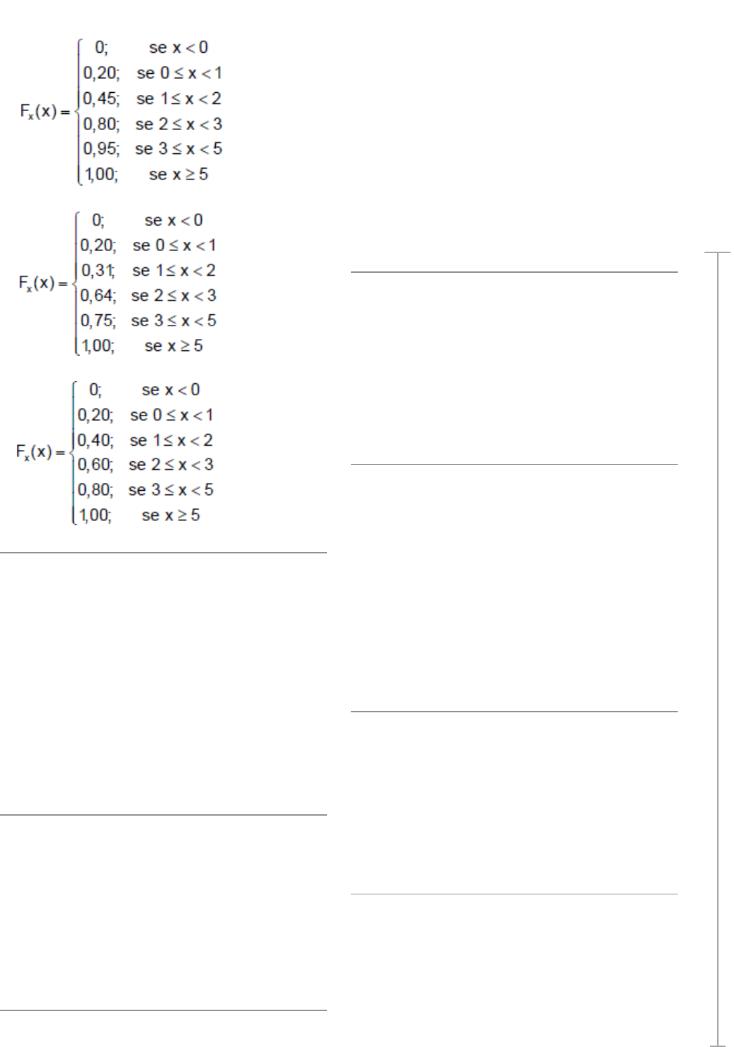 <p>PR</p><p>O</p><p>BA</p><p>BI</p><p>LI</p><p>D</p><p>A</p><p>D</p><p>E</p><p>E</p><p>ES</p><p>TA</p><p>TÍ</p><p>ST</p><p>IC</p><p>A</p><p>125</p><p>c)</p><p>d)</p><p>e)</p><p>Æ ESPERANÇA, MODA E QUANTIS DE VARIÁVEIS</p><p>DISCRETAS</p><p>36. (CESGRANRIO – 2018) Uma pessoa prefere ganhar R$ 100,00</p><p>com probabilidade de 100%, um evento certo, em vez de parti-</p><p>cipar de um sorteio com probabilidade x de ganhar R$ 200,00</p><p>e (1-x)de nada ganhar. Deduz-se que a pessoa é avessa ao risco</p><p>se x for igual a:</p><p>a) 55%</p><p>b) 45%</p><p>c) 35%</p><p>d) 25%</p><p>e) 15%</p><p>37. (CESGRANRIO – 2018) Os jogadores X e Y lançam um dado</p><p>honesto, com seis faces numeradas de 1 a 6, e observa-se a face</p><p>superior do dado. O jogador X lança o dado 50 vezes, e o jogador</p><p>Y, 51 vezes. A probabilidade de que o jogador Y obtenha mais</p><p>faces com números ímpares do que o jogador X, é:</p><p>a) 1</p><p>b) 3/4</p><p>c) 1/4</p><p>d) 1/2</p><p>e) 1/6</p><p>Æ COVARIÂNCIA; MATRIZ DE VARIÂNCIAS E</p><p>COVARIÂNCIAS. VARIÂNCIA DA SOMA E DA</p><p>DIFERENÇA</p><p>38. (CESGRANRIO – 2018) As variáveis aleatórias X e Y são inde-</p><p>pendentes. A variável X segue uma distribuição Normal com</p><p>média 4 e variância 16, e a Y segue uma distribuição Normal</p><p>com média 9 e variância 1. A distribuição de X - Y é Normal</p><p>com</p><p>a) média -5 e variância 15</p><p>b) média -5 e variância 17</p><p>c) média 5 e variância 15</p><p>d) média 5 e variância 17</p><p>e) média 13 e variância 15</p><p>39. (CESGRANRIO – 2015) Considere as informações a seguir</p><p>para responder à questão. As variáveis aleatórias X e Y têm</p><p>variâncias iguais, equivalentes a 0,75. A covariância entre X e</p><p>Y é igual a 0,75. A covariância entre as variáveis aleatórias X e</p><p>4X-2Y é</p><p>a) 4,5</p><p>b) 3,0</p><p>c) 1,50</p><p>d) 0,75</p><p>e) 0</p><p>40. (CESGRANRIO – 2013) Considere que as notas das matérias</p><p>de Matemática, Física e Português de alunos de uma mes-</p><p>ma sala de aula sigam distribuições normais. As variâncias</p><p>das notas são, respectivamente, 3,0, 6,0 e 7,5. Por outro lado, a</p><p>variância das notas de Matemática e Física somadas é 11,0 e a</p><p>variância das notas de Matemática e Português somadas é 10,5.</p><p>O que esses resultados indicam?</p><p>a) Notas de Matemática e notas de Física são independentes.</p><p>b) Notas de Matemática e notas de Português são</p><p>independentes.</p><p>c) As notas de Física são mais altas que as notas de Português.</p><p>d) As notas de Física são o dobro das de Matemática.</p><p>e) As notas de Matemática e Física somadas são mais altas que</p><p>as notas de Matemática e Português somadas.</p><p>41. (CESGRANRIO – 2012) Sejam X e Y variáveis aleatórias inde-</p><p>pendentes. Sabendo-se que:</p><p>E (X) = 2; E(X²Y) = 8; E(XY²) = 6 e E ((XY)²) = 24, conclui-se que o</p><p>valor da variância de Y, Var (Y), é</p><p>a) 48</p><p>b) 24</p><p>c) 10</p><p>d) 3</p><p>e) 2</p><p>Æ CORRELAÇÃO LINEAR ENTRE VARIÁVEIS</p><p>ALEATÓRIAS</p><p>42. (CESGRANRIO – 2014) As variáveis Y e X são relacionadas</p><p>deterministicamente segundo a expressão matemática Y = 0.6</p><p>X. Uma pessoa escolhe vinte valores diferentes para X e calcula</p><p>os Y correspondentes pela expressão Y = 0.6X. O coeficiente de</p><p>correlação entre os valores de X e os correspondentes valores</p><p>de Y é igual a</p>