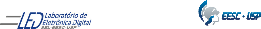 1 Departamento de Engenharia Elétrica e de Computação SEL 384 – Laboratório de Sistemas Digitais I Profa. Luiza Maria Romeiro Codá PRÁTICA Nº 4: “Circuitos combinacionais: somador completo e decodificador BCD para 7 segmentos” 1. Objetivos: • Verificar o funcionamento de circuito aritmético, somador completo de 4 bits. • Aprender a ligar decodificador a display de 7 segmentos • Aplicação de circuito coletor aberto. 2. Lista de material: � CIs: 7483, 7446 (qualquer tecnologia) � Display Anodo Comum, A-551X ou A-561X � Resistores 330 Ω ou 270 Ω � Painel lógico � Voltímetro. Observação: informações sobre os CIs se encontram na pasta Componentes 3. Procedimento Experimental: 3.1 Decodificação para “display” de 7 segmentos: 3.1.1 Calcule o valor do resistor do circuito de acionamento do segmento do display, circuito da Figura 1a, sabendo-se que é um display anodo comum, e que cada segmento do “display” é composto de 1 diodo de GaAsP ou GaP e que a queda de tensão em cada segmento é de 2,1V e a corrente de 9 mA (ver pasta componentes). 3.1.2 Utilizando o resistor calculado, Mapeie o display para descobrir qual pino equivale a qual segmento do display, e anote nas Figuras 5a e 5b da Folha de Respostas o nome destes segmentos e os pinos correspondentes. 2 Figura 1 a. Circuito elétrico equivalente do segmento do display. b. Pinos do display de 7 sgmentos. 3.1.3 No protoboard, de acordo com a Figura 2, utilizando CI 7446 ou 7447(VIDE O 7448.PDF na pasta Componentes/TTL), o qual é um decodificador BCD para 7 segmentos, ligue-o corretamente ao display (anodo comum), mostrado na Figura 1 Figura 2 Esquema em blocos do circuito Decodificador BCD para 7 segmentos ligado ao display. Observação: 1. essa figura não está com a pinagem correta do display 2. NÃO DESMONTE ESSE CIRCUITO PARA USÁ-LO NO ÍTEM 3.2. 3.1.4 Anote na Folha de Respostas quais os níveis lógicos das entradas de controle ( LT , RBO/BI , RBI ) do decodificador BCD/7 segmentos devem ter para que as entradas BCD sejam apresentadas no display. 3 3.1.5 Responda na Folha de Respostas: (a) Qual a função do controle LT ? Qual aplicação que este controle pode oferecer em um circuito com display quando liga-se o mesmo no nível ‘0’?Verifique no protoboard. (b) Qual a função do controle RBO/BI ? Qual aplicação que este controle pode oferecer em um circuito com display quando liga-se o mesmo no nível ‘0’?Verifique no protoboard. (c) Qual a função do controle RBI ? Qual aplicação que este controle pode oferecer em um circuito com display quando liga-se o mesmo no nível ‘0’?Verifique no protoboard 3.1.6 Verifique quais os símbolos que aparecem no display quando as entradas do decodificador variam de (0000b) a (1111b). 3.2 Somador Completo de 4 bits: Figura 3 Somador completo de 8 bits A Figura 3 mostra a configuração dos pinos do somador binário completo 7483 série LS, que soma 2 palavras de 4 bits (A4, A3, A2, A1) com (B4, B3, B2, B1), onde A1 e B1 são os LSBs e A4 e B4 são os MSBs, C0 é o Carry inicial e C4 é o carry final. A soma é feita da seguinte maneira: + ( A4 A3 A2 A1 ) B4 B3 B2 B1 + C0 C4 ∑4 ∑3 ∑2 ∑1 4 O somador 7483 apresenta os seguintes sinais de entrada e saída: pino Sinal Entrada Saída Descrição 10 A1 E Entrada (Bit menos significativo) 11 B1 E Entrada (Bit menos significativo) 13 C0 E Carry de entrada 8 A2 E entrada 7 B2 E entrada 3 A3 E entrada 4 B3 E entrada 1 A4 E Entrada (Bit mais significativo) 16 B4 E Entrada (Bit mais significativo) 9 ∑ 1 E Soma (Bit menos significativo) 6 ∑ 2 S Soma 2 ∑ 3 S Soma 15 ∑ 4 S Soma (Bit mais significativo) 14 C4 S Carry de saída 3.2.1 Ligue as entradas Ai e Bi em sequencia nas chaves do painel de montagem Datapool (chaves de A a H), ou seja, ligar a entrada A1 na chave A do painel, a entrada A2 na chave B do painel, e assim por diante. Portanto a entrada B1 será ligada à chave E, e assim sucessivamente. Ligue a entrada carry C0 na chave J do painel de montagem Datapool. As saídas ∑i nas entradas do decodificador do item 3.1 (Figura 2), da seguinte maneira ∑4 ∑3 ∑2 ∑1 nas entradas D C B A , respectivamente do decodificador 7446. E C4 no ponto decimal através de um resistor, o mesmo calculado no item 3.1.1. 3.2.2 Determine os valores da saída do display de acordo com as entradas dadas na Tabela 1 na folha de resposta e complete a Tabela 1. 4. Bibliografia: • Roteiro de Teoria e Prática do Módulo Digital Avançado 8810 DATAPOOL. • Fregni, E. & Saraiva, A.M., “ Engenharia do Projeto Lógico Digital”, Ed. Edgard Blücher Ltda. • Bignell,J. W.& Donovan, R. L.” Eletrônica Digital-Lógica Combinacional”. Ed Makron Books 5 Departamento de Engenharia Elétrica e de Computação SEL 384 – Laboratório de Sistemas Digitais I Profa. Luiza Maria R. Codá FOLHA DE RESPOSTAS : PRÁTICA nº 4 “Circuitos combinacionais: somador completo e decodificador BCD para 7 segmentos” TURMA: DATA: NOMES: Nº USP 3.1.1 Cálculo de R: 3.1.2 (a) (b) Figura 5 NOTA: Valor de R= Ω 6 3.1.4 Controles Nível Lógico LT RBO/BI RBI 3.1.5 (a) Qual a função do controle LT ”? (b) ) Qual a função do controle RBO/BI ? (c) Qual a função do controle RBI ? 3.1.6 Anote os símbolos que aparecem no display e os valores das entradas BCD: 7 3.2.2 Tabela 1 ENTRADAS SAÍDAS (binário) SAÍDA do Display C0 Ai Bi C4 ∑3 ∑2 ∑1 ∑0 0 0 0 0 6 3 0 7 8 0 15 15 1 0 0 1 6 3 1 7 8 1 15 15