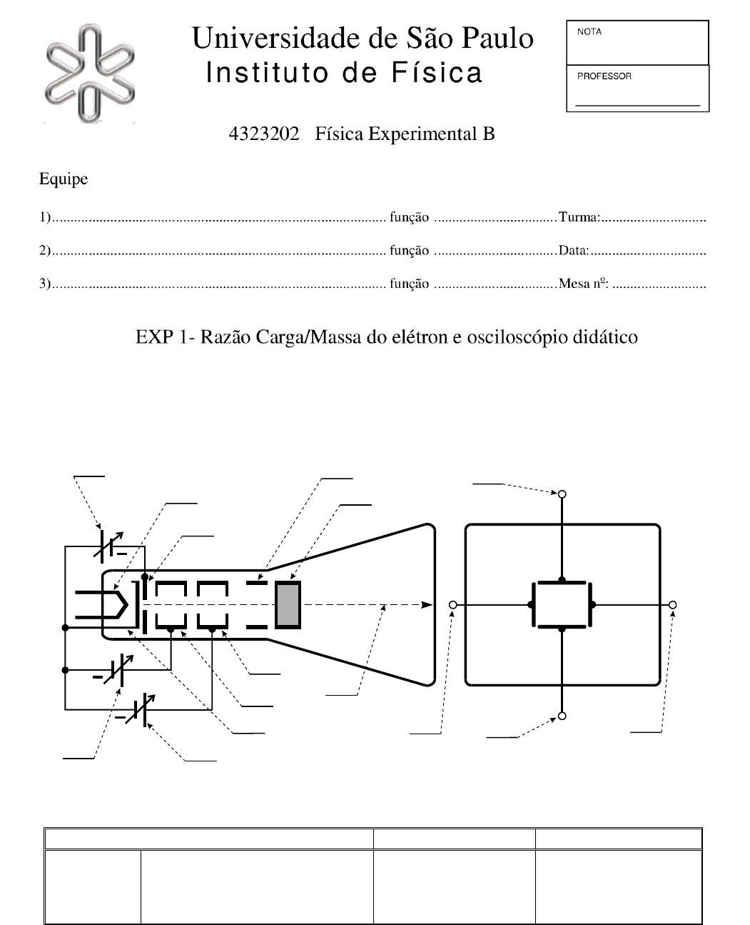 <p>4320303 - 2</p><p>o</p><p>semestre/2015 1</p><p>1</p><p>a</p><p>Parte) FUNCIONAMENTO DO TUBO DE RAIOS CATÓDICOS (TRC)</p><p>Componente Controle Terminal</p><p>FF filamento</p><p>KK catodo</p><p>AA11 anodo 1</p><p>AA22 anodo 2</p><p>DDVV placas de deflexão vertical</p><p>DDHH placas de deflexão horizontal</p><p>EELL feixe de elétrons</p><p>GGCC grade de controle</p><p>II intensidade</p><p>FFOO foco</p><p>AA tensão de aceleração</p><p>DDVV deflexão vertical</p><p>DDHH deflexão horizontal</p><p>+</p><p>+</p><p>+</p><p>V</p><p>2</p><p>Identifique, pelas iniciais abaixo, componentes, controles e terminais indicados pelas linhas pontilhadas.</p><p>4320303 - 2</p><p>o</p><p>semestre/2015 2</p><p>2</p><p>a</p><p>Parte) ELEMENTOS DO PAINEL</p><p>3</p><p>a</p><p>Parte) PARA LIGAR O OSCILOSCÓPIO DIDÁTICO, REGULAR E</p><p>CENTRAR O PONTO LUMINOSO</p><p> Antes de ligar o osciloscópio coloque o potenciômetro da tensão de aceleração V2 no</p><p>mínimo, isto é, totalmente virado no sentido anti-horário.</p><p> Verifique se os terminais DV e os terminais DH estão todos ligados no terminal Terra.</p><p>Desta forma, todas as placas estarão no mesmo potencial de Terra e, portanto, o feixe</p><p>eletrônico deverá aparecer exatamente no centro da tela, como um ponto luminoso.</p><p> Ligue o osciloscópico e ajuste a tensão de aceleração V2 para 800 V. Os terminais para a</p><p>medida desta tensão estão localizados no painel traseiro do aparelho e um voltímetro deve</p><p>estar já conectado para a leitura da mesma. Atenção: o fundo de escala do voltímetro é de</p><p>1200 V.</p><p> Ajuste a intensidade e o foco do feixe eletrônico de forma a minimizar o ponto luminoso,</p><p>porém, suficiente para que este ponto seja observado confortavelmente. Um ponto</p><p>luminoso muito forte poderá queimar o material luminescente da tela, principalmente se</p><p>ele permanecer imóvel por muito tempo.</p><p> Se o ponto luminoso não estiver exatamente no centro da tela, isto pode se dever ao efeito</p><p>do campo magnético local que desvia o feixe eletrônico. Para corrigir utilize um dos ímãs</p><p>fornecidos (o que estiver sem numeração) para centralizar o feixe na tela, fixando o ímã</p><p>no painel traseiro com fita crepe numa posição que deve ser encontrada por tentativa.</p><p>Cuidado para não esbarrar no terminal da tensão de aceleração existente neste painel, bem</p><p>como na sua fiação para não levar choque elétrico.</p><p>4</p><p>a</p><p>. Parte) INTERAÇÃO DO FEIXE ELETRÔNICO COM O CAMPO</p><p>MAGNÉTICO DE UM ÍMÃ</p><p>Coloque o ímã n</p><p>o</p><p>____________ em cada uma das 2 posições das figuras indicadas na</p><p>próxima página:</p><p>- marque com um X a face colorida do ímã em cada posição</p><p>- marque com uma seta ( ) o sentido de deslocamento do ponto luminoso.</p><p>- Faça o diagrama vetorial ( BvF</p><p>m</p><p></p><p>,, ) correspondente (veja abaixo):</p><p>X</p><p>X</p><p>X</p><p>X</p><p>Terminal Controle</p><p>DDVV deflexão vertical</p><p>DDHH deflexão horizontal</p><p>DDCC fonte DC</p><p>AACC fonte AC</p><p>TT terra</p><p>II intensidade</p><p>FFOO foco</p><p>RR regulagem da fonte DC</p><p>AA tensão de aceleração</p><p>Identifique no painel ao lado pelas iniciais:</p><p>4320303 - 2</p><p>o</p><p>semestre/2015 3</p><p>Qual é o polo (norte ou sul) da face colorida do ímã? ____________. Justifique desenhando</p><p>nas próprias figuras o sentido das linhas de campo do ímã</p><p>linhas de campo de um imã:</p><p>Bv produto vetorial</p><p>B</p><p>v e a força magnética em uma carga elétrica q: BvqF</p><p>m</p><p>5</p><p>a</p><p>Parte) MEDIDA DA SENSIBILIDADE DO TRC (DEFLEXÃO VERTICAL)</p><p>1. Desaterre a placa DV superior e ligue-a, através de um cabo, ao terminal da fonte DC</p><p>(consulte a 2ª parte deste guia, Elementos do Painel). Verifique que o ponto luminoso</p><p>percorre verticalmente na tela, quando varia o potenciômetro da fonte DC.</p><p>2. Ligue um voltímetro entre a placa superior e a inferior para medir a tensão entre as placas.</p><p>Varie o deslocamento do ponto luminoso H em relação ao centro da tela, preenchendo a</p><p>tabela abaixo (1 quadrado da tela = 1cm):</p><p>H (cm) -4 -3 -2 -1 0 1 2 3 4</p><p>V (volts)</p><p>Porque o ponto luminoso subiu quando a tensão era positiva e desceu quando a tensão era</p><p>negativa?___________________________________________________________________</p><p>___________________________________________________________________________</p><p>___________________________________________________________________________</p><p>4320303 - 2</p><p>o</p><p>semestre/2015 4</p><p>3. Anote o valor da tensão de aceleração: V2= ____________ _____ volts</p><p>As dimensões do TRC estão anotadas em um papel fixado na sala experimental. Procure e</p><p>anote:</p><p>Largura da placa de deflexão vertical: = ___________ ___________ _____</p><p>Separação entre as placas: d= ____________ ___________ _____</p><p>Distância entre a placa e a tela: L= ____________ ___________ _____</p><p>4. REGRESSÃO LINEAR: Vamos montar um gráfico do deslocamento H em função da</p><p>tensão de deflexão aplicada V, usando os dados na tabela acima.</p><p>- Entre no programa Origin41 instalado no microcomputador;</p><p>- Digite os dados indicados nas linhas de H e de V da tabela acima;</p><p>- Monte o gráfico de H em função de V;</p><p>- Ajuste os pontos mostrados no gráfico com uma reta linear Y = A + B*X. Anote abaixo os</p><p>valores do parâmetro A, do B e os respectivos erros:</p><p>A = ____________ ________, erro = ____________ ________</p><p>B = ____________ ________, erro = ____________ ________</p><p>- Digitando a legenda e a unidade de cada eixo (X, Y) do gráfico e os nomes de todos os</p><p>colegas da equipe, mande imprimir esse gráfico uma vez e anexe-o ao guia;</p><p>- Saia do programa Origin41 sem salvar nenhum dado.</p><p>A inclinação da reta ajustada corresponde à