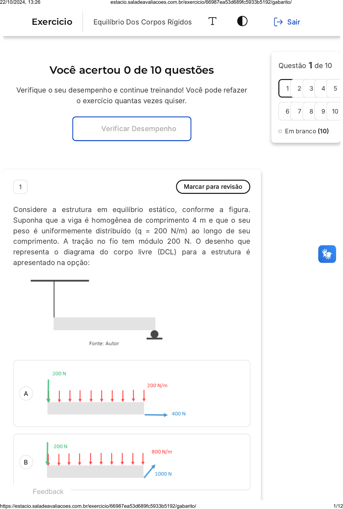 <p>Você acertou 0 de 10 questões</p><p>Verifique o seu desempenho e continue treinando! Você pode refazer</p><p>o exercício quantas vezes quiser.</p><p>Verificar Desempenho</p><p>A</p><p>B</p><p>1 Marcar para revisão</p><p>Considere a estrutura em equilíbrio estático, conforme a figura.</p><p>Suponha que a viga é homogênea de comprimento 4 m e que o seu</p><p>peso é uniformemente distribuído (q = 200 N/m) ao longo de seu</p><p>comprimento. A tração no fio tem módulo 200 N. O desenho que</p><p>representa o diagrama do corpo livre �DCL) para a estrutura é</p><p>apresentado na opção:</p><p>Questão 1 de 10</p><p>Em branco �10�</p><p>1 2 3 4 5</p><p>6 7 8 9 10</p><p>Feedback</p><p>Exercicio Equilíbrio Dos Corpos Rígidos Sair</p><p>22/10/2024, 13:26 estacio.saladeavaliacoes.com.br/exercicio/66987ea53d689fc5933b5192/gabarito/</p><p>https://estacio.saladeavaliacoes.com.br/exercicio/66987ea53d689fc5933b5192/gabarito/ 1/12</p><p>C</p><p>D</p><p>E</p><p>Questão não respondida</p><p>Opa! A alternativa correta é a letra C. Confira o gabarito</p><p>comentado!</p><p>Gabarito Comentado</p><p>2 Marcar para revisão</p><p>Quando a força e o vetor posição são coplanares, é possível calcular o</p><p>momento resultante em relação a um ponto no plano onde a força é</p><p>aplicada. Nesse caso, a relação entre a força resultante e o momento</p><p>resultante é importante para entender a estabilidade e o movimento da</p><p>22/10/2024, 13:26 estacio.saladeavaliacoes.com.br/exercicio/66987ea53d689fc5933b5192/gabarito/</p><p>https://estacio.saladeavaliacoes.com.br/exercicio/66987ea53d689fc5933b5192/gabarito/ 2/12</p><p>A</p><p>B</p><p>C</p><p>D</p><p>E</p><p>estrutura. Qual é a relação entre a força resultante e o momento</p><p>resultante quando a força e o vetor posição são coplanares?</p><p>São iguais em módulo, direção e sentido.</p><p>São opostos em módulo, direção e sentido.</p><p>São perpendiculares entre si.</p><p>Não há relação entre eles.</p><p>Depende das características específicas da estrutura.</p><p>Questão não respondida</p><p>Opa! A alternativa correta é a letra B. Confira o gabarito</p><p>comentado!</p><p>Gabarito Comentado</p><p>Quando a força e o vetor posição são coplanares, o momento</p><p>resultante em relação a um ponto no plano é dado pelo produto</p><p>vetorial entre o vetor posição e a força. Nesse caso, o momento</p><p>resultante é perpendicular ao plano definido pela força e o vetor</p><p>posição, e possui módulo igual ao produto do módulo da força</p><p>pelo comprimento do braço de alavanca. Como o momento</p><p>resultante é perpendicular à força resultante, eles são opostos em</p><p>módulo, direção e sentido.</p><p>3 Marcar para revisão</p><p>Fonte: Autor</p><p>22/10/2024, 13:26 estacio.saladeavaliacoes.com.br/exercicio/66987ea53d689fc5933b5192/gabarito/</p><p>https://estacio.saladeavaliacoes.com.br/exercicio/66987ea53d689fc5933b5192/gabarito/ 3/12</p><p>A</p><p>B</p><p>C</p><p>D</p><p>E</p><p>A viga bi apoiada mostrada na figura está sob ação de uma força F de</p><p>módulo 200 N aplicada conforme indicado. A condição de equilíbrio</p><p>estático da viga estabelece que a reação em:</p><p>B é paralela a BN e possui sentido de B para N. Sua</p><p>intensidade é maior que 200 N.</p><p>B é paralela a BN e possui sentido de N para B. Sua</p><p>intensidade é igual a 200 N.</p><p>B é paralela a BM e possui sentido de M para B. Sua</p><p>intensidade é igual a 200 N.</p><p>A é paralela a AN e possui sentido de A para N. Sua</p><p>intensidade é menor que 200 N.</p><p>A é paralela a AM e possui sentido de A para M. Sua</p><p>intensidade é menor que 200 N.</p><p>Questão não respondida</p><p>Opa! A alternativa correta é a letra E. Confira o gabarito</p><p>comentado!</p><p>Gabarito Comentado</p><p>A resposta correta é: A é paralela a AM e possui sentido de A para</p><p>M. Sua intensidade é menor que 200 N.</p><p>A reação em A será menor que 200N, visto que a foça de 200N é</p><p>decomposta em X e Y, sendo as componente Fy = RAy + RBy. E a</p><p>reção RA será paralela a AM com sentido de A para M.</p><p>4 Marcar para revisão</p><p>Uma viga bi apoiada está sujeita às cargas F1 e F2 com módulos 2000</p><p>N e equidistantes dos apoios A e B, conforme mostrado na figura</p><p>abaixo. A força F1 forma 300 com a horizontal.</p><p>22/10/2024, 13:26 estacio.saladeavaliacoes.com.br/exercicio/66987ea53d689fc5933b5192/gabarito/</p><p>https://estacio.saladeavaliacoes.com.br/exercicio/66987ea53d689fc5933b5192/gabarito/ 4/12</p><p>A</p><p>B</p><p>C</p><p>D</p><p>E</p><p>As reações nos apoios A e B são tais, que o apoio A reage:</p><p>apenas com uma força vertical, e o apoio B, com uma força</p><p>vertical e outra horizontal, sendo o módulo da reação</p><p>horizontal em B igual a 1732 N.</p><p>apenas com uma força vertical, e o apoio B, com uma força</p><p>vertical e um momento, sendo ambas forças verticais de</p><p>módulo 1000 N.</p><p>com uma força vertical e outra horizontal, e o apoio B, apenas</p><p>com uma força vertical sendo ambas forças verticais de</p><p>módulo 750 N.</p><p>com uma força vertical, e um momento, e o apoio B, apenas</p><p>com uma força vertical, sendo ambas forças verticais de</p><p>módulo 1000 N.</p><p>com uma força vertical e um momento, e o apoio B, apenas</p><p>com um momento, sendo ambos momentos com módulo 1732</p><p>N.m.</p><p>Questão não respondida</p><p>Opa! A alternativa correta é a letra A. Confira o gabarito</p><p>comentado!</p><p>Gabarito Comentado</p><p>A resposta correta é: apenas com uma força vertical, e o apoio B,</p><p>com uma força vertical e outra horizontal, sendo o módulo da</p><p>reação horizontal em B igual a 1732 N.</p><p>Reações de apoio:</p><p>R , R e R</p><p>Somatório de forças em X� R - F1.cos30° = 0</p><p>R = 2000.cos30° = 1732N.</p><p>AY BX BY</p><p>BX</p><p>BX</p><p>22/10/2024, 13:26 estaci