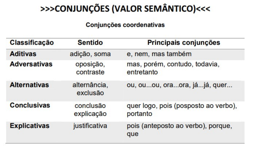 <p>1. Determine o valor semântico das conjunções: adição, oposição, escolha, conclusão,</p><p>explicação.</p><p>a) Não só conversa como também atrapalha os colegas. - ADIÇÃO</p><p>b) Faça estes exercícios, pois fazem parte da matéria da prova. - EXPLICAÇÃO - OK</p><p>c) O sol demorou a surgir, por isso fomos à praia mais tarde. – CONCLUSÃO - OK</p><p>d) Eram ideias interessantes, porém ninguém concordou com elas. – OPOSIÇÃO - OK</p><p>e) Não cumpriu sua promessa; ficamos, portanto, desapontados com sua atitude. -</p><p>CONCLUSÃO – OK</p><p>f) Não veio nem telefonou; deve, pois, ter acontecido alguma coisa. – ADIÇÃO - OK</p><p>g) Não só estuda, mas também trabalha para ajudar os pais. – ADIÇÃO - OK</p><p>h) Cresceu bastante e, finalmente, chegou à altura ideal. – ADIÇÃO</p><p>i) Ora lê, ora estuda, ora descansa. - ESCOLHA</p><p>j) Escolha: ou faça o que eu mando ou vá embora. – ESCOLHA</p><p>2- Reescreva as orações abaixo, substituindo as conjunções ou locuções conjuntivas em negrito</p><p>por outras de igual valor semântico.</p><p>a- A tecnologia deve ser usada para que possamos progredir.</p><p>b- A tecnologia deve ser usada a fim de que possamos progredir.</p><p>c- O site funciona como um clube privê.</p><p>d- O site funciona assim como um clube privê.</p><p>e- Quando adere à comunidade, cada um constrói uma página pessoal.</p><p>f- Assim que adere à comunidade, cada um constrói uma página pessoal.</p><p>g- Como o sistema coloca o usuário sob constante avaliação dos demais, o cadastrado é</p><p>praticamente impedido.</p><p>h- Visto que o sistema coloca o usuário sob constante avaliação dos demais, o cadastrado</p><p>é praticamente impedido.</p><p>i- Desde que aceitou aquele convite, suas amizades nunca mais foram as mesmas.</p><p>j- Assim que aceitou aquele convite, suas amizades nunca mais foram as mesmas.</p><p>k- Bisbilhotar é uma das atividades preferidas, já que todo mundo pode conferir a</p><p>performance de todos.</p><p>l- Bisbilhotar é uma das atividades preferidas, porque todo mundo pode conferir a</p><p>performance de todos.</p><p>3- “O Orkut está tão difundido que a maioria dos internautas já conhece seu funcionamento.”</p><p>Em que oração se encontra a causa do fato mencionado?</p><p>4- “A maioria dos internautas já conhece seu funcionamento, porque o Orkut já está muito</p><p>difundido.” Em que oração se encontra a conseqüência do fato mencionado?</p><p>5- Indique o valor semântico das conjunções nas orações.</p><p>a- Como está muito difundido, todos já conhecem o funcionamento do Orkut.</p><p>b- O site funciona como um clube prive.</p><p>c- Como foi publicado pelos jornais, o Orkut já é conhecido pela maioria dos internautas.</p><p>d- Que insistam, eu não participarei desse concurso.</p><p>e- Que saiam, nem mesmo assim sairei.</p><p>f-O professor fez um gesto que o menino se sentasse.</p><p>6 - Junte os períodos, utilizando conjunções coordenativas adequadas; faça as modificações</p><p>necessárias.</p><p>a. Elas chegaram tarde. Não puderam assistir à palestra.</p><p>b. Algumas pessoas chegaram cedo. Não conseguiram bons lugares no auditório.</p><p>c. Maurício sempre foi aluno brilhante. Será aprovado nos exames vestibulares.</p><p>d. Não faça barulho depois das dez horas da noite. Os vizinhos poderão reclamar de você.</p><p>e. As crianças brincavam. As crianças estudavam</p><p>f. Cheguei cedo ao escritório. Comecei a trabalhar logo.</p><p>g. Não seja irresponsável. As consequências podem ser graves.</p><p>h. Você deve fazer sua escolha agora. Você poderá perder a oportunidade.</p><p>i. O céu estava azul e sem nuvens. À tarde caiu um temporal.</p><p>j. Sempre fomos grandes amigos. Eu o conheço muito bem.</p><p>1. Assinale a opção em que a troca do termo extraído do trecho abaixo pela forma colocada</p><p>entre parênteses implicaria sensível alteração de sentido: “Uma observação mais cuidadosa</p><p>revela, porém (A), que Ciência e Tecnologia não se comportam como (B) mercadorias, mas (C)</p><p>como bens culturais: é por isso, talvez, que toda tentativa de transferência de tecnologia</p><p>fracassa e resulta no (D) que não passa de alguma (E) forma efêmera de prestação de serviço.”</p><p>a) “porém” / (portanto);</p><p>b) “como” / (do mesmo modo que);</p><p>c) “mas” / (e sim);</p><p>d) “no” / (naquilo);</p><p>e) “alguma” / (uma).</p><p>2. “O destino do réu depende do juiz. O processo está com o juiz”. Utilizando-se um só período</p><p>para reconstruir o que está sendo afirmado, teremos:</p><p>a) o processo está com o juiz, embora o réu dependa do seu destino;</p><p>b) o processo está com o juiz, de quem depende o destino do réu;</p><p>c) o processo está com o juiz, cujo réu depende do seu destino;</p><p>d) o processo está com o juiz, a quem depende o destino do réu;</p><p>e) o processo está com o juiz, que dependa o destino do réu.</p><p>3. Assinale o período em que ocorre a mesma relação significativa existente entre os termos</p><p>grifados em: “a atividade científica é tão importante quanto qualquer outra atividade</p><p>econômica”:</p><p>a) o rapaz era tão aplicado, que em pouco tempo foi promovido;</p><p>b) quanto mais estuda, menos aprende;</p><p>c) tenho tudo quanto quero;</p><p>d) sabia a lição tão bem como eu;</p><p>e) todos estavam exaustos, tanto que se recolheram logo.</p><p>4. Assinale a oração em que a substituição da expressão grifada altera sensivelmente o sentido</p><p>do enunciado:</p><p>a) “em lugar de nos conduzirem a desejável autonomia.” / em vez de;</p><p>b) “eliminando, assim, seus talentos de processo . ...” / com isso;</p><p>c) “embora muitos estudiosos defendam que a característica ...” / conquanto;</p><p>d) “pois toda preocupação intelectual do homem não deixa de ser... “ / logo;</p><p>e) “no entanto, por