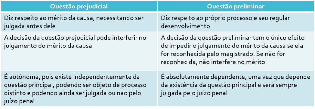 <p>QUESTÕES E PROCESSOS INCIDENTAIS</p><p>1. Questões prejudiciais (Arts. 92 a 94 do CPP)</p><p>Questão prejudicial é toda questão relacionada ao mérito da causa e que necessita ser julgada antes dele (ex:</p><p>julgamento do crime de furto de forma autônoma ao crime de receptação). Já a questão preliminar diz</p><p>respeito ao processo e seu regular desenvolvimento (ex: julgamento de nulidades).</p><p>O Brasil adota o sistema eclético ou misto, diferenciando as questões prejudiciais em:</p><p>HOMOGÊNEAS (não devolutivas/impróprias/imperfeitas): pertencem e podem ser resolvidas na mesma</p><p>jurisdição ou no mesmo ramo do direito – ex: exceção de verdade nos crimes de calúnia (Art. 138, §1, II,</p><p>CP).</p><p>e</p><p>HETEROGÊNEAS (devolutivas/próprias/perfeitas): referem-se a outras áreas do direito, devendo ser</p><p>decididas por outro juízo que não o penal – ex: decisão sobre a posse, na esfera cível, antes de decidir a</p><p>respeito do esbulho, previsto no art. 161, §1º, CP.</p><p>O Código de Processo penal trata expressamente da questão prejudicial obrigatória e da questão prejudicial</p><p>facultativa:</p><p>QUESTÃO PREJUDICIAL OBRIGATÓRIA: é aquela que impõe a suspensão do processo penal até que</p><p>haja decisão prolatada no juízo cível. Prevista no Art. 92, CPP – se a decisão sobre a existência do crime</p><p>depender da solução de controvérsia sobre o estado civil das pessoas – ex: discussão do casamento na esfera</p><p>cível para definição do crime de bigamia</p><p>QUESTÃO PREJUDICIAL FACULTATIVA: é aquela que permite ao juiz criminal, de acordo com seu</p><p>critério, suspender o processo, aguardando solução de determinada questão em outra esfera. Prevista no Art.</p><p>93, CPP – se o reconhecimento da existência do crime depender de decisão sobre questão diversa da</p><p>controvérsia sobre o estado civil das pessoas – ex: direitos reais, direitos obrigacionais, etc – decisão sobre a</p><p>posse, na esfera cível, antes de decidir a respeito do esbulho, previsto no art. 161, §1º, CP</p><p>TÍTULO VI</p><p>DAS QUESTÕES E PROCESSOS INCIDENTES</p><p>CAPÍTULO I</p><p>DAS QUESTÕES PREJUDICIAIS</p><p>1</p><p>Art. 92. Se a decisão sobre a existência da infração depender da solução de controvérsia, que o juiz repute</p><p>séria e fundada, sobre o estado civil das pessoas, o curso da ação penal ficará suspenso até que no juízo cível</p><p>seja a controvérsia dirimida por sentença passada em julgado, sem prejuízo, entretanto, da inquirição das</p><p>testemunhas e de outras provas de natureza urgente.</p><p>Parágrafo único. Se for o crime de ação pública, o Ministério Público, quando necessário, promoverá a ação</p><p>civil ou prosseguirá na que tiver sido iniciada, com a citação dos interessados.</p><p>Art. 93. Se o reconhecimento da existência da infração penal depender de decisão sobre questão diversa da</p><p>prevista no artigo anterior, da competência do juízo cível, e se neste houver sido proposta ação para resolvê-</p><p>la, o juiz criminal poderá, desde que essa questão seja de difícil solução e não verse sobre direito cuja prova</p><p>a lei civil limite, suspender o curso do processo, após a inquirição das testemunhas e realização das outras</p><p>provas de natureza urgente.</p><p>§1º O juiz marcará o prazo da suspensão, que poderá ser razoavelmente prorrogado, se a demora não for</p><p>imputável à parte. Expirado o prazo, sem que o juiz cível tenha proferido decisão, o juiz criminal fará</p><p>prosseguir o processo, retomando sua competência para resolver, de fato e de direito, toda a matéria da</p><p>acusação ou da defesa.</p><p>§2º Do despacho que denegar a suspensão não caberá recurso.</p><p>§3º Suspenso o processo, e tratando-se de crime de ação pública, incumbirá ao Ministério Público intervir</p><p>imediatamente na causa cível, para o fim de promover-lhe o rápido andamento.</p><p>Art. 94. A suspensão do curso da ação penal, nos casos dos artigos anteriores, será decretada pelo juiz, de</p><p>ofício ou a requerimento das partes.</p><p>2. Exceções (Arts. 95 a 111 do CPP)</p><p>“Exceção é a defesa indireta apresentada por qualquer das partes, com o intuito de prolongar o trâmite</p><p>processual, até que uma questão processual relevante seja resolvida, ou com a finalidade de estancar,</p><p>definitivamente, o seu curso, porque processualmente incabível o prosseguimento da ação” (Nucci)</p><p>O CPP prevê 5 espécies de suspeição: Suspeição, Incompetência de juízo, Litispendência, Ilegitimidade de</p><p>parte e Coisa julgada.</p><p>As exceções podem ser:</p><p>PEREMPTÓRIAS (proporcionam a extinção do processo sem julgamento de mérito – litispendência ou</p><p>coisa julgada) ou</p><p>DILATÓRIAS (proporcionam o prosseguimento do feito, procrastinando-o, o que ocorre com as exceções</p><p>de suspeição, incompetência do juízo e ilegitimidade de parte)</p><p>Exceção de Suspeição (Arts. 96 a 107, CPP)</p><p>Hipóteses de suspeição estão previstas no 254, CPP – se juiz suspeito atuar há nulidade relativa</p><p>Art. 254. O juiz dar-se-á por suspeito, e, se não o fizer, poderá ser recusado por qualquer das partes:</p><p>I - se for amigo íntimo ou inimigo capital de qualquer deles;</p><p>II - se ele, seu cônjuge, ascendente ou descendente, estiver respondendo a processo por fato análogo, sobre</p><p>cujo caráter criminoso haja controvérsia;</p><p>2</p><p>III - se ele, seu cônjuge, ou parente, consangüíneo, ou afim, até o terceiro grau, inclusive, sustentar demanda</p><p>ou responder a processo que tenha de ser julgado por qualquer das partes;</p><p>IV - se tiver aconselhado qualquer das partes;</p><p>V - se for credor ou devedor, tutor ou curador, de qualquer das partes;</p><p>Vl - se for sócio, acionista ou administrador de sociedade interessada no 