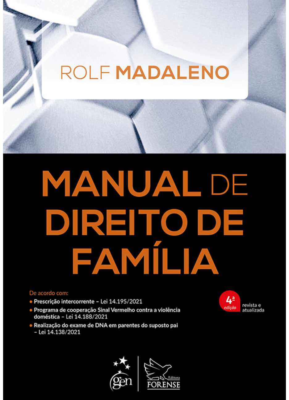 <p>O autor deste livro e a editora empenharam seus melhores esforços para assegurar que</p><p>as informações e os procedimentos apresentados no texto estejam em acordo com os</p><p>padrões aceitos à época da publicação, e todos os dados foram atualizados pelo autor até</p><p>a data de fechamento do livro. Entretanto, tendo em conta a evolução das ciências, as</p><p>atualizações legislativas, as mudanças regulamentares governamentais e o constante</p><p>fluxo de novas informações sobre os temas que constam do livro, recomendamos</p><p>enfaticamente que os leitores consultem sempre outras fontes fidedignas, de modo a se</p><p>certificarem de que as informações contidas no texto estão corretas e de que não houve</p><p>alterações nas recomendações ou na legislação regulamentadora.</p><p>Fechamento desta edição: 22.10.2021</p><p>O Autor e a editora se empenharam para citar adequadamente e dar o devido crédito a</p><p>todos os detentores de direitos autorais de qualquer material utilizado neste livro,</p><p>dispondo-se a possíveis acertos posteriores caso, inadvertida e involuntariamente, a</p><p>identificação de algum deles tenha sido omitida.</p><p>Atendimento ao cliente: (11) 5080-0751 | faleconosco@grupogen.com.br</p><p>Direitos exclusivos para a língua portuguesa</p><p>Copyright © 2022 by</p><p>Editora Forense Ltda.</p><p>Uma editora integrante do GEN | Grupo Editorial Nacional</p><p>Travessa do Ouvidor, 11 – Térreo e 6º andar</p><p>Rio de Janeiro – RJ – 20040-040</p><p>www.grupogen.com.br</p><p>Reservados todos os direitos. É proibida a duplicação ou reprodução deste volume, no</p><p>todo ou em parte, em quaisquer formas ou por quaisquer meios (eletrônico, mecânico,</p><p>gravação, fotocópia, distribuição pela Internet ou outros), sem permissão, por escrito, da</p><p>Editora Forense Ltda.</p><p>Capa: Aurélio Corrêa</p><p>Produção digital: Ozone</p><p>CIP – BRASIL. CATALOGAÇÃO NA FONTE.</p><p>SINDICATO NACIONAL DOS EDITORES DE LIVROS, RJ.</p><p>mailto:faleconosco@grupogen.com.br</p><p>http://www.grupogen.com.br/</p><p>M151m</p><p>Madaleno, Rolf</p><p>Manual de direito de família / Rolf Madaleno. – 4. ed. – Rio de Janeiro: Forense, 2022.</p><p>Inclui bibliografia</p><p>ISBN 978-65-596-4247-2</p><p>1. Direito de família – Brasil. I. Título.</p><p>21-73994 CDU: 347.6(81)</p><p>Camila Donis Hartmann – Bibliotecária – CRB-7/6472</p><p>Dedico este Manual de Direito de Família ao meu sempre</p><p>amigo e amado neto Guilherme Carpes Madaleno Esteves,</p><p>para que ele cresça sabendo desde pequeno e desde a primeira</p><p>edição deste livro que ele é muito amado pelo seu avô e por</p><p>toda a sua família, do jeito como comanda o direito familista,</p><p>no sentido de que toda convivência tem de ser plena,</p><p>como plena tem sido a minha existência desde a existência</p><p>dele, e estendo esse mesmo sentimento, fazendo idêntica</p><p>dedicação aos meus netos Joaquim Madaleno Malhão</p><p>e Olívia Mabilde Madaleno.</p><p>PRÓLOGO</p><p>Este é o resultado de um novo desafio ao qual me impus, com as</p><p>naturais dificuldades, sempre presentes quando alguém se debruça para</p><p>elaborar um livro, e com a responsabilidade de escrever, que confronta com</p><p>a falta de tempo e de espaço quando se trata de uma proposta literária mais</p><p>pragmática.</p><p>Esta obra é, portanto, enxuta, sem perda do seu conteúdo, que, por ser</p><p>mais objetivo e delimitado, contrasta com a paixão pelo tema e que</p><p>facilmente transborda nesse imensurável universo do Direito de Família. Sua</p><p>proposta, entretanto, é a de preservar seus nítidos traços acadêmicos.</p><p>O Manual de Direito de Família é destinado à formação de estudantes</p><p>que se iniciam no mundo do Direito das Famílias, mas não se descura do seu</p><p>leitor habitual e já profissional do Direito e, em especial, do Direito de</p><p>Família. Esse é o propósito deste Manual, agora apresentado como resumo</p><p>do antecedente Curso de Direito de Família (atualmente, apenas Direito de</p><p>Família), em sua 7ª edição, além de buscar manter o compromisso de</p><p>traduzir a mais fiel interpretação desse sempre apaixonante ramo do Direito,</p><p>visto como em um espelho que reflete as relações humanas e afetivas e os</p><p>nossos vínculos de parentesco biológico e socioafetivo, cujos valores dão</p><p>sentido diário à nossa existência em família.</p><p>Este Manual de Direito de Família, embora não guarde as</p><p>características literárias de seu precedente Curso de Direito de Família,</p><p>procura manter de forma mais pragmática a essência da obra original, cujo</p><p>propósito sempre foi o de proporcionar o que existe de mais completo e</p><p>atual no Direito familiar brasileiro.</p><p>Porto Alegre, verão de 2017.</p><p>APRESENTAÇÃO DA 4ª EDIÇÃO</p><p>Em tempos de pandemia, hábitos foram mudados, adaptações foram</p><p>realizadas, interações tiveram espaço e exclusões não deixaram de ser</p><p>experimentadas, mas, entre os habituais prós e contras, tem sido esta a</p><p>maneira de o ser humano exercer seus relacionamentos, que foram sendo</p><p>simplesmente adaptados às novas e nunca antes vivenciadas pelas atuais</p><p>gerações com mais ou com menos tempo de vida, ladeado cada ser humano</p><p>das suas experiências pessoais de vida e às quais o direito sempre se</p><p>esforça em atender, mesmo porque é quase lugar-comum dizer que as</p><p>famílias são a base da sociedade, que precisa ser protegida e minimamente</p><p>organizada em seus direitos, sejam eles materiais ou existenciais, sigam</p><p>vivendo as pessoas em família ou sem família, sejam elas construindo novos</p><p>vínculos pessoais, e esse movimento que é dinâmico e fundamental para o</p><p>equilíbrio das relações das pessoas este livro procura sempre acompanhar,</p><p>como agora também o faz em sua quarta