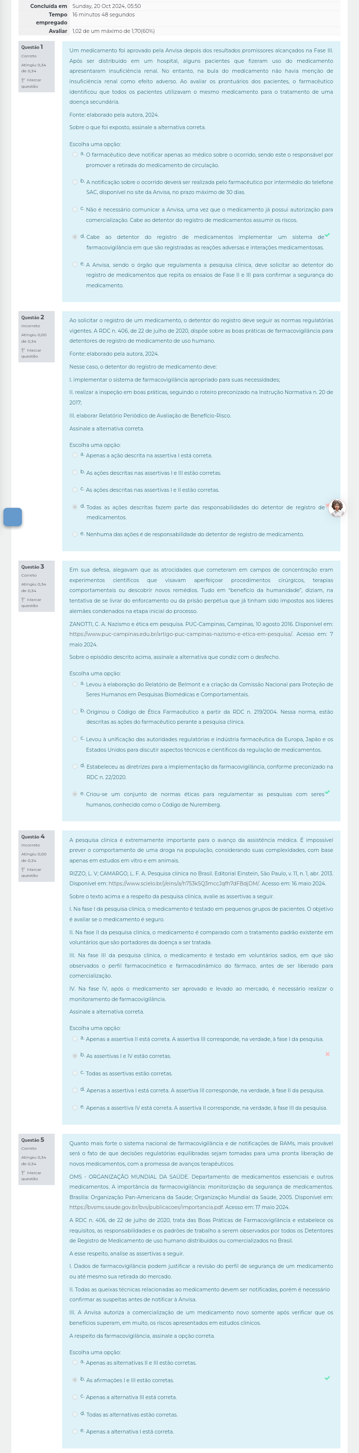 Concluída em Sunday, 20 Oct 05:50 Tempo minutos 48 segundos empregado Avaliar 1,02 de um máximo de 1,70(60%) Um med icamento fo aprovado pela Anvisa depois dos resultados promissores alcançados na Fase III. Correto Após ser distribuido em um hospital, alguns pacientes que fizeram uso do medicamento de 0,34 apresentaram insuficiência renal No entanto, na bula do medicamento não havia menção de Marcar insuficiência renal como efeito Ao avaliar os prontuários dos pacientes, farmacêutico questão identificou que todos os pacientes utilizavam mesmo medicamento para tratamento de uma doença secundária Fonte elaborado pela autora 2024. Sobre que foi exposto assinale alternativa correta Escolha uma opção: farmacêutico deve notificar apenas ao médico sobre ocor sendo este responsável por promover a retirada do med camento de b not sobre do deverá ser realizada pelo po intermédio do telefone disponível no site da Anvisa, no orazo de 30 dias Não necessário comunicar uma vez que medicamento já possui autorização para comercialização. Cabe ao detentor do registro de medicamentos assumir os riscos Cabe ao detentor do registro de medicamentos implementar um sistema em que são registrada as reações adversas interações sendo órgão que regulamenta pesquisa deve solicitar ao detentor do registro de medicamentos que repita os ensaios de Fase para confirmar segurança do medicamento. Questão 2 Ao solicitar registro de um medicamento detentor do registro deve seguir as normas ias vigentes RDC 406 de 22 de julho de 2020 dispõe sobre as boas práticas de fa macovigi ância para de 0,34 detentores de registro de medicamento de uso Marcar Fonte elaborado pela autora 2024 Nesse caso detentor do registro de medicamento implementar sistema de apropriado para suas necessidades; realizar inspeção em boas práticas seguindo rote preconizado na Instrução 20 de 2017; III elaborar Relatório Periodico de Avaliação de Risco Assinale alternativa correta Escolha uma opção: a Apenas a ação descrita na assertiva correta ações descritas nas assertivas e estão corretas As ações descritas nas assertivas estão corretas d. Todas as ações descritas fazem parte das responsabilidades do detentor de registro Nenhuma das ações de responsabilidade do detentor de registro de Questão 3 Em sua defesa, alegavam que as atrocidades que cometeram em campos de concentração eram Correto experimentos cientificos que visavam aperfeiçoar procedimentos cirúrgicos, terapias de 0,34 comportamentais ou descobrir novos remédios Tudo em "beneficio da diziam, na Marcar tentativa de se livrar do enforcamento ou da prisão que já tinham sido impostos aos lideres questão alemães condenados na etapa inicial do Nazismo em pesquisa PUC Campinas Campinas, 10 agosto 2016 campinas.edu.br/artige puc nazismo e-etica em Acesso em: 7 maio 2024 Sobre ito assinale alternativa que condiz com desfecho Escolha uma opção a. Levou elaboração do de Belmont criação da Comissão Nac ional para Proteção de Seres Humanos em Pesqu Comportamentais b Originou Código de Farmacêutico partir da RDC Nessa norma, estão descritas as ações do farmacêutico perante pesquisa clinica Levou unificação das autoridades regulatórias farmacêutica da Europa, os Estados Unidos para discutir aspectos técnicos cient ficos da regulação de d. Estabeleceu as diretrizes para implementação da conforme preconizado na RDC 22/2020 Criou-se um conjunto de normas éticas para regulamentar as pesquisas com seres conhecido como Código de Nuremberg Questão 4 A pesquisa clinica extremamente importante para avanço da assistência É impossível prever comportamento de uma droga na considerando suas complexidades, com base Atingiu 0,00 de 0,34 apenas em estudos em vitro em Marcar questão RIZZO V: CAMARGO L. A Pesquisa clinica no Brasil Editorial Einstein São Paulo, abr 2013 Disponível em Acesso em 16 Sobre texto acima respeito da pesquisa clinica avalie as assertivas seguir 1. Na fase da pesquisa medicamento testado em pequenos grupos de pacientes objetivo é avaliar se seguro. Na fase da pesquisa clinica medicamento é comparado com tratamento padrão existente em voluntários que são portadores da doença ser Na fase III da pesquisa clinica medicamento testado em voluntários sadios em que são observados perfil farmacocinético e do antes de ser liberado para Na fase IV. após medicamento ser aprovado e levado ao mercado, é necessário realizar o monitoramento de Assinale alternativa correta Escolha uma Apenas assertiva correta A assertiva na verdade, fase da pesquisa As assertivas estão corretas Todas assertivas estão corretas Apenas assertiva correta assertiva III na verdade fase da pesquisa. Apenas assertiva IV está correta assertiva corresponde na verdade fase da pesquisa. Questão 5 Quanto mais forte sistema nacional de de notificações de mais provável Correto será fato de que decisões regulatórias equilibradas sejam tomadas para uma pronta liberação de Atingiu 0,34 de 0,34 novos medicamentos com promessa de avanços questão OMS ORGANIZAÇÃO MUNDIAL DA SAÚDE Departamento de medicamentos essenciais outros A importância da monitorização da segurança de medicamentos. Organização Pan-Americana da Saúde Organização Mundial da Saúde 2005 Disponível em: https://bvsms.saude gov Acesso em 17 maio 2024 A RDC n. 406, de 22 de julho de trata das Boas Práticas de estabelece os as responsabilidades padrões de trabalho serem observados por todos os Detentores de Registro de Medicamento de uso humano ou izados no Brasil A esse respeito analise as assertivas seguir I Dados de podem justificar revisão do perfil de segurança de um medicamento ou até mesmo sua retirada do mercado. Todas as queixas técnicas relacionadas ao medicamento devem ser notificadas porém necessário confirmar as suspeitas antes de notificar Anvisa III A Anvisa autoriza comercialização de um medicamento novo somente após verific