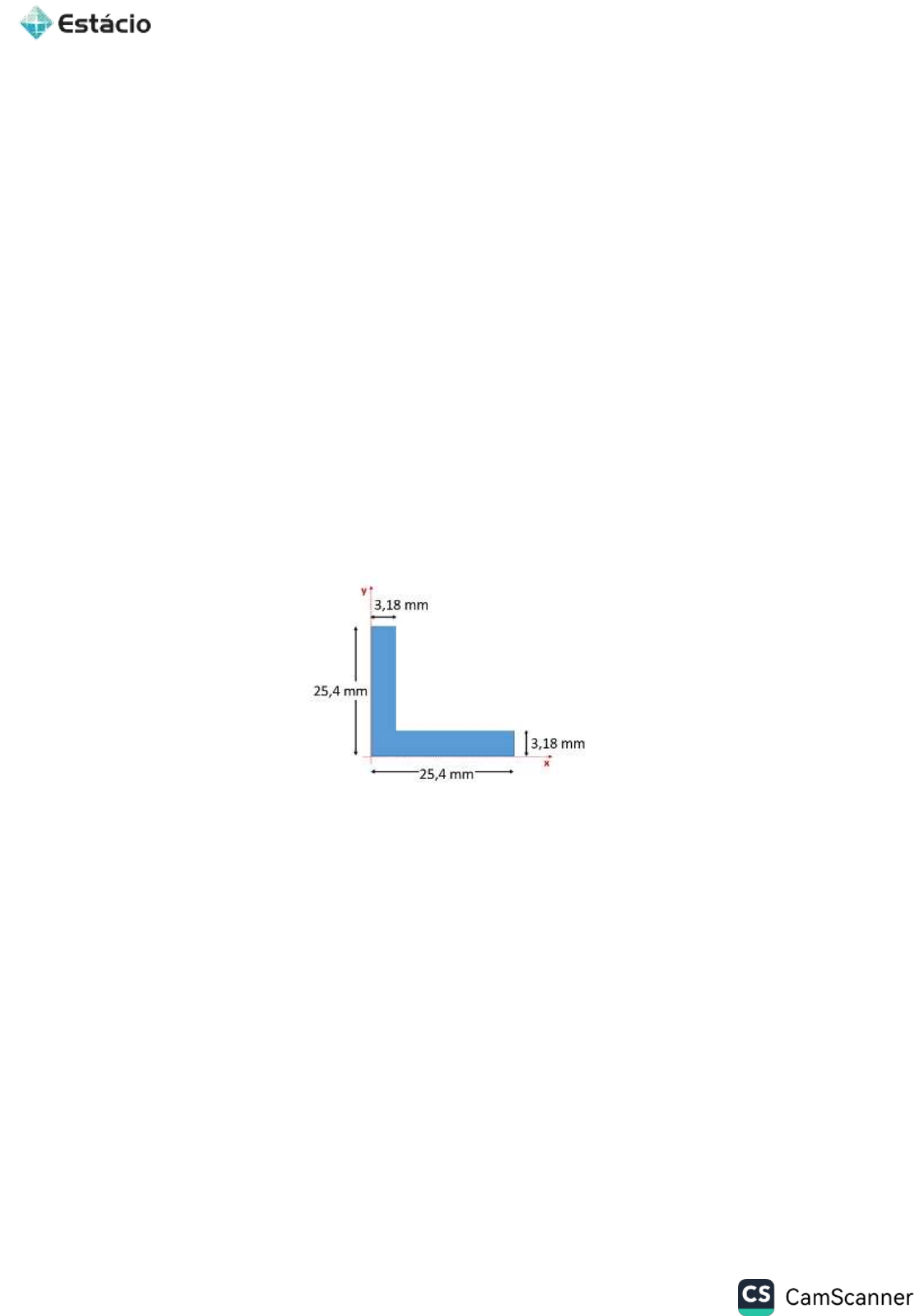 <p>CENTRO UNIVERSITÁRIO ESTÁCIO</p><p>Disciplina: ELEMENTOS DE MÁQUINAS</p><p>Atividade – Valendo 1,0 (um ponto) extra</p><p>Observações:</p><p>1- Apenas uma alternativa está correta;</p><p>2- As respostas devem ser entregues na aula do dia 25/10, com a identificação do nome</p><p>completo do aluno.</p><p>3- Cada questão vale 0,20 pontos.</p><p>Questão 01:</p><p>A cantoneira metálica mostrada na figura será usada como elemento de</p><p>diagonal de uma treliça de cobertura. Para o dimensionamento o</p><p>Engenheiro precisa ter conhecimento das propriedades geométricas de</p><p>área desta cantoneira. Determine a coordenada x do centroide deste perfil,</p><p>de acordo com os eixos mostrados na figura.</p><p>Questão 02:</p><p>Uma viga com seção transversal retangular foi projetada com dimensões de</p><p>0,15m de base e 0,50m de altura. Considere que os eixos x e y estão</p><p>posicionados no centroide da figura. Determine o momento de Inércia Ix e</p><p>Iy.</p><p>CENTRO UNIVERSITÁRIO ESTÁCIO</p><p>Disciplina: ELEMENTOS DE MÁQUINAS</p><p>Atividade – Valendo 1,0 (um ponto) extra</p><p>Questão 03:</p><p>Determine o diâmetro exigido para um eixo de aço (G=75GPA) com</p><p>comprimento de 600 mm e que deve transmitir um torque de 56 N.m. A</p><p>tensão cisalhante no eixo não deve ser superior a 70MPa e o ângulo de</p><p>torção deve ser superior a 0,05 rad.</p><p>Questão 04:</p><p>Considerando a figura abaixo, determinar o raio de giração, sendo que b =</p><p>20cm e h = 25cm.</p><p>Obs: Consultar tabela de características geométricas de figuras conhecidas</p><p>para obter a equação do raio de giração.</p><p>Questão 05:</p><p>A figura representa a seção transversal de uma viga “T”. Para a figura,</p><p>determinar:</p><p>a) o centro de gravidade;</p><p>b) o momento de inércia em relação ao eixo x;</p>