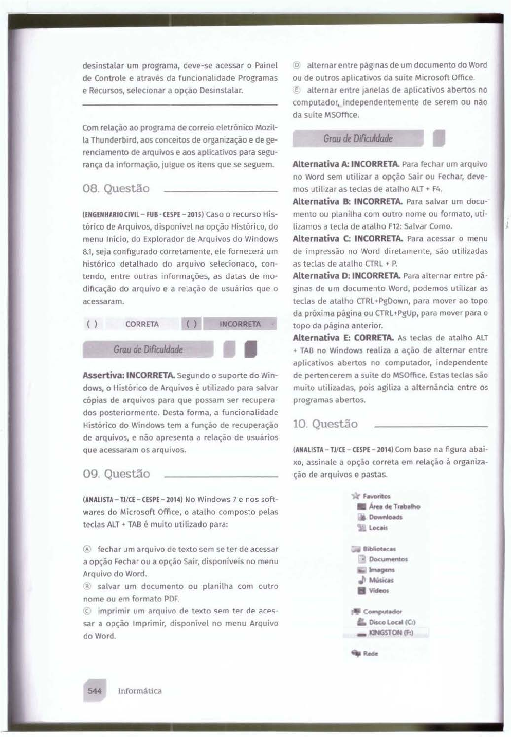 <p>desinstalar um programa, deve-se acessar o Painel o alternar entre páginas de um documento do Word</p><p>de Controle e através da funcionalidade Programas ou de outros aplicatiVOS da suíte Microsoft Office.</p><p>e Recursos, selecionar a opção Oesinstalar. E alternar entre janelas de aplicativos abertos no</p><p>computador, mdependentemente de serem ou não</p><p>da suíte MSOffice.</p><p>Com relação ao programa de correio eletrônico Mozil·</p><p>la Thunderb~rd, aos conceitos de organização e de ge-</p><p>renciamento de arquivos e aos aplicativos para segu-</p><p>Grau de Dificuldade I</p><p>rança da informação, julgue os itens que se seguem. Alternativa A; INCORRETA. Para fechar um arquivo</p><p>no Word sem utilizar a opção Sair ou Fechar, deve-</p><p>08. Questão mos utilizar as teclas de atalho ALT • F4.</p><p>(ENGENHARIO CIVIL- FUB • CESPE- 201S) Caso o recurso His·</p><p>tórico de Arquivos, disponível na opção Histórico, do</p><p>menu Início, do Explorador de Arquivos do Windows</p><p>8.1, seja configurado corretamente, ele fornecerá um</p><p>histórico detalhado do arquivo selecionado, con·</p><p>tendo, entre outras informações, as datas de mo·</p><p>dificação do arquivo e a relação de usuários que o</p><p>acessaram.</p><p>() CORRETA ( ) INCORRETA</p><p>~~·--~~~~~</p><p>Grau de Dificuldade l i</p><p>Alternativa 8 : INCORRETA. Para salvar um doeu·</p><p>mento ou planilha com outro nome ou formato, uti·</p><p>tizamos a tecla de atalho F12: Salvar Como.</p><p>Alternativa C: INCORRETA. Para acessar o menu</p><p>de impressão no Word diretamente, são utilizadas</p><p>as teclas de atalho CTRL • P.</p><p>Alternativa D: INCORRETA. Para alternar entre pá·</p><p>ginas de um documento Word, podemos utilizar as</p><p>teclas de atalho CTRL+PgDown, para mover ao topo</p><p>da próxima página ou CTRL+PgUp, para mover para o</p><p>topo da página anterior.</p><p>Alternativa E: CORRETA. As teclas de atalho ALT</p><p>+ TAS no Windows realiza a ação de alternar entre</p><p>aplicativos abertos no computador, independente</p><p>Assertiva: INCORRETA. Segundo o suporte do Win· de pertencerem a suíte do MSOffice. Estas teclas são</p><p>dows, o Histórico de Arquivos é utilizado para salvar muito utilizadas, pois agiliza a alternância ent re os</p><p>cópias de arqu1vos para que possam ser recupera· programas abertos.</p><p>dos posteriormente. Desta forma, a funcionalidade</p><p>Histórico do Windows tem a função de recuperação 10 Questão</p><p>de arquivos. e não apresenta a relação de usuários</p><p>que acessaram os arqu1vos. (ANALISTA - TJ/CE - CESPE - 2014) Com base na figura abaí·</p><p>xo, assinale a opção correta em relação à organiza-</p><p>09. Questão</p><p>(ANALISTA - TJICE- CESPE - 2014) No Windows 7 e nos soft</p><p>wares do Microsoft Office, o atalho composto pelas</p><p>teclas ALT + TAB é muito utilizado para:</p><p>A fechar um arquivo de texto sem se ter de acessar</p><p>a opção Fechar ou a opção Sair, disponíveis no menu</p><p>Arquivo do Word.</p><p>s salvar um documento ou planilha com outro</p><p>nome ou em formato PDF.</p><p>c imprimir um arquivo de texto sem ter de aces·</p><p>sar a opção Imprimir, disponível no menu Arquivo</p><p>doWord.</p><p>544 lnformátlca</p><p>ção de arquivos e pastas.</p><p>CompoJt ....</p><p>o-o lo</p>