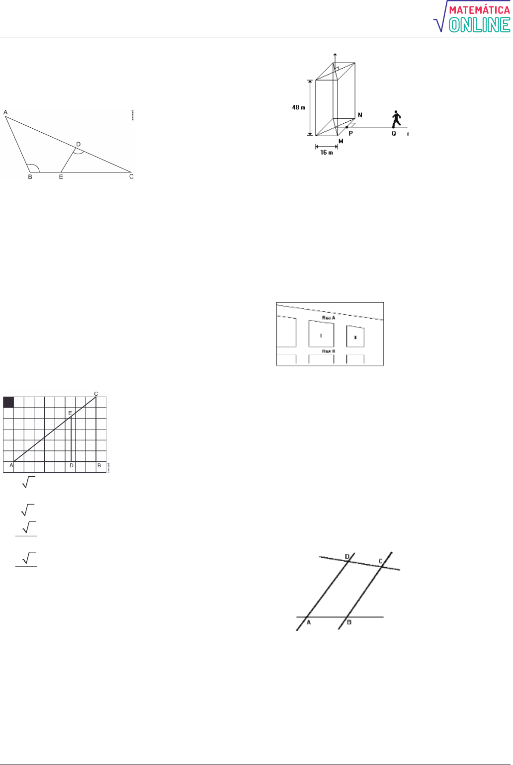 <p>Alisson Marques - online</p><p>3</p><p>13. (Uel 1997) Na figura a seguir, são dados:</p><p>ˆ ˆABC EDC, ED 2,5 cm, AB 6 cm, BC 9 cm e</p><p>AC 12 cm.</p><p>Se os triângulos da figura são semelhantes, o</p><p>perímetro do triângulo EDC é, em centímetros,</p><p>a) 11,25</p><p>b) 11,50</p><p>c) 11,75</p><p>d) 12,25</p><p>e) 12,50</p><p>14. (Fuvest 1997) No papel quadriculado da figura a</p><p>seguir, adota-se como unidade de comprimento o lado</p><p>do quadrado hachurado.</p><p>DE é paralelo a BC. Para que a área do triângulo ADE</p><p>seja a metade da área do triângulo ABC, a medida de</p><p>AD, na unidade adotada, é</p><p>a) 4 2</p><p>b) 4</p><p>c) 3 3</p><p>d)</p><p>8 3</p><p>3</p><p>e)</p><p>7 3</p><p>2</p><p>15. (Uff 1997) Um prédio com a forma de um</p><p>paralelepípedo retângulo tem 48 m de altura. No</p><p>centro da cobertura desse prédio e</p><p>perpendicularmente a essa cobertura, está instalado</p><p>um para-raios. No ponto Q sobre a reta r - que passa</p><p>pelo centro da base do prédio e é perpendicular ao</p><p>seguimento MN - está um observador que avista</p><p>somente uma parte do para-raios.</p><p>A distância do chão aos olhos do observador é 1,8 m</p><p>e o segmento PQ = 61,6 m.</p><p>O comprimento da parte do para-raios que o</p><p>observador NÃO consegue avistar é:</p><p>a) 16 m</p><p>b) 12 m</p><p>c) 8 m</p><p>d) 6 m</p><p>e) 3 m</p><p>16. (Unirio 1997)</p><p>No desenho anterior apresentado, as frentes para a</p><p>rua A dos quarteirões I e II medem, respectivamente,</p><p>250 m e 200 m, e a frente do quarteirão I para a rua B</p><p>mede 40 m a mais do que a frente do quarteirão II para</p><p>a mesma rua. Sendo assim, pode-se afirmar que a</p><p>medida, em metros, da frente do menor dos dois</p><p>quarteirões para a rua B é:</p><p>a) 160</p><p>b) 180</p><p>c) 200</p><p>d) 220</p><p>e) 240</p><p>17. (Ufmg 1998) Observe a figura.</p><p>Nessa figura, os segmentos AD e BC são paralelos,</p><p>AD = 8, AB = 3 e BC = 7.</p><p>Sendo P o ponto de interseção das retas AB e DC, a</p><p>medida do segmento BP é</p><p>a) 23</p><p>b) 22</p><p>c) 24</p><p>d) 21</p>
