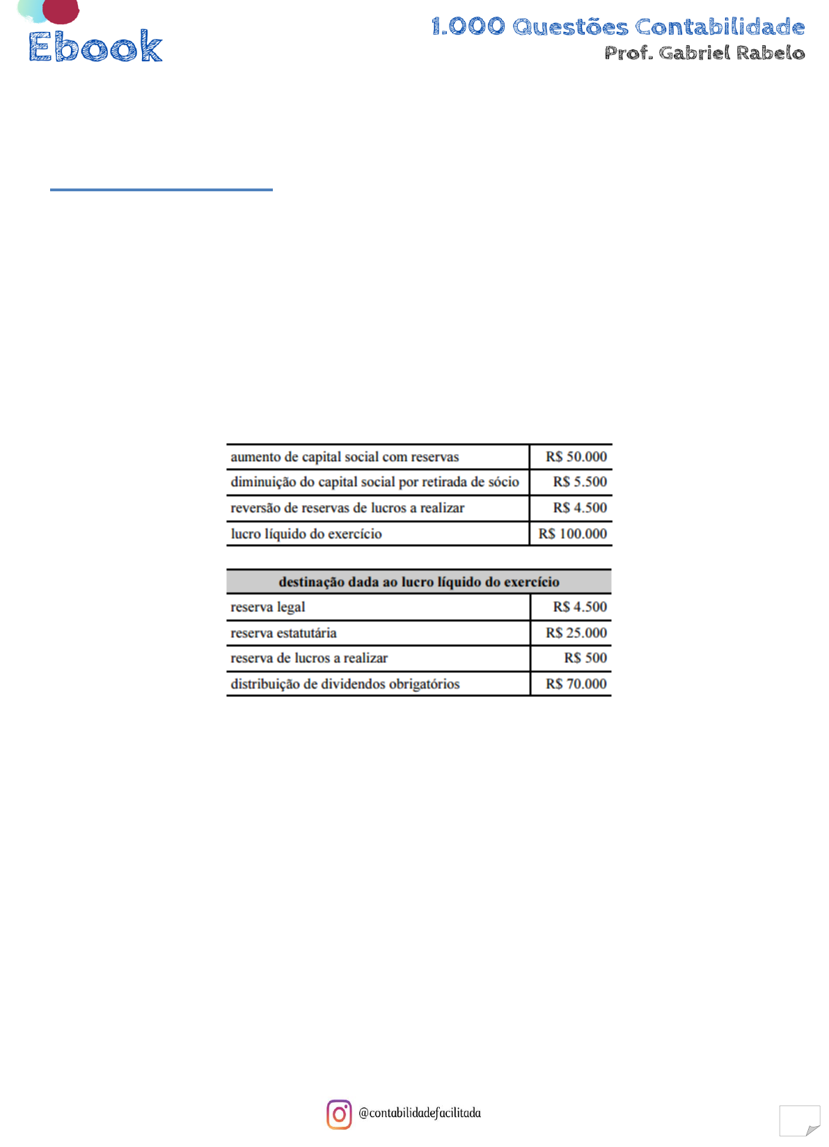 <p>Ebook 1.000 Questões Contabilidade Prof. Gabriel Rabelo</p><p>321</p><p>Capítulo 11 – DLPA e DMPL</p><p>Banca Cespe</p><p>851. (CESPE/SEDF/Analista Gestão Educacional – Contabilidade/ 2017)</p><p>Com referência à elaboração de demonstrações contábeis, julgue o item seguinte à luz da</p><p>legislação societária, dos princípios fundamentais da contabilidade e dos pronunciamentos</p><p>contábeis do CPC.</p><p>O total de dividendos reconhecidos como distribuição aos acionistas durante dado exercício</p><p>pode ser evidenciado na demonstração das mutações do patrimônio líquido.</p><p>852. (CESPE/TCE-PR/Analista de Controle - Atuarial/2016)</p><p>Os dados apresentados foram extraídos da demonstração das mutações do patrimônio líquido</p><p>de uma entidade e representam todas as transações que afetaram esse grupo patrimonial em</p><p>determinado exercício.</p><p>Com base nessas informações, é correto afirmar que, naquele exercício, o patrimônio líquido da</p><p>entidade</p><p>a) aumentou em R$ 70.000.</p><p>b) aumentou em R$ 20.000.</p><p>c) foi reduzido em R$ 10.000.</p><p>d) foi reduzido em R$ 5.500.</p><p>e) aumentou em R$ 144.500.</p><p>853. (CESPE/Auditor de Controle Externo/TCE/SC/2016)</p><p>Não podem constar na demonstração das mutações do patrimônio líquido de uma empresa as</p><p>modificações das quais seus sócios participem em qualidade diferente de proprietários.</p>