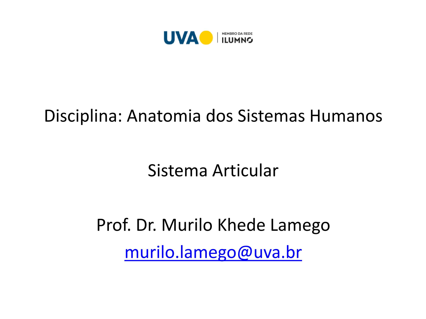 <p>MEMBRO DA REDE</p><p>ILUMNO</p><p>Disciplina: Anatomia dos Sistemas Humanos</p><p>Sistema Articular</p><p>Prof. Dr. Murilo Khede Lamego</p><p>murilo-lamego@uva.br</p><p>mailto:murilo-lamego%40uva.br</p><p>Introdução</p><p>• As articulações são definidas como a junção</p><p>ou união principalmente entre dois ou mais</p><p>ossos, mas também entre osso e cartilagem</p><p>ou até mesmo entre cartilagens.</p><p>• As articulações nem sempre estão associadas</p><p>ao movimento; portanto, existe uma</p><p>classificação funcional:</p><p>Classificação Funcional</p><p>Sinartroses: Articulações sem movimento.</p><p>Exemplo: articulações entre os ossos do crânio.</p><p>Anfiartroses: Articulações com pouco</p><p>movimento, ou seja, movimento limitado.</p><p>Exemplo: articulação entre os corpos vertebrais</p><p>(discos intervertebrais).</p><p>Diartroses: Articulações com amplo movimento.</p><p>Exemplo: ombro.</p><p>Si</p><p>FIGURA 3.1 A, Articulações por continuidade (sinartroses - Si) e B, Articulações por contiguidade (diartroses - Di).</p><p>Classificação de acordo com o tecido</p><p>interposto</p><p>• Articulações fibrosas: Ossos e/ou cartilagens são unidos por tecido conjuntivo</p><p>fibroso.</p><p>• Articulações cartilaginosas: Ossos e/ou cartilagens são unidos por cartilagem</p><p>hialina ou fibrocartilagem.</p><p>• Articulações sinoviais: Ossos e/ou cartilagens são unidos por meio de uma</p><p>cápsula articular e separados por um líquido. Este tipo é denominado articulação</p><p>por contiguidade ou proximidade, pois existe um pequeno espaço entre os ossos</p><p>e/ou cartilagens, a cavidade articular, ocupado pelo líquido sinovial</p><p>Articulações Fibrosas</p><p>• As articulações podem ser divididas em quatro</p><p>tipos:</p><p>• Suturas</p><p>• Sindesmoses</p><p>• Gonfoses</p><p>• Esquindilese</p><p>Suturas</p><p>Localizadas no crânio e possuem um grau de</p><p>movimentação muito pequeno ou quase nulo.</p><p>Podem ser nomeadas por meio da descrição</p><p>dos nomes dos ossos que se articulam (por</p><p>exemplo, sutura temporoparietal), ou por</p><p>meio da relação com os planos do corpo (por</p><p>exemplo, sutura sagital).</p><p>Três grupos - suturas</p><p>• Planas: Ossos encaixados através de uma linha</p><p>reta.</p><p>• Serrátil ou denteada: Ossos encaixados por</p><p>meio de uma linha tortuosa mais pontiaguda</p><p>ou mais abaulada, respectivamente.</p><p>Escamosa: Ossos parcialmente sobrepostos.</p><p>A</p><p>FIGURA 3.2 Tipos de sutura: (A) denteada, (B) plana, (C)</p><p>serrátil e (D) escamosa</p><p>Sindesmoses</p><p>• Uma união através de um ligamento.</p><p>• São representadas por uma membrana</p><p>formada por tecido conjuntivo fibroso</p><p>• Diferem das suturas por apresentarem maior</p><p>quantidade de tecido conjuntivo fibroso</p><p>interposto.</p><p>Exemplo de articulação fibrosa do tipo sindesmose (Si): membrana interóssea</p><p>radioulnar no antebraço. Osso rádio (R) e osso ulna (U).</p><p>Gonfoses</p><p>• é a articulação específica entre os cientes e a</p><p>mandíbula e as maxilas.</p><p>• As raízes dentárias encaixam-se nos alvéolos</p><p>dentários (cavidades nos ossos descritos) e o</p><p>que os une é a presença de um ligamento</p><p>formado por tecido conjuntivo fibroso, ou</p><p>ligamento periodontal</p><p>Articulação fibrosa do tipo gonfose (setas) entre os alvéolos dentários e as raízes dentárias</p><p>na mandíbula.</p><p>Esquindilese</p><p>é uma articulação</p><p>específica entre uma</p><p>ranhura ou fenda de um</p><p>osso e uma crista ou</p><p>saliência de outro osso,</p><p>como observado entre</p><p>uma goteira na base do</p><p>osso vômer e uma crista</p><p>no corpo do esfenoide</p><p>Articulações Cartilaginosas</p><p>Neste tipo, o tecido responsável pela união entre</p><p>os ossos é uma cartilagem.</p><p>Possuem mobilidade reduzida; porém, são mais</p><p>móveis do que as articulações fibrosas.</p><p>Quando o tecido interposto é uma cartilagem</p><p>hialina, são denominadas sincondroses, e</p><p>quando o tecido interposto é uma</p><p>fibrocartilagem, são denominadas sínfises.</p><p>Sincondroses</p><p>• Podem ser divididas em temporárias e</p><p>permanentes.</p><p>• As sincondroses temporárias estão presentes nas</p><p>cartilagens epifisárias. Quando o crescimento</p><p>cessa, estas regiões desaparecem porque se</p><p>ossificam.</p><p>nao• As sincondroses permanentes</p><p>desaparecem com o passar do tempo.</p><p>Fl G U RA 3.10 Exe m p lo de arde ulaç ão c arti lag i nosa do ti po sinco n d rose tem porári a: a p resen ç a de d isc o c a rti lag i noso epifi sário ou</p><p>cartilagem de conjugação na metáfise dos ossos longos: fêmur (A), tibia (B) e úmero (C).</p><p>FIGURA 3.11 Exemplos de articulações cartilaginosas entre as três divisões do osso estemo: manúbrio (M), corpo (O) e processo</p><p>xifoide (PX). Uma sincondrose permanente (manubri oeste mal - ME) e temporária: (xifoestemal - XE) não mais visível entre o corpo e</p><p>processo xifoide do esterno.</p><p>Sínfises</p><p>• A união entre os ossos é realizada através de</p><p>uma fibrocartilagem que é resistente.</p><p>Possuem movimentos limitados e são</p><p>medianas, ou seja, estão no centro do corpo</p><p>Exemplo de articulação cartilaginosa do tipo sínfise: a sínfise púbica (seta). Acetábulo (A); ílio (I);</p><p>ísquio (Is) e púbis (P).</p><p>Exemplo de articulação cartilaginosa do tipo sínfise: a sínfise intercorpovertebral (setas</p><p>delgadas). Corpos vertebrais (C) e medula espinhal (setas espessas).</p><p>Aplicação clínica 1</p><p>Os discos intervertebrais são estruturas localizadas entre os corpos vertebrais que amortecem os movimentos realizados pela coluna vertebral. Fatores como movimentos incorretos, posturas</p><p>indesejadas e sobrepeso podem causar lesões no anel fibroso do disco. Se houver rup