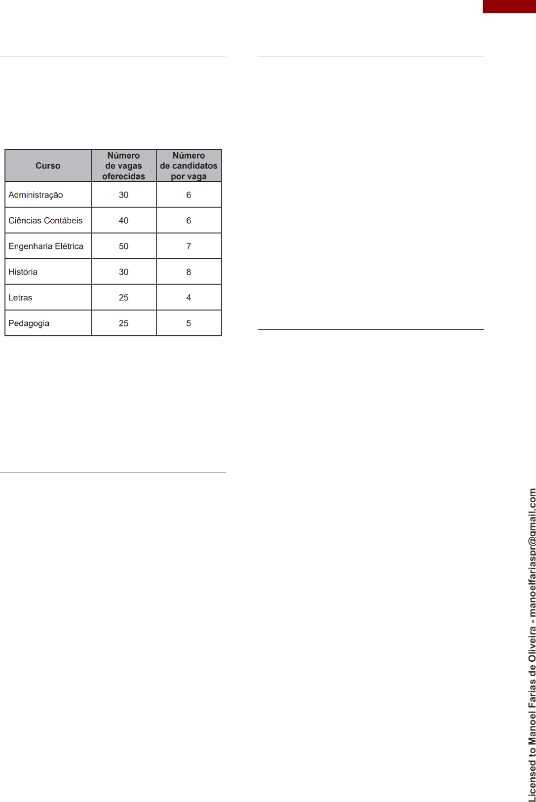 <p>62 ARITMÉTICA 1 – OPERAÇÕES BÁSICAS</p><p>QUESTÃO 81 (ENEM 2022)</p><p>Uma instituição de ensino superior</p><p>ofereceu vagas em um processo seletivo de acesso</p><p>a seus cursos. Finalizadas as inscrições, foi</p><p>divulgada a relação do número de candidatos por</p><p>vaga em cada um dos cursos oferecidos. Esses</p><p>dados são apresentados no quadro.</p><p>Qual foi o número total de candidatos inscritos</p><p>nesse processo seletivo?</p><p>A) 200</p><p>B) 400</p><p>C) 1200</p><p>D) 1235</p><p>E) 7200</p><p>QUESTÃO 82 (ENEM 2022)</p><p>Um borrifador de atuação automática</p><p>libera, a cada acionamento, uma mesma</p><p>quantidade de inseticida. O recipiente desse</p><p>produto, quando cheio, contém 360 mL de</p><p>inseticida, que duram 60 dias se o borrifador</p><p>permanecer ligado ininterruptamente e for</p><p>acionado a cada 48 minutos.</p><p>A quantidade de inseticida que é liberada a cada</p><p>acionamento do borrifador, em mililitro, é</p><p>A) 0,125.</p><p>B) 0,200.</p><p>C) 4,800.</p><p>D) 6,000.</p><p>E) 12,000.</p><p>QUESTÃO 83 (ENEM 2022)</p><p>Definem-se o dia e o ano de um planeta de</p><p>um sistema solar como sendo, respectivamente, o</p><p>tempo que o planeta leva para dar 1 volta completa</p><p>em torno de seu próprio eixo de rotação e o tempo</p><p>para dar 1 volta completa em torno de seu Sol.</p><p>Suponha que exista um planeta Z, em</p><p>algum sistema solar, onde um dia corresponda a 73</p><p>dias terrestres e que 2 de seus anos correspondam</p><p>a 1 ano terrestre. Considere que 1 ano terrestre tem</p><p>365 de seus dias.</p><p>No planeta Z, seu ano corresponderia a quantos de</p><p>seus dias?</p><p>A) 2,5</p><p>B) 10,0</p><p>C) 730,0</p><p>D) 13 322,5</p><p>E) 53 290,0</p><p>QUESTÃO 84 (ENEM 2022)</p><p>Um parque tem dois circuitos de tamanhos</p><p>diferentes para corridas. Um corredor treina nesse</p><p>parque e, no primeiro dia, inicia seu treino</p><p>percorrendo 3 voltas em torno do circuito maior e 2</p><p>voltas em torno do menor, perfazendo um total de</p><p>1 800 m. Em seguida, dando continuidade a seu</p><p>treino, corre mais 2 voltas em torno do circuito</p><p>maior e 1 volta em torno do menor, percorrendo</p><p>mais 1 100 m.</p><p>No segundo dia, ele pretende percorrer 5</p><p>000 m nos circuitos do parque, fazendo um número</p><p>inteiro de voltas em torno deles e de modo que o</p><p>número de voltas seja o maior possível.</p><p>A soma do número de voltas em torno dos dois</p><p>circuitos, no segundo dia, será</p><p>A) 10.</p><p>B) 13.</p><p>C) 14.</p><p>D) 15.</p><p>E) 16</p><p>L</p><p>ic</p><p>en</p><p>se</p><p>d</p><p>t</p><p>o</p><p>M</p><p>an</p><p>o</p><p>el</p><p>F</p><p>ar</p><p>ia</p><p>s</p><p>d</p><p>e</p><p>O</p><p>liv</p><p>ei</p><p>ra</p><p>-</p><p>m</p><p>an</p><p>o</p><p>el</p><p>fa</p><p>ri</p><p>as</p><p>p</p><p>r@</p><p>g</p><p>m</p><p>ai</p><p>l.c</p><p>o</p><p>m</p>