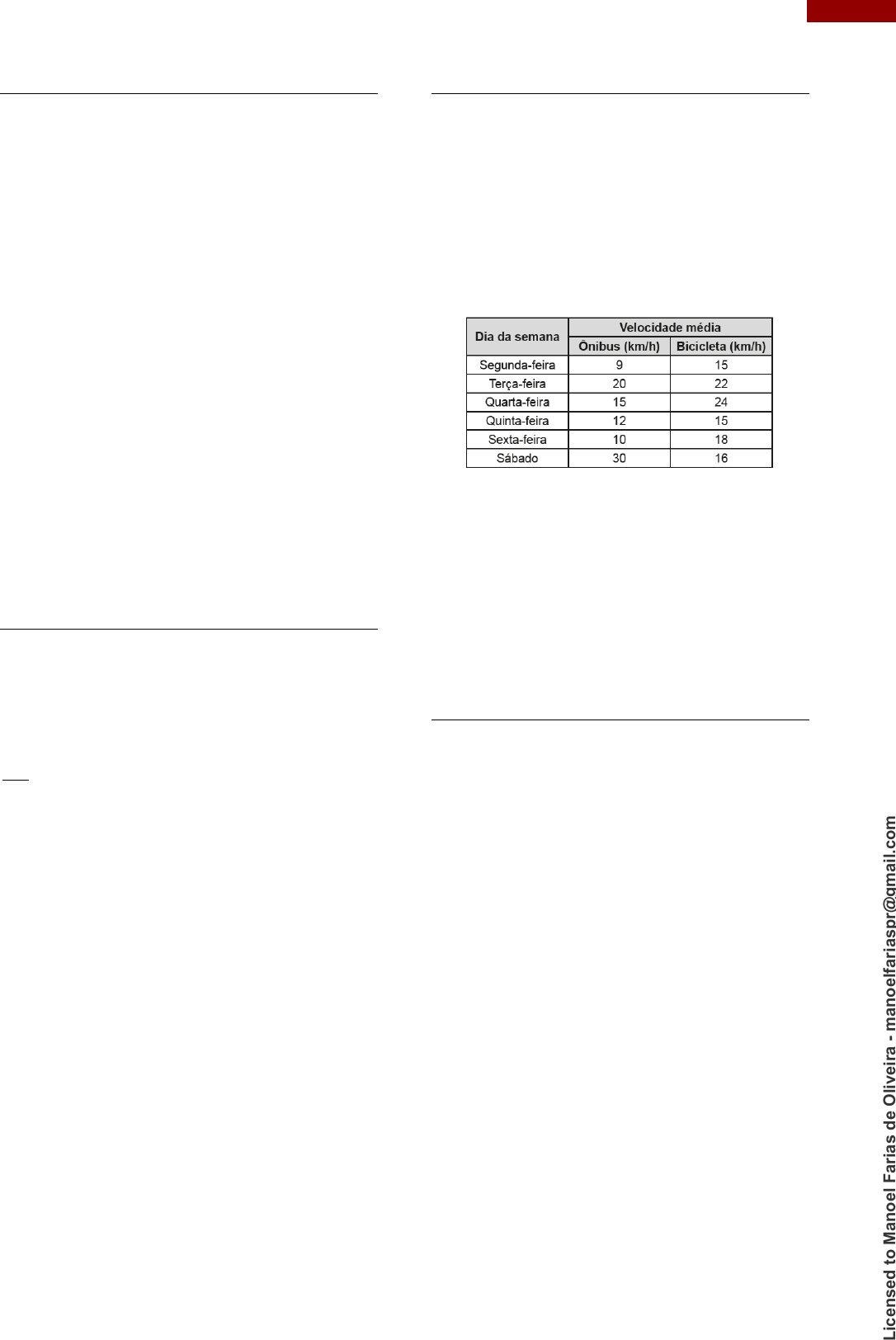 <p>68 ARITMÉTICA 2 – FRAÇÕES</p><p>QUESTÃO 5 (ENEM 2016 PPL)</p><p>Até novembro de 2011, não havia uma lei</p><p>específica que punisse fraude em concursos</p><p>públicos. Isso dificultava o enquadramento dos</p><p>fraudadores em algum artigo específico do Código</p><p>Penal, fazendo com que eles escapassem da</p><p>Justiça mais facilmente. Entretanto, com o</p><p>sancionamento da Lei 12.550/11, é considerado</p><p>crime utilizar ou divulgar indevidamente o conteúdo</p><p>sigiloso de concurso público, com pena de reclusão</p><p>de 12 a 48 meses (1 a 4 anos). Caso esse crime</p><p>seja cometido por um funcionário público, a pena</p><p>sofrerá um aumento de 1/3.</p><p>Disponível em: www.planalto.gov.br. Acesso em: 15 ago. 2012.</p><p>Se um funcionário público for condenado por</p><p>fraudar um concurso público, sua pena de reclusão</p><p>poderá variar de</p><p>A) 4 a 16 meses.</p><p>B) 16 a 52 meses.</p><p>C) 16 a 64 meses.</p><p>D) 24 a 60 meses.</p><p>E) 28 a 64 meses.</p><p>QUESTÃO 6 (ENEM 2016 PPL)</p><p>O ato de medir consiste em comparar duas</p><p>grandezas de mesma espécie. Para medir</p><p>comprimentos existem diversos sistemas de</p><p>medidas. O pé, a polegada e a jarda, por exemplo,</p><p>são unidades de comprimento utilizadas no Reino</p><p>Unido e nos Estados Unidos. Um pé corresponde a</p><p>1200</p><p>3937</p><p>metros ou doze polegadas, e três pés são uma</p><p>jarda.</p><p>Uma haste com 3 jardas, 2 pés e 6 polegadas tem</p><p>comprimento, em metro, mais próximo de</p><p>A) 1,0.</p><p>B) 3,5.</p><p>C) 10,0.</p><p>D) 22,9.</p><p>E) 25,3.</p><p>QUESTÃO 7 (ENEM 2020)</p><p>Para chegar à universidade, um estudante</p><p>utiliza um metrô e, depois, tem duas opções:</p><p> seguir num ônibus, percorrendo 2,0 km;</p><p> alugar uma bicicleta, ao lado da estação</p><p>do metrô, seguindo 3,0 km pela ciclovia.</p><p>O quadro fornece as velocidades médias do</p><p>ônibus e da bicicleta, em km/h, no trajeto metrô-</p><p>universidade.</p><p>A fim de poupar tempo no deslocamento para a</p><p>universidade, em quais dias o aluno deve seguir</p><p>pela ciclovia?</p><p>A) Às segundas, quintas e sextas-feiras.</p><p>B) Às terças e quintas-feiras e aos sábados.</p><p>C) Às segundas, quartas e sextas-feiras.</p><p>D) Às terças, quartas e sextas-feiras.</p><p>E) Às terças e quartas-feiras e aos sábados.</p><p>QUESTÃO 8 (ENEM 2020 DIGITAL)</p><p>Um jogo pedagógico é formado por cartas</p><p>nas quais está impressa uma fração em uma de</p><p>suas faces. Cada jogador recebe quatro cartas e</p><p>vence aquele que primeiro consegue ordenar</p><p>crescentemente suas cartas pelas respectivas</p><p>frações impressas. O vencedor foi o aluno que</p><p>recebeu as cartas com as frações: 3/5, 1/4, 2/3 e</p><p>5/9.</p><p>A ordem que esse aluno apresentou foi</p><p>A) 1/4, 5/9, 3/5, 2/3</p><p>B) 1/4, 2/3, 3/5, 5/9</p><p>C) 2/3, 1/4, 3/5, 2/3</p><p>D) 5/9, 1/4, 3/5, 2/3</p><p>E) 2/3, 3/5, 1/4, 5/9</p><p>L</p><p>ic</p><p>en</p><p>se</p><p>d</p><p>t</p><p>o</p><p>M</p><p>an</p><p>o</p><p>el</p><p>F</p><p>ar</p><p>ia</p><p>s</p><p>d</p><p>e</p><p>O</p><p>liv</p><p>ei</p><p>ra</p><p>-</p><p>m</p><p>an</p><p>o</p><p>el</p><p>fa</p><p>ri</p><p>as</p><p>p</p><p>r@</p><p>g</p><p>m</p><p>ai</p><p>l.c</p><p>o</p><p>m</p>