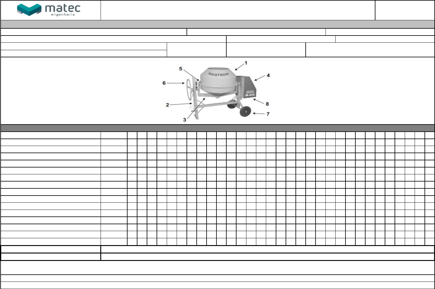 <p>Marca/Modelo: Identificação:</p><p>Aspectos Observados PERIODO 1 2 3 4 5 6 7 8 9 10 11 12 13 14 15 16 17 18 19 20 21 22 23 24 25 26 27 28 29 30 31</p><p>01 - Tambor Diário</p><p>02 - Cavalete Diário</p><p>03 - Braço do Basculante Diário</p><p>04 - Proteção do Motor Diário</p><p>05 - Cremalheira Diário</p><p>06 - Volante Tombador Diário</p><p>07 - Rodas Diário</p><p>08 - Motor Diário</p><p>09 - Plug Diário</p><p>10 - Fiação Diário</p><p>11 - Verificar partes quebradas ou cantos vivos Diário</p><p>Nome e Visto Operador</p><p>Nome e Visto Técnico de Segurança</p><p>GESTÃO DE SSMA SAÚDE, SEGURANÇA E MEIO AMBIENTE</p><p>FLIST.SEG.032.02</p><p>FLIST.SEG - Formulário CHECK LIST - Inspeção Diária - Betoneira</p><p>Aprovado por: Maria Cecilia Data: Revisão: 02</p><p>Mês/Ano:Unidade de Trabalho:Prepardo por: Thiago Camilo / Edmara Pinheiro</p><p>C= Conforme N/C = Não Conforme N/A = Não se Aplica</p><p>( ) Matec ( ) Terceiro: _______________________</p><p>Fabricante/Locador:</p><p>Observações:</p><p>Equipamento:</p>