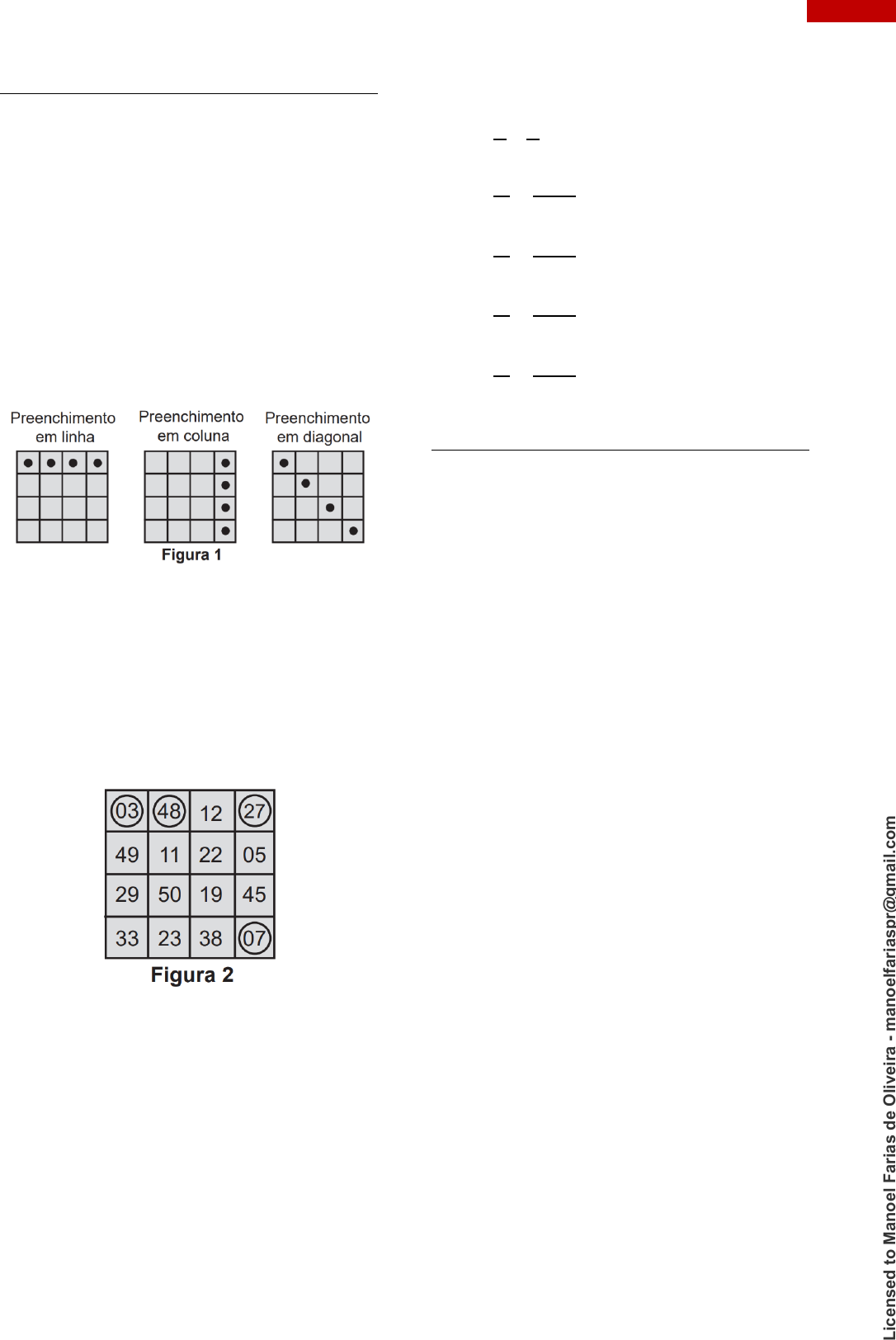<p>294 PROBABILIDADE</p><p>QUESTÃO 39 (ENEM 2022)</p><p>Em um jogo de bingo, as cartelas contêm</p><p>16 quadrículas dispostas em linhas e colunas.</p><p>Cada quadrícula tem impresso um número, dentre</p><p>os inteiros de 1 a 50, sem repetição de número. Na</p><p>primeira rodada, um número é sorteado,</p><p>aleatoriamente, dentre os 50 possíveis. Em todas</p><p>as rodadas, o número sorteado é descartado e não</p><p>participa dos sorteios das rodadas seguintes. Caso</p><p>o jogador tenha em sua cartela o número sorteado,</p><p>ele o assinala na cartela. Ganha o jogador que</p><p>primeiro conseguir preencher quatro quadrículas</p><p>que formam uma linha, uma coluna ou uma</p><p>diagonal, conforme os tipos de situações ilustradas</p><p>na Figura 1.</p><p>O jogo inicia e, nas quatro primeiras</p><p>rodadas, foram sorteados os seguintes números:</p><p>03, 27, 07 e 48. Ao final da quarta rodada, somente</p><p>Pedro possuía uma cartela que continha esses</p><p>quatro números sorteados, sendo que todos os</p><p>demais jogadores conseguiram assinalar, no</p><p>máximo, um desses números em suas cartelas.</p><p>Observe na Figura 2 o cartão de Pedro após as</p><p>quatro primeiras rodadas.</p><p>A probabilidade de Pedro ganhar o jogo em uma</p><p>das duas próximas rodadas é</p><p>A)</p><p>1</p><p>46</p><p>+</p><p>1</p><p>45</p><p>B)</p><p>1</p><p>46</p><p>+</p><p>2</p><p>46×45</p><p>C)</p><p>1</p><p>46</p><p>+</p><p>8</p><p>46×45</p><p>D)</p><p>1</p><p>46</p><p>+</p><p>43</p><p>46×45</p><p>E)</p><p>1</p><p>46</p><p>+</p><p>49</p><p>46×45</p><p>QUESTÃO 40 (ENEM 2022)</p><p>A World Series é a decisão do campeonato</p><p>norte-americano de beisebol. Os dois times que</p><p>chegam a essa fase jogam, entre si, até sete</p><p>partidas. O primeiro desses times que completar</p><p>quatro vitórias é declarado campeão.</p><p>Considere que, em todas as partidas, a</p><p>probabilidade de qualquer um dos dois times</p><p>vencer é sempre 1/2.</p><p>Qual é a probabilidade de o time campeão ser</p><p>aquele que venceu a primeira partida da World</p><p>Series?</p><p>A) 35/64</p><p>B) 40/64</p><p>C) 42/64</p><p>D) 44/64</p><p>E) 52/64</p><p>L</p><p>ic</p><p>en</p><p>se</p><p>d</p><p>t</p><p>o</p><p>M</p><p>an</p><p>o</p><p>el</p><p>F</p><p>ar</p><p>ia</p><p>s</p><p>d</p><p>e</p><p>O</p><p>liv</p><p>ei</p><p>ra</p><p>-</p><p>m</p><p>an</p><p>o</p><p>el</p><p>fa</p><p>ri</p><p>as</p><p>p</p><p>r@</p><p>g</p><p>m</p><p>ai</p><p>l.c</p><p>o</p><p>m</p>