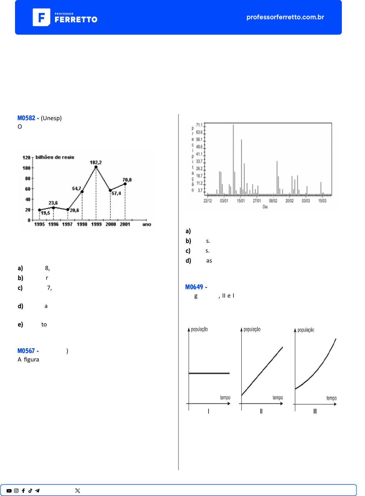 <p>Vestibulares</p><p>Estatística</p><p>Interpretação de Gráficos</p><p>M0582 - (Unesp)</p><p>O gráfico, publicado na "Folha de S. Paulo" de</p><p>16.08.2001, mostra os gastos (em bilhões de reais) do</p><p>governo federal com os juros da dívida pública.</p><p>Obs.: 2001 - es�ma�va até dezembro.</p><p>Pela análise do gráfico, pode-se afirmar que:</p><p>a) em 1998, o gasto foi de R$ 102,2 bilhões.</p><p>b) o menor gasto foi em 1996.</p><p>c) em 1997, houve redução de 20% nos gastos, em</p><p>relação a 1996.</p><p>d) a média dos gastos nos anos de 1999 e 2000 foi de</p><p>R$79,8 bilhões.</p><p>e) os gastos decresceram de 1997 a 1999.</p><p>M0567 - (Unicamp)</p><p>A figura abaixo mostra a precipitação pluviométrica em</p><p>milímetros por dia (mm/dia) durante o úl�mo verão em</p><p>Campinas. Se a precipitação ultrapassar 30 mm/dia, há</p><p>um determinado risco de alagamentos na região. De</p><p>acordo com o gráfico, quantos dias Campinas teve este</p><p>risco de alagamento?</p><p>a) 2 dias.</p><p>b) 4 dias.</p><p>c) 6 dias.</p><p>d) 10 dias.</p><p>M0649 - (Uff)</p><p>Os gráficos I, II e III, a seguir, esboçados em uma mesma</p><p>escala, ilustram modelos teóricos que descrevem a</p><p>população de três espécies de pássaros ao longo do</p><p>tempo.</p><p>Sabe-se que a população da espécie A aumenta 20% ao</p><p>ano, que a população da espécie B aumenta 100 pássaros</p><p>ao ano e que a população da espécie C permanece</p><p>estável ao longo dos anos.</p><p>1@professorferretto @prof_ferretto</p><p>Assim, a evolução das populações das espécies A, B e C,</p><p>ao longo do tempo, correspondem, respec�vamente, aos</p><p>gráficos</p><p>a) I, III e II.</p><p>b) II, I e III.</p><p>c) II, III e I.</p><p>d) III, I e II.</p><p>e) III, II e I.</p><p>M0580 - (Ufrn)</p><p>O Triatlo Olímpico é uma modalidade de compe�ção que</p><p>envolve três etapas. Na primeira etapa, os compe�dores</p><p>enfrentam 1,5 Km de natação em mar aberto; na</p><p>segunda etapa, eles percorrem 40 Km de corrida</p><p>ciclís�ca; e, na terceira etapa, par�cipam de uma meia</p><p>maratona de 10 km. O gráfico que melhor representa,</p><p>aproximadamente, a distância percorrida, em</p><p>quilômetros, por um atleta que completa a prova durante</p><p>as duas horas da compe�ção é:</p><p>a)</p><p>b)</p><p>c)</p><p>d)</p><p>M0572 - (U�a)</p><p>O gráfico representa uma projeção do valor de mercado,</p><p>v(t), de um imóvel, em função do tempo t, contado a</p><p>par�r da data de conclusão de sua construção,</p><p>considerada como a data inicial t = 0. O valor v(t) é</p><p>expresso em milhares de reais, e o tempo t, em anos.</p><p>2@professorferretto @prof_ferretto</p><p>Com base nesse gráfico, sobre o valor de mercado</p><p>projetado v(t), assinale a alterna�va INCORRETA:</p><p>a) Aos dez anos de construído, o imóvel terá valor</p><p>máximo.</p><p>b) No vigésimo quinto ano de construído, o imóvel terá</p><p>um valor maior que o inicial.</p><p>c) Em alguma data, o valor do imóvel corresponderá a</p><p>37,5% do seu valor inicial.</p><p>d) Ao completar vinte anos de construído, o imóvel</p><p>voltará a ter o mesmo valor inicial.</p><p>e) Se V(t) = 200 · 2 – (𝑡 - 10)2</p><p>100 , então, ao completar trinta</p><p>anos de construído, o valor do imóvel será igual na um</p><p>oitavo do seu valor inicial.</p><p>M0645 - (Espm)</p><p>O gráfico abaixo mostra a variação da quan �dade de</p><p>unidades vendidas por uma pe quena fábrica de pranchas</p><p>de surf, durante um ano.</p><p>De acordo com o gráfico, podemos concluir que o</p><p>aumento nas vendas do 2º trimestre para o 3º trimestre</p><p>foi de:</p><p>a) 10%</p><p>b) 15%</p><p>c) 20%</p><p>d) 25%</p><p>e) 30%</p><p>M1314 - (Fuvest)</p><p>Qual dos gráficos representa uma relação entre as</p><p>grandezas x e y em que y sempre diminui na medida em</p><p>que x aumenta?</p><p>3@professorferretto @prof_ferretto</p><p>a)</p><p>b)</p><p>c)</p><p>d)</p><p>e)</p><p>M1679 - (Professor Ferre�o)</p><p>Abaixo, os dois gráficos possuem informações que</p><p>representam o número de bolsas ofertadas pelo PROUNI</p><p>nos anos de 2009 e 2014.</p><p>De acordo com os Gráficos 1 e 2, é INCORRETO afirmar</p><p>que</p><p>a) todas as regiões aumentaram o número de bolsas</p><p>integrais no ano de 2014, comparado ao número de</p><p>2009.</p><p>b) se somarmos o número de bolsas parciais distribuídas</p><p>no ano de 2009, nas regiões Sul, Norte, Nordeste e</p><p>Centro-Oeste, o valor é inferior ao número de bolsas</p><p>distribuídas pela região Sudeste no mesmo ano.</p><p>c) comparando o número de bolsas integrais ofertadas</p><p>na região Sul nos anos de 2009 e 2014, percebe-se que</p><p>esse número aumentou aproximadamente 48%.</p><p>d) todas as regiões aumentaram o número de bolsas</p><p>parciais no ano de 2014, comparado ao número em</p><p>2009.</p><p>e) A região Sudeste é a região com maior número de</p><p>bolsas ofertadas.</p><p>M0556 - (Unesp)</p><p>No gráfico estão representadas as curvas �picas de</p><p>velocidade de crescimento, em cm/ano, em função da</p><p>idade, em anos, para meninos e meninas de 0 a 20 anos</p><p>de idade. Estão indicados, também, para os dois gêneros,</p><p>trechos de aceleração e desaceleração do crescimento e</p><p>os pontos de início do es�rão da adolescência e de</p><p>término de crescimento.</p><p>4@professorferretto @prof_ferretto</p><p>Considerando apenas as informações con�das no gráfico,</p><p>é correto afirmar que:</p><p>a) após o período de aceleração no crescimento, tanto os</p><p>meninos quanto as meninas param de crescer.</p><p>b) as meninas a�ngem sua maior estatura por volta dos</p><p>12 anos de idade e os meninos, por volta dos 14 anos</p><p>de idade.</p><p>c) se um menino e uma menina nascem com a mesma</p><p>estatura, ao final do período de crescimento eles</p><p>também terão