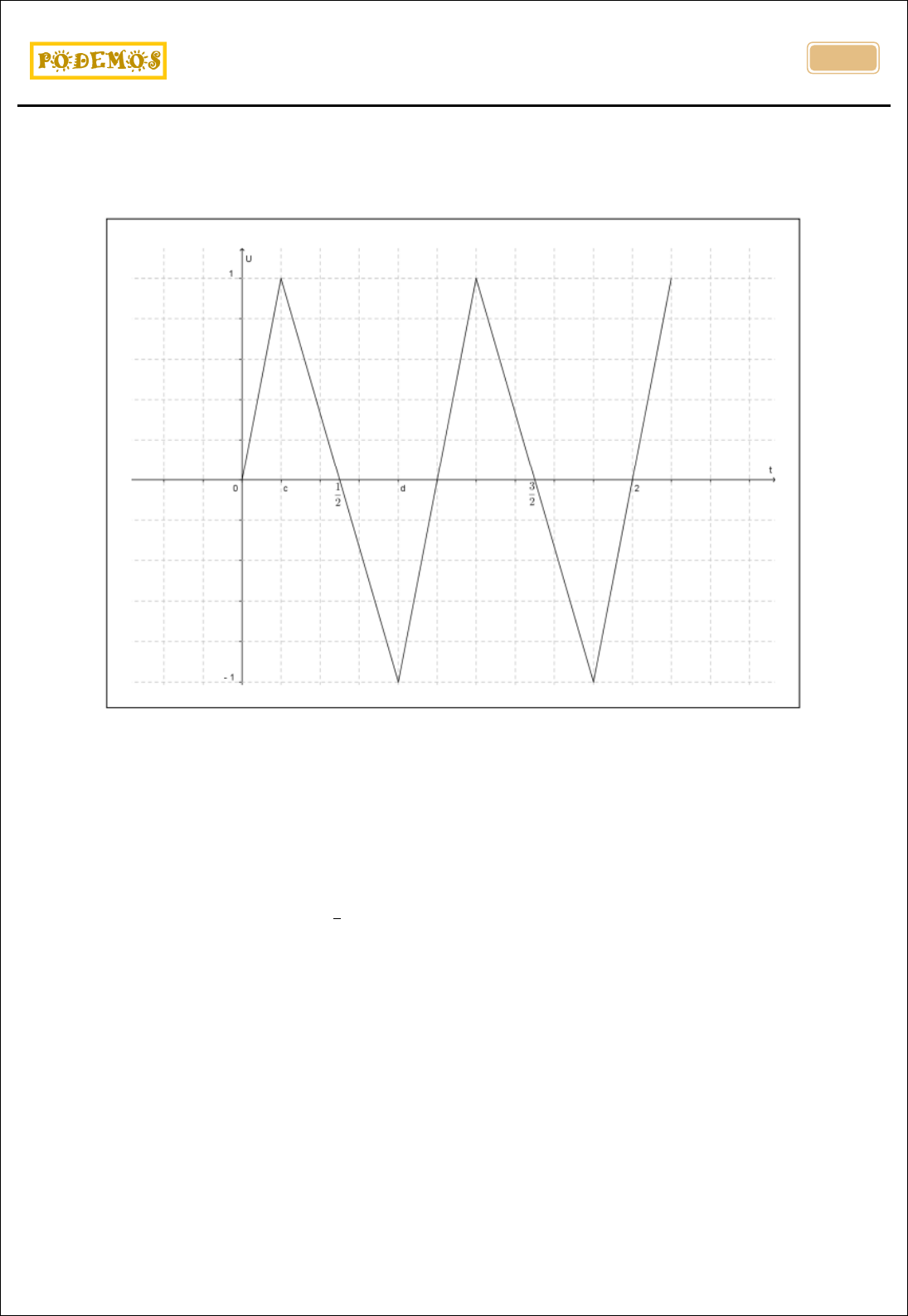 <p>UFJF: PISM, Vestibulares e Concursos</p><p>Prof. Otávio Luciano Camargo Sales de Magalhães</p><p>.</p><p>300</p><p>6)(Vestibular Seriado – PISM / UFJF – Triênio 2014/2016 – 1º ano do Ensino Médio – 2015) Uma função</p><p>𝑓 é dita periódica de período 𝑝, se existe um menor número real positivo 𝑝 tal que 𝑓(𝑡) = 𝑓(𝑡 + 𝑝), para todo</p><p>𝑡 no domínio de 𝑓. Alguns fenômenos naturais, tais como as ondas sonoras e as ondas eletromagnéticas,</p><p>podem ser descritas por funções periódicas. O gráfico a seguir representa um desses fenômenos, a tensão</p><p>U: [0, +∞) → IR em função do tempo 𝑡.</p><p>A partir da análise do gráfico dessa função, responda cada questão abaixo, justificando suas respostas.</p><p>a) Após d unidades de tempo, há instantes em que a tensão é zero no intervalo [d,3]? Em caso afirmativo,</p><p>quais?</p><p>b) Determine uma expressão para U(t) no intervalo 0 ≤ t ≤ c e outra expressão para U(t) no intervalo c ≤ t ≤</p><p>d.</p><p>b) Para quais valores de t∈[0,c] temos</p><p>1</p><p>2</p><p>≤ U(t) ≤ 1 ?</p><p>d) Determine o período da função U(t). Em quais instantes a tensão é mínima?</p>