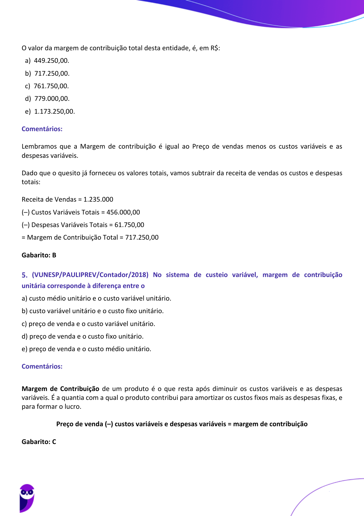 <p>O valor da margem de contribuição total desta entidade, é, em R$:</p><p>a) 449.250,00.</p><p>b) 717.250,00.</p><p>c) 761.750,00.</p><p>d) 779.000,00.</p><p>e) 1.173.250,00.</p><p>Comentários:</p><p>Lembramos que a Margem de contribuição é igual ao Preço de vendas menos os custos variáveis e as</p><p>despesas variáveis.</p><p>Dado que o quesito já forneceu os valores totais, vamos subtrair da receita de vendas os custos e despesas</p><p>totais:</p><p>Receita de Vendas = 1.235.000</p><p>(–) Custos Variáveis Totais = 456.000,00</p><p>(–) Despesas Variáveis Totais = 61.750,00</p><p>= Margem de Contribuição Total = 717.250,00</p><p>Gabarito: B</p><p>(VUNESP/PAULIPREV/Contador/2018) No sistema de custeio variável, margem de contribuição</p><p>unitária corresponde à diferença entre o</p><p>a) custo médio unitário e o custo variável unitário.</p><p>b) custo variável unitário e o custo fixo unitário.</p><p>c) preço de venda e o custo variável unitário.</p><p>d) preço de venda e o custo fixo unitário.</p><p>e) preço de venda e o custo médio unitário.</p><p>Comentários:</p><p>Margem de Contribuição de um produto é o que resta após diminuir os custos variáveis e as despesas</p><p>variáveis. É a quantia com a qual o produto contribui para amortizar os custos fixos mais as despesas fixas, e</p><p>para formar o lucro.</p><p>Preço de venda (–) custos variáveis e despesas variáveis = margem de contribuição</p><p>Gabarito: C</p><p>Luciano Rosa, Júlio Cardozo</p><p>Aula 05</p><p>SEFAZ-MG (Auditor Fiscal - área Auditoria e Fiscalização) Contabilidade de Custos - 2022 (Pós-Edital) (Prof Julio e Luciano)</p><p>www.estrategiaconcursos.com.br</p><p>68857100346813379 - Naiara Braz Sidrim Nogueira</p><p>18</p><p>200</p>