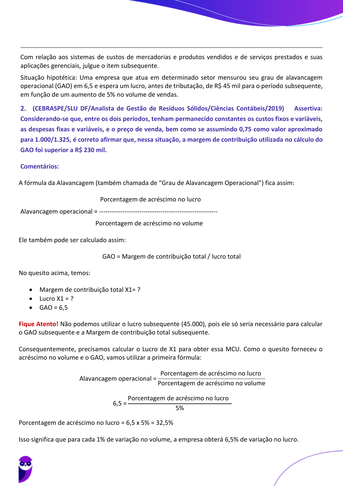 <p>Com relação aos sistemas de custos de mercadorias e produtos vendidos e de serviços prestados e suas</p><p>aplicações gerenciais, julgue o item subsequente.</p><p>Situação hipotética: Uma empresa que atua em determinado setor mensurou seu grau de alavancagem</p><p>operacional (GAO) em 6,5 e espera um lucro, antes de tributação, de R$ 45 mil para o período subsequente,</p><p>em função de um aumento de 5% no volume de vendas.</p><p>(CEBRASPE/SLU DF/Analista de Gestão de Resíduos Sólidos/Ciências Contábeis/2019) Assertiva:</p><p>Considerando-se que, entre os dois períodos, tenham permanecido constantes os custos fixos e variáveis,</p><p>as despesas fixas e variáveis, e o preço de venda, bem como se assumindo 0,75 como valor aproximado</p><p>para 1.000/1.325, é correto afirmar que, nessa situação, a margem de contribuição utilizada no cálculo do</p><p>GAO foi superior a R$ 230 mil.</p><p>Comentários:</p><p>A fórmula da Alavancagem (também chamada de “Grau de Alavancagem Operacional”) fica assim:</p><p>Porcentagem de acréscimo no lucro</p><p>Alavancagem operacional = --------------------------------------------------------</p><p>Porcentagem de acréscimo no volume</p><p>Ele também pode ser calculado assim:</p><p>GAO = Margem de contribuição total / lucro total</p><p>No quesito acima, temos:</p><p>• Margem de contribuição total X1= ?</p><p>• Lucro X1 = ?</p><p>• GAO = 6,5</p><p>Fique Atento! Não podemos utilizar o lucro subsequente (45.000), pois ele só seria necessário para calcular</p><p>o GAO subsequente e a Margem de contribuição total subsequente.</p><p>Consequentemente, precisamos calcular o Lucro de X1 para obter essa MCU. Como o quesito forneceu o</p><p>acréscimo no volume e o GAO, vamos utilizar a primeira fórmula:</p><p>Alavancagem operacional =</p><p>Porcentagem de acréscimo no lucro</p><p>Porcentagem de acréscimo no volume</p><p>6,5 =</p><p>Porcentagem de acréscimo no lucro</p><p>5%</p><p>Porcentagem de acréscimo no lucro = 6,5 x 5% = 32,5%</p><p>Isso significa que para cada 1% de variação no volume, a empresa obterá 6,5% de variação no lucro.</p><p>Luciano Rosa, Júlio Cardozo</p><p>Aula 05</p><p>SEFAZ-MG (Auditor Fiscal - área Auditoria e Fiscalização) Contabilidade de Custos - 2022 (Pós-Edital) (Prof Julio e Luciano)</p><p>www.estrategiaconcursos.com.br</p><p>68857100346813379 - Naiara Braz Sidrim Nogueira</p><p>144</p><p>200</p>