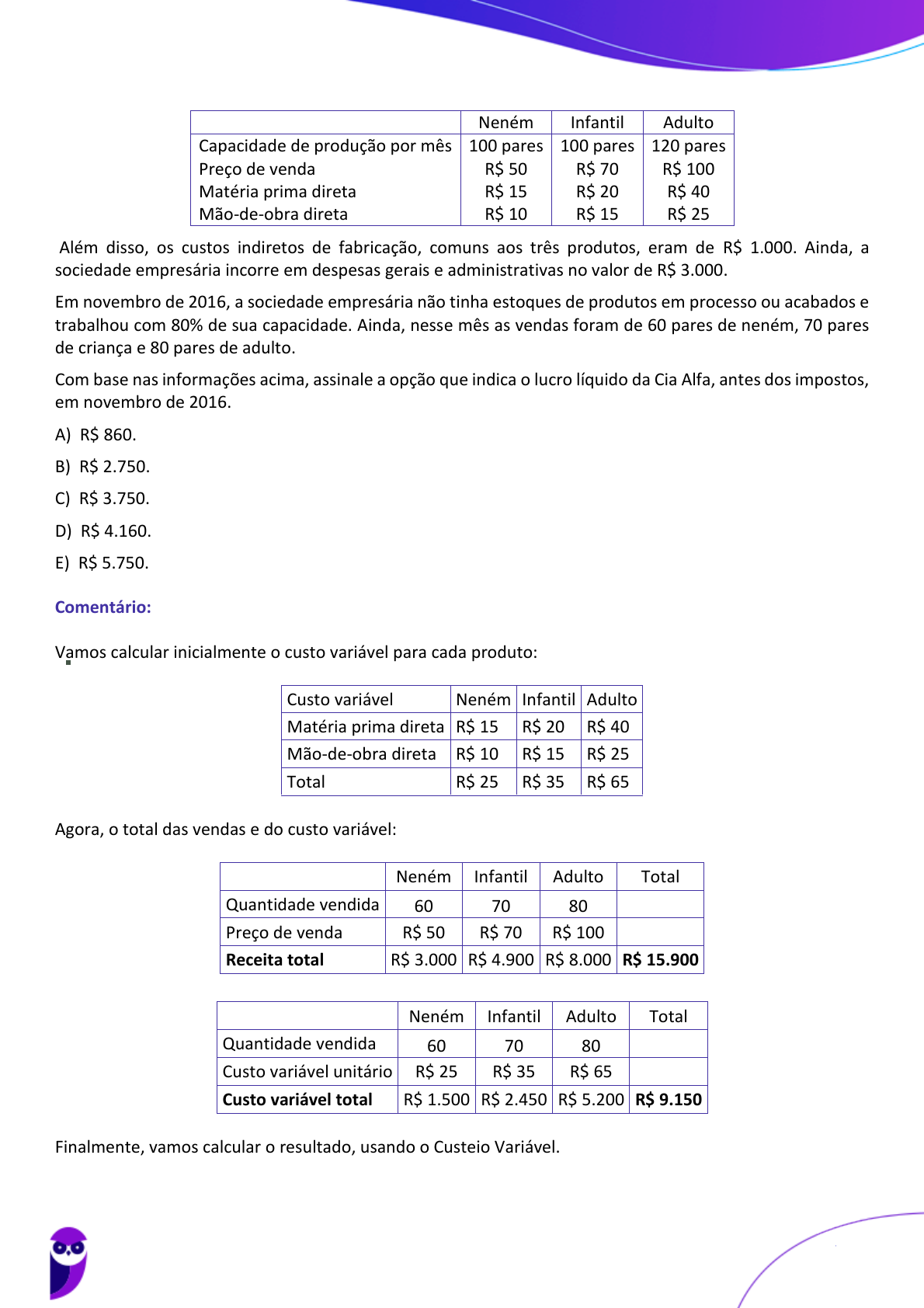 <p>Neném Infantil Adulto</p><p>Capacidade de produção por mês</p><p>Preço de venda</p><p>Matéria prima direta</p><p>Mão-de-obra direta</p><p>100 pares</p><p>R$ 50</p><p>R$ 15</p><p>R$ 10</p><p>100 pares</p><p>R$ 70</p><p>R$ 20</p><p>R$ 15</p><p>120 pares</p><p>R$ 100</p><p>R$ 40</p><p>R$ 25</p><p>Além disso, os custos indiretos de fabricação, comuns aos três produtos, eram de R$ 1.000. Ainda, a</p><p>sociedade empresária incorre em despesas gerais e administrativas no valor de R$ 3.000.</p><p>Em novembro de 2016, a sociedade empresária não tinha estoques de produtos em processo ou acabados e</p><p>trabalhou com 80% de sua capacidade. Ainda, nesse mês as vendas foram de 60 pares de neném, 70 pares</p><p>de criança e 80 pares de adulto.</p><p>Com base nas informações acima, assinale a opção que indica o lucro líquido da Cia Alfa, antes dos impostos,</p><p>em novembro de 2016.</p><p>A) R$ 860.</p><p>B) R$ 2.750.</p><p>C) R$ 3.750.</p><p>D) R$ 4.160.</p><p>E) R$ 5.750.</p><p>Comentário:</p><p>Vamos calcular inicialmente o custo variável para cada produto:</p><p>Custo variável Neném Infantil Adulto</p><p>Matéria prima direta R$ 15 R$ 20 R$ 40</p><p>Mão-de-obra direta R$ 10 R$ 15 R$ 25</p><p>Total R$ 25 R$ 35 R$ 65</p><p>Agora, o total das vendas e do custo variável:</p><p>Neném Infantil Adulto Total</p><p>Quantidade vendida 60 70 80</p><p>Preço de venda R$ 50 R$ 70 R$ 100</p><p>Receita total R$ 3.000 R$ 4.900 R$ 8.000 R$ 15.900</p><p>Neném Infantil Adulto Total</p><p>Quantidade vendida 60 70 80</p><p>Custo variável unitário R$ 25 R$ 35 R$ 65</p><p>Custo variável total R$ 1.500 R$ 2.450 R$ 5.200 R$ 9.150</p><p>Finalmente, vamos calcular o resultado, usando o Custeio Variável.</p><p>Luciano Rosa, Júlio Cardozo</p><p>Aula 05</p><p>SEFAZ-MG (Auditor Fiscal - área Auditoria e Fiscalização) Contabilidade de Custos - 2022 (Pós-Edital) (Prof Julio e Luciano)</p><p>www.estrategiaconcursos.com.br</p><p>68857100346813379 - Naiara Braz Sidrim Nogueira</p><p>24</p><p>200</p>
