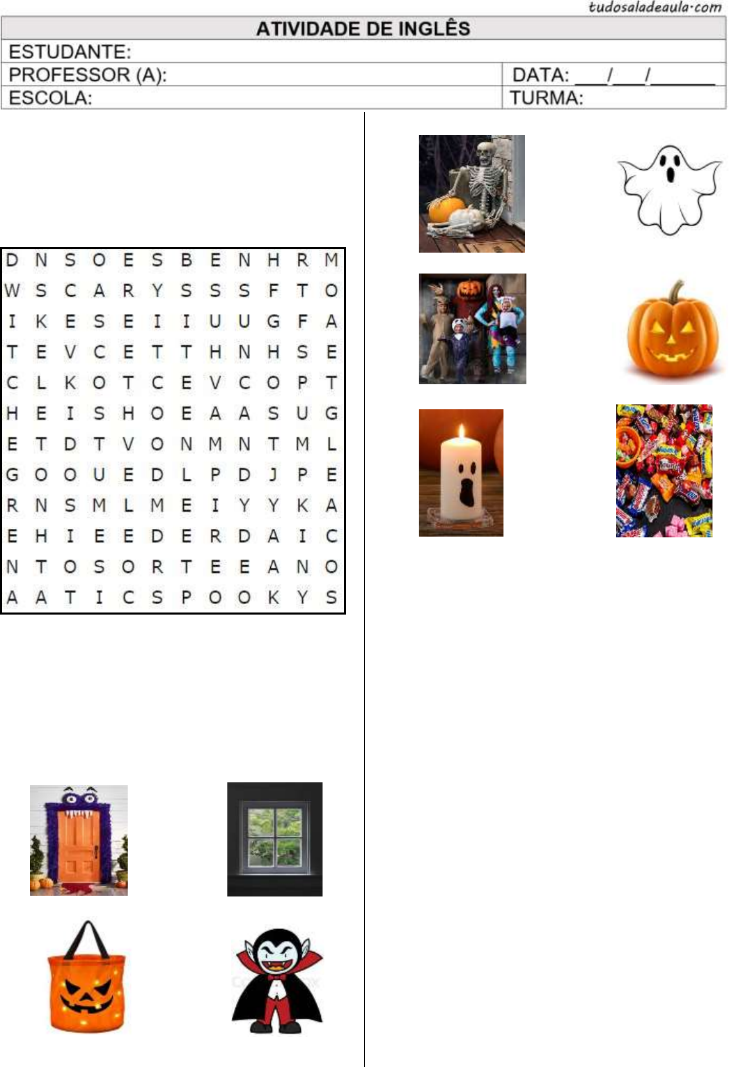 <p>1. Busque as seguintes palavras no caça-palavras</p><p>relacionadas ao Halloween.</p><p>Candle – Candy – Costumes – Ghost – Holiday –</p><p>Kid – Pumpkin – Scary – Skeleton - Spooky –</p><p>Vampire - Witch</p><p>2. Associe as palavras com as imagens fornecidas.</p><p>(A) Candle (B) Candy</p><p>(C) Candy bag (D) Costumes</p><p>(E) Door (F) Ghost</p><p>(G) Jack-o'-lantern (H) Skeleton</p><p>( I ) Vampire (J) Window</p><p>( ) ( )</p><p>( ) ( )</p><p>( ) ( )</p><p>( ) ( )</p><p>( ) ( )</p><p>3. Relacione a 2° coluna de acordo com os</p><p>significados da 1°.</p><p>(A) Candle ( ) Porta</p><p>(B) Candy ( ) Doces</p><p>(C) Candy bag ( ) Saco de doces</p><p>(D) Costumes ( ) Esqueleto</p><p>(E) Door ( ) Fantasma</p><p>(F) Ghost ( ) Criança</p><p>(G) Holiday ( ) Feriado</p><p>(H) Kid ( ) Bruxa</p><p>(I) Pumpkin ( ) Vela</p><p>(J) Scary ( ) Doce ou travessura</p><p>(K) Skeleton ( ) Vampiro</p><p>(L) Spooky ( ) Trajes</p><p>(M) Trick-or-treat ( ) Assustador</p><p>(N) Vampire ( ) Assombrado</p><p>(O) Witch ( ) Abóbora</p><p>Leia o texto abaixo e responda as questões (4-12).</p><p>Halloween: A Spooky Night of Fun</p><p>Halloween is a magical and mysterious holiday that</p><p>takes place on October 31st. Many people also call it</p><p>the Day of the Witches. It's a day full of fun, where</p><p>kids dress up in scary costumes like witches, ghosts,</p><p>vampires, and skeletons. Adults join in too, wearing</p><p>eerie outfits and decorating their homes with</p><p>pumpkins.</p><p>One of the coolest things about Halloween is the</p><p>tradition of "trick-or-treat." Children go out at night</p><p>with empty bags and knock on doors, asking for</p><p>candy. When someone opens the door, they say</p><p>"trick-or-treat" and, in return, they get delicious treats.</p><p>It's a fun way to fill up your candy bag.</p><p>A very common Halloween decoration is the "jack-o'-</p><p>lantern," which is a pumpkin carved with a spooky</p><p>face and a lit candle inside. Jack-o'-lanterns are</p><p>placed in windows and on porches to ward off evil</p><p>spirits.</p><p>Furthermore, Halloween parties are filled with</p><p>exciting games, like bobbing for apples, where you</p><p>try to catch apples with your teeth, and apple</p><p>bobbing, where you attempt to catch floating apples</p><p>with your hands tied behind your back.</p><p>At night, many people tell scary ghost stories and</p><p>watch horror movies. It's a chilling tradition but also a</p><p>lot of fun.</p><p>So, on Halloween, put on your scariest costume, grab</p><p>your candy bag, and have a blast going door-to-door</p><p>for "trick-or-treat." And remember to always be safe</p><p>and not scare anyone too much! Halloween is a night</p><p>of fun and frights, but also one of respect and good</p><p>laughs. Happy Halloween!</p><p>Tudo Sala de Aula / 2023</p><p>4. Leia a seguinte frase retirada do texto e selecione</p><p>a alternativa que oferece a tradução correta:</p><p>"Halloween parties are filled with exciting games."</p><p>a) As festas de Halloween são cheias de jogos</p><p>entediantes.</p><p>b) As festas de Halloween são repletas de jogos</p><p>emocionantes.</p><p>c) As festas de Halloween são cheias de decorações</p><p>assustadoras.</p><p>d) As festas de Halloween são repletas de fantasias</p><p>criativas.</p><p>5. Na passagem: “It's a day full of fun, where kids</p><p>dress up in scary costumes like witches”. Levando</p><p>em consideração a expressão “full of fun”, marque a</p><p>alternativa com a tradução correta.</p><p>a) Cheio de susto.</p><p>b) Cheio de doces.</p><p>c) Cheio de fantasias.</p><p>d) Cheio de diversão.</p><p>6. Utilizando a frase da questão anterior (5ª), marque</p><p>o item que se refere à expressão “Dress up”.</p><p>a) Preparar-se para dormir.</p><p>b) Vestir-se com roupas comuns.</p><p>c) Vestir-se com fantasias.</p><p>d) Decorar a casa.</p><p>7. De acordo com o texto, quando ocorre o</p><p>Halloween e qual é o outro nome comum para este</p><p>feriado?</p><p>_________________________________________</p><p>_________________________________________</p><p>_________________________________________</p><p>_________________________________________</p><p>8. Quais são alguns exemplos de fantasias que as</p><p>crianças usam no Halloween?</p><p>_________________________________________</p><p>_________________________________________</p><p>_________________________________________</p><p>_________________________________________</p><p>9. Do que se trata a tradição "trick-or-treat"?</p><p>_________________________________________</p><p>_________________________________________</p><p>_________________________________________</p><p>_________________________________________</p><p>10. Uma decoração comum é a "jack-o'-lantern". Do</p><p>que se trata essa decoração e o que ela representa?</p><p>_________________________________________</p><p>_________________________________________</p><p>_________________________________________</p><p>_________________________________________</p><p>11. O que as pessoas fazem à noite no Halloween?</p><p>_________________________________________</p><p>_________________________________________</p><p>_________________________________________</p><p>_________________________________________</p><p>12. Localize no texto a mensagem com orientações</p><p>para as pessoas durante as comemorações no</p><p>Halloween. (Escreva em inglês)</p><p>_________________________________________</p><p>_________________________________________</p><p>_________________________________________</p><p>_________________________________________</p>
