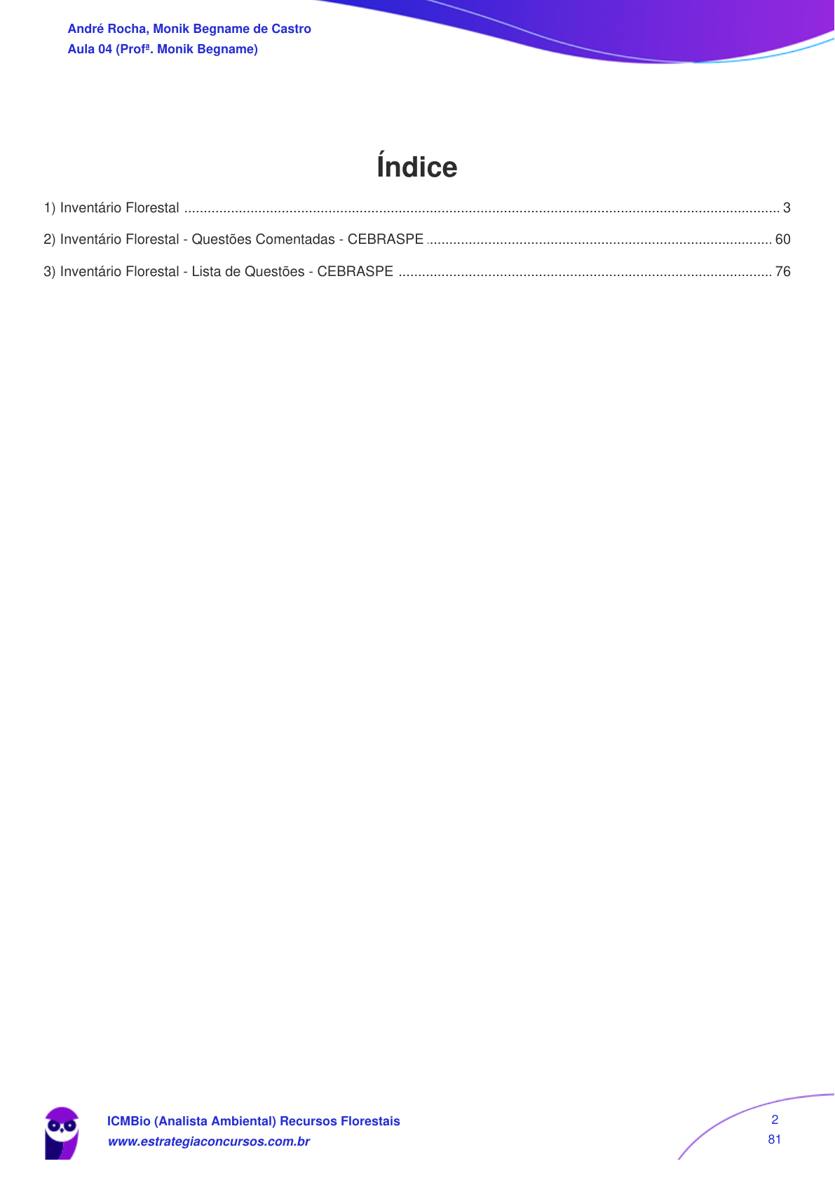 <p>André Rocha, Monik Begname de Castro</p><p>Aula 04 (Profª. Monik Begname)</p><p>Índice</p><p>..............................................................................................................................................................................................1) Inventário Florestal 3</p><p>..............................................................................................................................................................................................2) Inventário Florestal - Questões Comentadas - CEBRASPE 60</p><p>..............................................................................................................................................................................................3) Inventário Florestal - Lista de Questões - CEBRASPE 76</p><p>ICMBio (Analista Ambiental) Recursos Florestais</p><p>www.estrategiaconcursos.com.br</p><p>2</p><p>81</p><p>Adquira uma Assinatura em @Xinyuu_bot - Telegram</p><p>1</p><p>INVENTÁRIO FLORESTAL</p><p>Olá, Estrategistas!</p><p>Nesta aula iremos estudar sobre o Inventário Florestal. Antes de darmos início a nossa aula, gostaria</p><p>de fazer uma observação: a disciplina de inventário florestal envolve muitos cálculos, porém, em provas,</p><p>aparecem com menor frequência e há um padrão de quais cálculos são mais cobrados. Portanto, o principal</p><p>foco deve ser a teoria e irei avisá-los quando os cálculos forem importantes.</p><p>Espero que estejam animados! Vamos lá?</p><p>O inventário florestal consiste no uso de fundamentos da teoria de amostragem para determinar ou</p><p>estimar características quantitativas ou qualitativas da floresta1.</p><p>Os inventários florestais2 podem ser definidos da seguinte maneira:</p><p>“são procedimentos para obter informações sobre quantidades e qualidades dos recursos</p><p>florestais e de muitas características das áreas sobre as quais as árvores estão crescendo”.</p><p>Embora existam inúmeros procedimentos, um inventário florestal completo pode fornecer diversas</p><p>informações, entre elas:</p><p>a. Estimativas de área.</p><p>b. Descrição da topografia.</p><p>1 SCOLFORO, J. R. S.; MELLO, J. M. Inventário florestal. Lavras: UFLA/FAEPE, 1997. 341 p.</p><p>2 HUSCH, B.; MILLER, C.I; KERSHAW, J. Forest mensuration. 4. ed. New Jersey: John Willey e Sons, Inc, 2003. 443 p.</p><p>Características</p><p>Quantitativas</p><p>Volume, área basal, altura,</p><p>densidade, diâmetro médio</p><p>quadrático, dentre outros.</p><p>Qualitativas</p><p>Vitalidade das árvores,</p><p>qualidade do fuste,</p><p>tendência de valorização,</p><p>etc.</p><p>André Rocha, Monik Begname de Castro</p><p>Aula 04 (Profª. Monik Begname)</p><p>ICMBio (Analista Ambiental) Recursos Florestais</p><p>www.estrategiaconcursos.com.br</p><p>3</p><p>81</p><p>Adquira uma Assinatura em @Xinyuu_bot - Telegram</p><p>2</p><p>c. Mapeamento da propriedade.</p><p>d. Descrição de acessos (estradas, rios, ...).</p><p>e. Facilidade de transporte de madeira.</p><p>f. Estimativas da quantidade e da qualidade de diferentes recursos florestais.</p><p>g. Estimativas de crescimento (se o inventário for realizado mais de uma vez).</p><p>Informações adicionais sobre fauna, recursos hídricos, entre outras, podem ser coletadas, quando</p><p>necessárias. A ênfase sobre determinado elemento no inventário florestal será maior ou menor, em função</p><p>dos seus objetivos.</p><p>Para que um procedimento de inventário tenha sucesso é importante elaborar um bom planejamento</p><p>das atividades a serem desenvolvidas ao longo do inventário. A seguir, apresentarei um checklist das</p><p>principais atividades que devem ser consideradas no planejamento de um inventário por amostragem. No</p><p>entanto, cabe ressaltar que os itens abaixo nem sempre terão a mesma importância ou estarão em todos os</p><p>levantamentos florestais3:</p><p>Atividade Descrição</p><p>1° Objetivos do inventário Quantificar o estoque presente de madeira; acompanhar o crescimento da floresta, etc.</p><p>2° Informações iniciais</p><p>a. Mapas, fotografias aéreas e levantamentos passados.</p><p>b. Indivíduos ou organização do suporte do inventário.</p><p>c. Disponibilidade de recursos.</p><p>3°. Descrição da área</p><p>a. Localização.</p><p>b. Tamanho (hectares).</p><p>c. Facilidade de transporte, acesso e topografia.</p><p>d. Características gerais das florestas.</p><p>4°. Definição do desenho de</p><p>amostragem</p><p>a. Determinação da área coberta por floresta (por meio de imagens, fotos e medições em</p><p>campo).</p><p>b. Definição da variável de interesse: peso ou volume; e unidades: m³, kg, st, ...</p><p>c. Tamanho e forma das unidades amostrais.</p><p>d. Método de seleção e distribuição das unidades de amostra.</p><p>e. Precisão requerida no inventário (erro admissível).</p><p>f. Nível de probabilidade.</p><p>g. Tamanho da amostra para satisfazer a precisão requerida (inventário piloto).</p><p>h. Tempo e custo para as fases do trabalho de campo (alocação de parcelas, determinação</p><p>da área etc.</p><p>5°. Procedimentos para o</p><p>trabalho de campo</p><p>a. Equipes de trabalho (número de equipes e de pessoas por equipe).</p><p>3 SOARES, C.P.B.; PAULA NETO, F.; SOUZA, A.L. Dendrometria e Inventario Florestal. Viçosa: Editora UFV, 2006. 276p.</p><p>André Rocha, Monik Begname de Castro</p><p>Aula 04 (Profª. Monik Begname)</p><p>ICMBio (Analista Ambiental) Recursos Florestais</p><p>www.estrategiaconcursos.com.br</p><p>4</p><p>81</p><p>Adquira uma Assinatura em @Xinyuu_bot - Telegram</p><p>3</p><p>b. Suporte logístico e de transporte.</p><p>c. Procedimento de locação e marcação das unidades amostrais.</p><p>d. Procedimentos para obtenção das informações quantitativas (DAP, altura, ...) e</p><p>qualitativas.</p><p>e. Instrumentos e equipamentos.</p><p>f. Planilhas e fichas para anotação dos dados e in