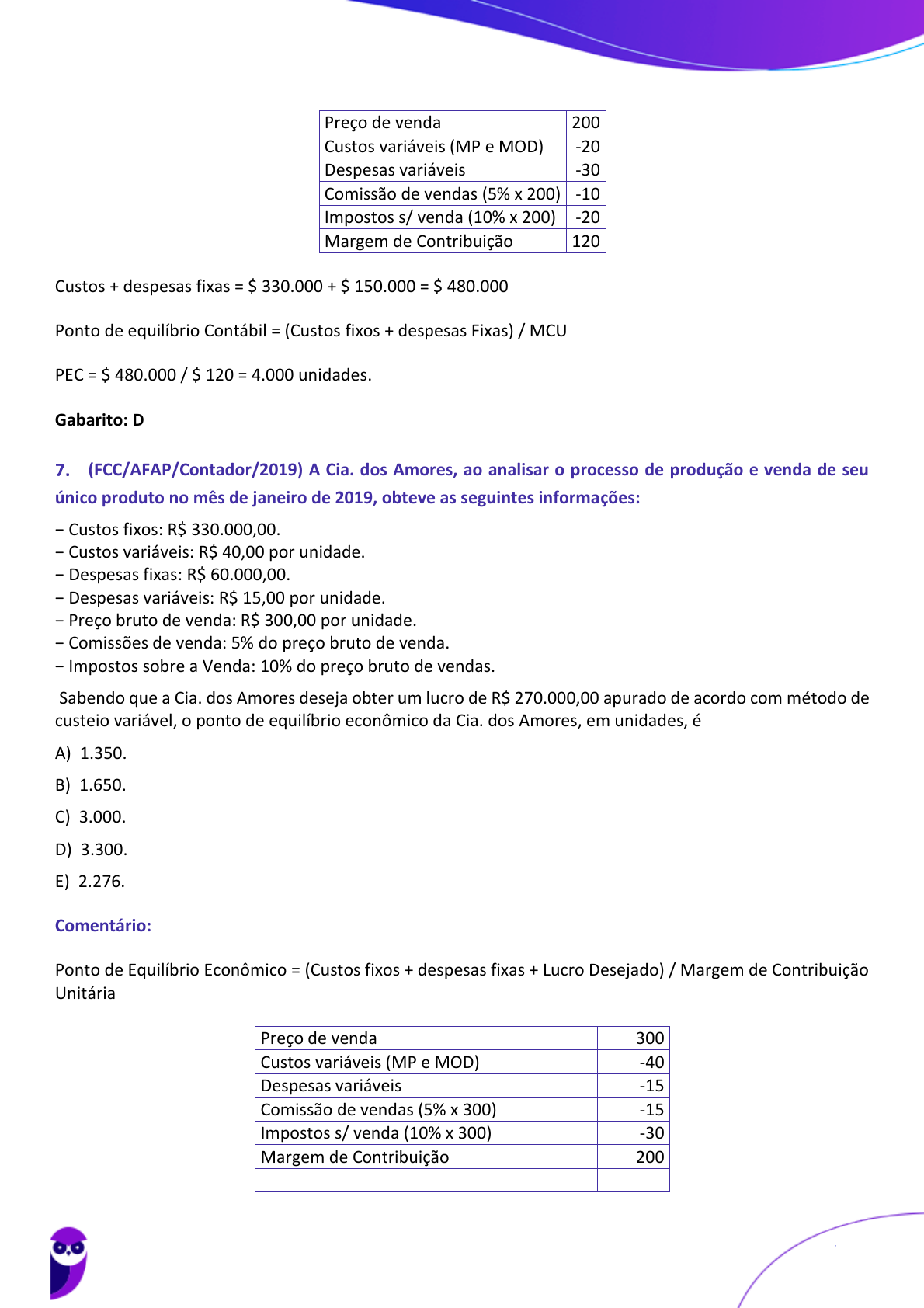 <p>Preço de venda 200</p><p>Custos variáveis (MP e MOD) -20</p><p>Despesas variáveis -30</p><p>Comissão de vendas (5% x 200) -10</p><p>Impostos s/ venda (10% x 200) -20</p><p>Margem de Contribuição 120</p><p>Custos + despesas fixas = $ 330.000 + $ 150.000 = $ 480.000</p><p>Ponto de equilíbrio Contábil = (Custos fixos + despesas Fixas) / MCU</p><p>PEC = $ 480.000 / $ 120 = 4.000 unidades.</p><p>Gabarito: D</p><p>(FCC/AFAP/Contador/2019) A Cia. dos Amores, ao analisar o processo de produção e venda de seu</p><p>único produto no mês de janeiro de 2019, obteve as seguintes informações:</p><p>− Custos fixos: R$ 330.000,00.</p><p>− Custos variáveis: R$ 40,00 por unidade.</p><p>− Despesas fixas: R$ 60.000,00.</p><p>− Despesas variáveis: R$ 15,00 por unidade.</p><p>− Preço bruto de venda: R$ 300,00 por unidade.</p><p>− Comissões de venda: 5% do preço bruto de venda.</p><p>− Impostos sobre a Venda: 10% do preço bruto de vendas.</p><p>Sabendo que a Cia. dos Amores deseja obter um lucro de R$ 270.000,00 apurado de acordo com método de</p><p>custeio variável, o ponto de equilíbrio econômico da Cia. dos Amores, em unidades, é</p><p>A) 1.350.</p><p>B) 1.650.</p><p>C) 3.000.</p><p>D) 3.300.</p><p>E) 2.276.</p><p>Comentário:</p><p>Ponto de Equilíbrio Econômico = (Custos fixos + despesas fixas + Lucro Desejado) / Margem de Contribuição</p><p>Unitária</p><p>Preço de venda 300</p><p>Custos variáveis (MP e MOD) -40</p><p>Despesas variáveis -15</p><p>Comissão de vendas (5% x 300) -15</p><p>Impostos s/ venda (10% x 300) -30</p><p>Margem de Contribuição 200</p><p>Luciano Rosa, Júlio Cardozo</p><p>Aula 05</p><p>SEFAZ-MG (Auditor Fiscal - área Auditoria e Fiscalização) Contabilidade de Custos - 2022 (Pós-Edital) (Prof Julio e Luciano)</p><p>www.estrategiaconcursos.com.br</p><p>68857100346813379 - Naiara Braz Sidrim Nogueira</p><p>75</p><p>200</p>