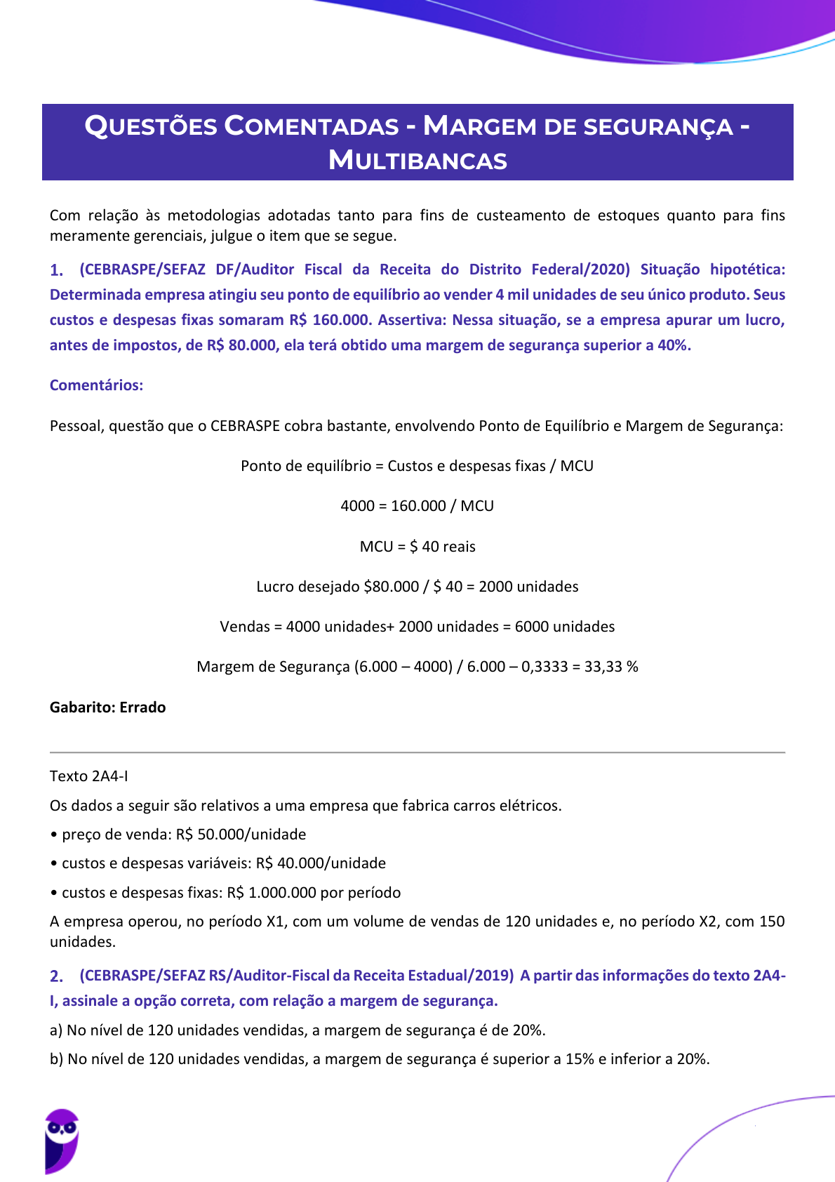 <p>QUESTÕES COMENTADAS - MARGEM DE SEGURANÇA -</p><p>MULTIBANCAS</p><p>Com relação às metodologias adotadas tanto para fins de custeamento de estoques quanto para fins</p><p>meramente gerenciais, julgue o item que se segue.</p><p>(CEBRASPE/SEFAZ DF/Auditor Fiscal da Receita do Distrito Federal/2020) Situação hipotética:</p><p>Determinada empresa atingiu seu ponto de equilíbrio ao vender 4 mil unidades de seu único produto. Seus</p><p>custos e despesas fixas somaram R$ 160.000. Assertiva: Nessa situação, se a empresa apurar um lucro,</p><p>antes de impostos, de R$ 80.000, ela terá obtido uma margem de segurança superior a 40%.</p><p>Comentários:</p><p>Pessoal, questão que o CEBRASPE cobra bastante, envolvendo Ponto de Equilíbrio e Margem de Segurança:</p><p>Ponto de equilíbrio = Custos e despesas fixas / MCU</p><p>4000 = 160.000 / MCU</p><p>MCU = $ 40 reais</p><p>Lucro desejado $80.000 / $ 40 = 2000 unidades</p><p>Vendas = 4000 unidades+ 2000 unidades = 6000 unidades</p><p>Margem de Segurança (6.000 – 4000) / 6.000 – 0,3333 = 33,33 %</p><p>Gabarito: Errado</p><p>Texto 2A4-I</p><p>Os dados a seguir são relativos a uma empresa que fabrica carros elétricos.</p><p>• preço de venda: R$ 50.000/unidade</p><p>• custos e despesas variáveis: R$ 40.000/unidade</p><p>• custos e despesas fixas: R$ 1.000.000 por período</p><p>A empresa operou, no período X1, com um volume de vendas de 120 unidades e, no período X2, com 150</p><p>unidades.</p><p>(CEBRASPE/SEFAZ RS/Auditor-Fiscal da Receita Estadual/2019) A partir das informações do texto 2A4-</p><p>I, assinale a opção correta, com relação a margem de segurança.</p><p>a) No nível de 120 unidades vendidas, a margem de segurança é de 20%.</p><p>b) No nível de 120 unidades vendidas, a margem de segurança é superior a 15% e inferior a 20%.</p><p>Luciano Rosa, Júlio Cardozo</p><p>Aula 05</p><p>SEFAZ-MG (Auditor Fiscal - área Auditoria e Fiscalização) Contabilidade de Custos - 2022 (Pós-Edital) (Prof Julio e Luciano)</p><p>www.estrategiaconcursos.com.br</p><p>68857100346813379 - Naiara Braz Sidrim Nogueira</p><p>129</p><p>200</p>