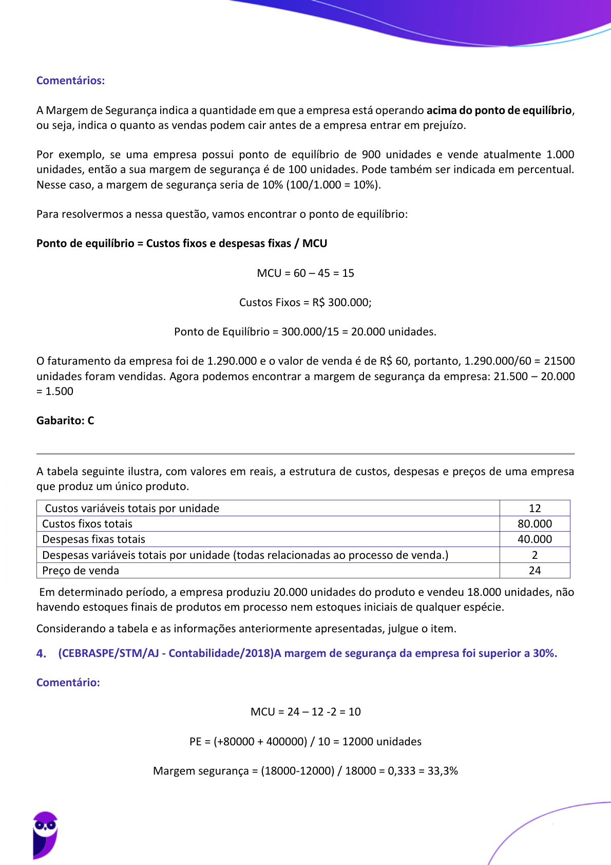 <p>Comentários:</p><p>A Margem de Segurança indica a quantidade em que a empresa está operando acima do ponto de equilíbrio,</p><p>ou seja, indica o quanto as vendas podem cair antes de a empresa entrar em prejuízo.</p><p>Por exemplo, se uma empresa possui ponto de equilíbrio de 900 unidades e vende atualmente 1.000</p><p>unidades, então a sua margem de segurança é de 100 unidades. Pode também ser indicada em percentual.</p><p>Nesse caso, a margem de segurança seria de 10% (100/1.000 = 10%).</p><p>Para resolvermos a nessa questão, vamos encontrar o ponto de equilíbrio:</p><p>Ponto de equilíbrio = Custos fixos e despesas fixas / MCU</p><p>MCU = 60 – 45 = 15</p><p>Custos Fixos = R$ 300.000;</p><p>Ponto de Equilíbrio = 300.000/15 = 20.000 unidades.</p><p>O faturamento da empresa foi de 1.290.000 e o valor de venda é de R$ 60, portanto, 1.290.000/60 = 21500</p><p>unidades foram vendidas. Agora podemos encontrar a margem de segurança da empresa: 21.500 – 20.000</p><p>= 1.500</p><p>Gabarito: C</p><p>A tabela seguinte ilustra, com valores em reais, a estrutura de custos, despesas e preços de uma empresa</p><p>que produz um único produto.</p><p>Custos variáveis totais por unidade 12</p><p>Custos fixos totais 80.000</p><p>Despesas fixas totais 40.000</p><p>Despesas variáveis totais por unidade (todas relacionadas ao processo de venda.) 2</p><p>Preço de venda 24</p><p>Em determinado período, a empresa produziu 20.000 unidades do produto e vendeu 18.000 unidades, não</p><p>havendo estoques finais de produtos em processo nem estoques iniciais de qualquer espécie.</p><p>Considerando a tabela e as informações anteriormente apresentadas, julgue o item.</p><p>(CEBRASPE/STM/AJ - Contabilidade/2018)A margem de segurança da empresa foi superior a 30%.</p><p>Comentário:</p><p>MCU = 24 – 12 -2 = 10</p><p>PE = (+80000 + 400000) / 10 = 12000 unidades</p><p>Margem segurança = (18000-12000) / 18000 = 0,333 = 33,3%</p><p>Luciano Rosa, Júlio Cardozo</p><p>Aula 05</p><p>SEFAZ-MG (Auditor Fiscal - área Auditoria e Fiscalização) Contabilidade de Custos - 2022 (Pós-Edital) (Prof Julio e Luciano)</p><p>www.estrategiaconcursos.com.br</p><p>68857100346813379 - Naiara Braz Sidrim Nogueira</p><p>131</p><p>200</p>