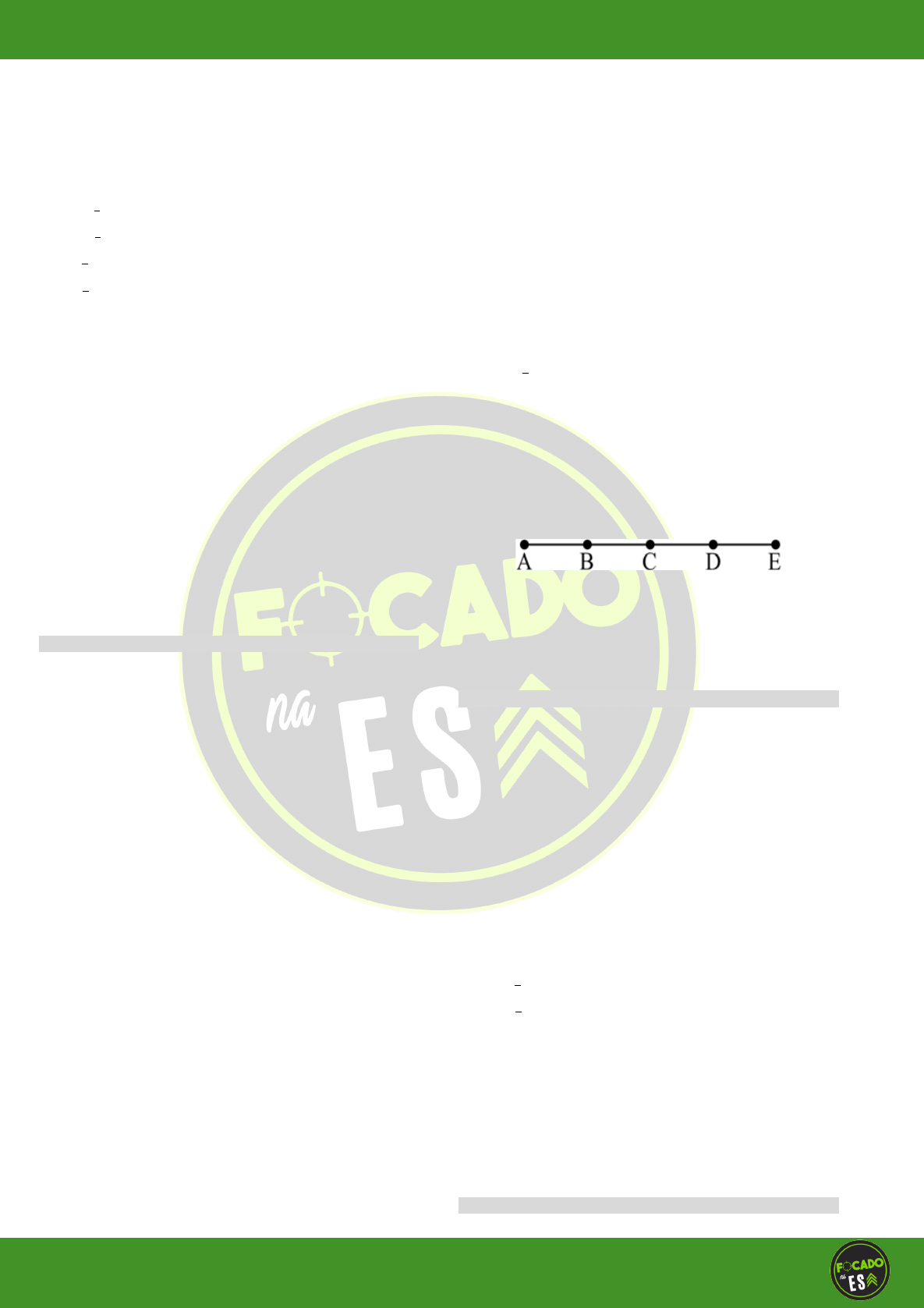 <p>www.focadonaesa.com.br</p><p>B) −6</p><p>C) 12</p><p>D) −18</p><p>592. (EEAR – 2011) Dados os pontos 𝐴(𝑘, 2), 𝐵(3, 1) e</p><p>𝐶(1,−2), para que a distância entre 𝐴 e 𝐵 seja igual à</p><p>distância entre 𝐴 e 𝐶, o valor de 𝑘 deve ser:</p><p>A) − 2</p><p>&</p><p>B) − "</p><p>&</p><p>C) $</p><p>%</p><p>D) "</p><p>%</p><p>593. (EEAR – 2010) Sejam os pontos 𝐴(−2, 2), 𝐵(2,−1)</p><p>e 𝐶(5, 𝑘). Se a distância entre 𝐴 e 𝐵 é a mesma que a</p><p>entre 𝐵 e 𝐶, a soma dos possíveis valores de 𝑘 é:</p><p>A) 1</p><p>B) 0</p><p>C) −1</p><p>D) −2</p><p>594. (EsSA – 2012) Os pontos 𝑀(−3, 1) e 𝑃(1,−1) são</p><p>equidistantes do ponto 𝑆(2, 𝑏). Desta forma, pode-se</p><p>afirmar que 𝑏 é um número:</p><p>A) primo</p><p>B) múltiplo de 3</p><p>C) divisor de 10</p><p>D) irracional</p><p>E) maior que 7</p><p>PONTO MÉDIO</p><p>595. (EEAR – 2009) Num triângulo 𝐴𝐵𝐶, o ponto médio</p><p>do lado 𝐴𝐵 é 𝑀(4,3). Se as coordenadas de 𝐵 são ambas</p><p>iguais a 2, então as coordenadas de 𝐴 são:</p><p>A) (7,5)</p><p>B) (6,4)</p><p>C) (5,3)</p><p>D) (3,4)</p><p>596. (EEAR – 2011) Seja 𝑀(4, 𝑎) o ponto médio do</p><p>segmento de extremidades 𝐴(3, 1) e 𝐵(𝑏, 5). Assim, o</p><p>valor de 𝑎 + 𝑏 é:</p><p>A) 8</p><p>B) 6</p><p>C) 4</p><p>D) 2</p><p>597. (EEAR – 2014) Sejam os pontos 𝐴(𝑥, 1), 𝑀(1, 2) e</p><p>𝐵(3, 𝑦). Se 𝑀 é ponto médio de 𝐴𝐵, então 𝑥 ∙ 𝑦 é igual a</p><p>A) −3</p><p>B) −1</p><p>C) 1</p><p>D) 3</p><p>598. (EsSA – 2015) Dados três pontos colineares 𝐴(𝑥, 8),</p><p>𝐵(−3, 𝑦) e 𝑀(3, 5), determine o valor de 𝑥 + 𝑦, sabendo</p><p>que 𝑀 é ponto médio de 𝐴𝐵</p><p>A) 3</p><p>B) 11</p><p>C) 9</p><p>D) −2,5</p><p>E) 5</p><p>599. (EEAr – 2015) Se 𝑀(𝑎, 𝑏) é o ponto médio do</p><p>segmento de extremidades 𝐴(1,−2) e 𝐵(5, 12), então é</p><p>correto afirmar que</p><p>A) 𝑎 e 𝑏 são pares</p><p>B) 𝑎 e 𝑏 são primos</p><p>C) 𝑎 é par e 𝑏 é primo</p><p>D) 𝑎 é primo 𝑏 é par</p><p>600. (EEAR – 2016-2) Considere os segmentos de retas</p><p>𝐴𝐵 e 𝐶𝐷, onde 𝐴(0, 10), 𝐵(2, 12), 𝐶(−2, 3) e 𝐷(4, 3). O</p><p>segmento 𝑀𝑁, determinado pelos pontos médios dos</p><p>segmentos 𝐴𝐵 e 𝐶𝐷 é dado pelos pontos 𝑀 e 𝑁,</p><p>pertencentes respectivamente a 𝐴𝐵 e a 𝐶𝐷. Assinale a</p><p>alternativa que corresponde corretamente a esses</p><p>pontos.</p><p>A) 𝑀@$</p><p>'</p><p>,1D e 𝑁(−1, 3)</p><p>B) 𝑀(−2, 10) e 𝑁(−1, 3)</p><p>C) 𝑀(1,−2) e 𝑁(1, 3)</p><p>D) 𝑀(1, 11) e 𝑁(1, 3)</p><p>601. (EEAR – 2018.2) Os pontos 𝐵, 𝐶 e 𝐷 dividem o</p><p>segmento 𝐴𝐸 em 4 partes iguais, conforme a figura. Se</p><p>𝐴(2, 7) e 𝐸(6, 1), então a abscissa de 𝐵 é</p><p>A) 6</p><p>B) 5</p><p>C) 4</p><p>D) 3</p><p>BARICENTRO</p><p>602. (EEAR – 2017.1) Seja ABC um triângulo tal que</p><p>𝐴(1, 1), 𝐵(3,−1) e 𝐶(5, 3). O ponto ______ é o baricentro</p><p>desse triângulo.</p><p>A) (2, 1)</p><p>B) (3, 3)</p><p>C) (1, 3)</p><p>D) (3, 1)</p><p>603. (EEAR – 2008) O baricentro de um triângulo, cujos</p><p>vértices são os pontos 𝑀(1, 1), 𝑁(3,−4) e 𝑃(−5, 2), tem</p><p>coordenadas cuja soma é:</p><p>A) 2</p><p>B) 1</p><p>C) − '</p><p>"</p><p>D) − $</p><p>'</p><p>604. (EEAR – 2010) Seja 𝐺 o ponto de encontro das</p><p>medianas de um triângulo cujos vértices são 𝐴(−1,−3),</p><p>𝐵(4,−1) e 𝐶(3, 7). A abscissa de 𝐺 é:</p><p>A) −1</p><p>B) 0</p><p>C) 1</p><p>D) 2</p><p>ÁREA DO POLÍGONO</p>