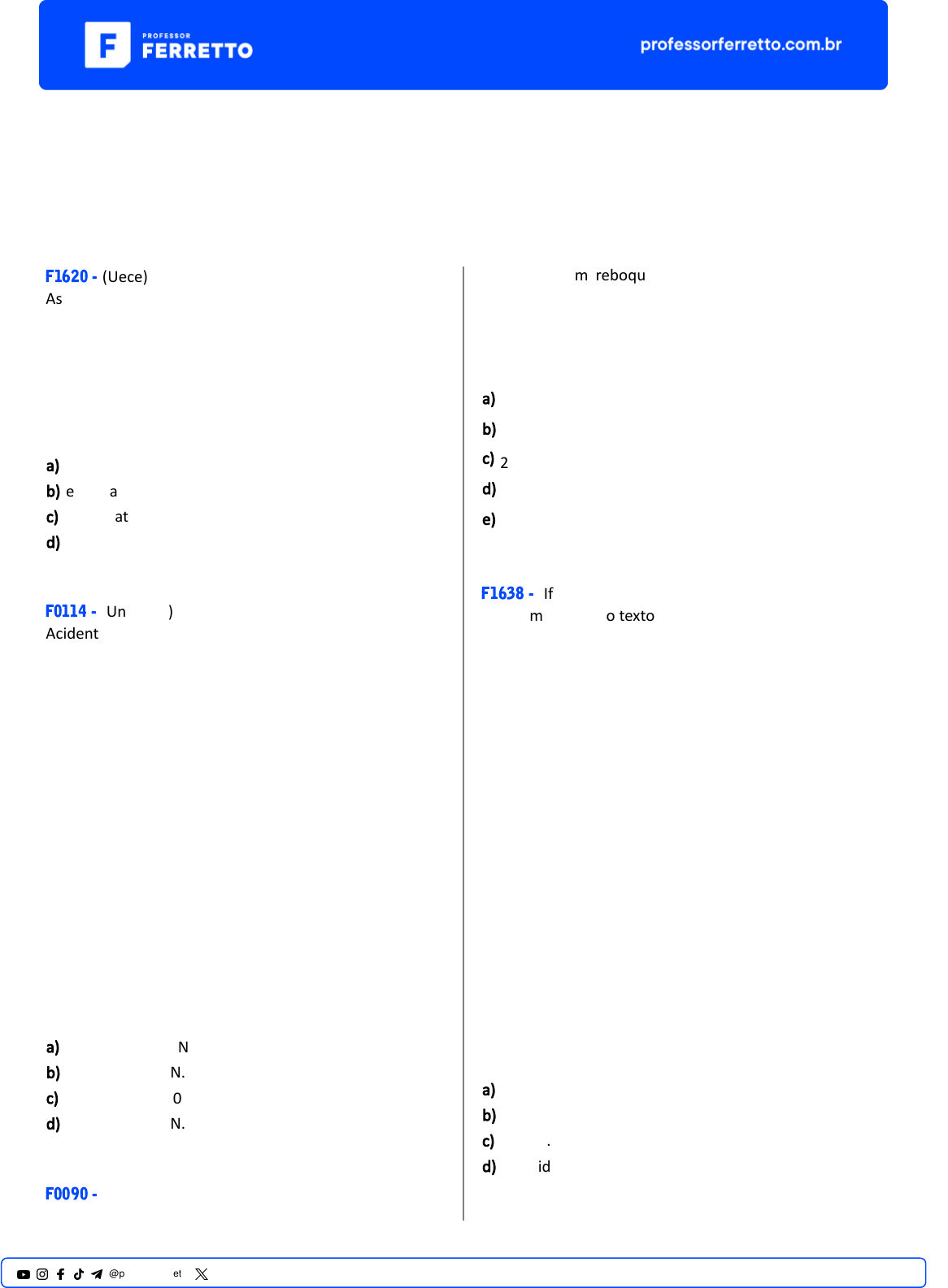 <p>Vestibulares</p><p>Dinâmica</p><p>F1620 - (Uece)</p><p>As grandezas �sicas escalares são expressas apenas pelo</p><p>seu valor numérico e unidade de medida. As grandezas</p><p>�sicas vetoriais além do valor numérico e unidade de</p><p>medida, para serem expressas, necessitam de direção e</p><p>sen�do.</p><p>Com base nisso, assinale a opção que corresponde a uma</p><p>grandeza �sica de natureza vetorial.</p><p>a) massa</p><p>b) energia</p><p>c) temperatura</p><p>d) força</p><p>F0114 - (Unicamp)</p><p>Acidentes de trânsito causam milhares de mortes todos</p><p>os anos nas estradas do país. Pneus desgastados</p><p>(“carecas”), freios em péssimas condições e excesso de</p><p>velocidade são fatores que contribuem para elevar o</p><p>número de acidentes de trânsito.</p><p>O sistema de freios ABS (do alemão “An�blockier-</p><p>Bremssystem”) impede o travamento das rodas do</p><p>veículo, de forma que elas não deslizem no chão, o que</p><p>leva a um menor desgaste do pneu. Não havendo</p><p>deslizamento, a distância percorrida pelo veículo até a</p><p>parada completa é reduzida, pois a força de atrito</p><p>aplicada pelo chão nas rodas é está�ca, e seu valor</p><p>máximo é sempre maior que a força de atrito ciné�co. O</p><p>coeficiente de atrito está�co entre os pneus e a pista é µe</p><p>= 0,80 e o ciné�co vale µc = 0,60. Sendo g = 10 m/s2 e a</p><p>massa do carro m = 1200 kg, o módulo da força de atrito</p><p>está�co máxima e a da força de atrito ciné�co são,</p><p>respec�vamente, iguais a</p><p>a) 1200 N e 12000 N.</p><p>b) 12000 N e 120 N.</p><p>c) 20000 N e 15000 N.</p><p>d) 9600 N e 7200 N.</p><p>F0090 - (Uel)</p><p>O cabo de um reboque arrebenta se nele for aplicada</p><p>uma força que exceda 1800N. Suponha que o cabo seja</p><p>usado para rebocar um carro 900kg ao longo de uma rua</p><p>plana e re�línea. Nesse caso, que aceleração máxima o</p><p>cabo suportaria?</p><p>a) 0,5 m/s2</p><p>b) 1,0 m/s2</p><p>c) 2,0 m/s2</p><p>d) 4,0 m/s2</p><p>e) 9,0 m/s2</p><p>F1638 - (Ifsul)</p><p>Leia com atenção o texto que segue.</p><p>“Galileu fez outra grande descoberta. Ele mostrou que</p><p>Aristóteles estava também errado quando considerava</p><p>que fosse necessário exercer forças sobre os objetos para</p><p>mantê-los em movimento. Embora seja necessária uma</p><p>força para dar início ao movimento, Galileu mostrou que,</p><p>uma vez em movimento, nenhuma força é necessária</p><p>para manter o movimento – exceto a força necessária</p><p>para sobrepujar o atrito. Quando o atrito está ausente,</p><p>um objeto em movimento mantém-se em movimento</p><p>sem a necessidade de qualquer força.”</p><p>HEWITT, P. G. Fundamentos de Física Conceitual. 1ª ed. –</p><p>Porto Alegre: Bookman, 2003. p. 50.</p><p>O texto refere-se a uma questão central no estudo do</p><p>movimento dos corpos na Mecânica Newtoniana, que é a</p><p>propriedade dos corpos manterem o seu estado de</p><p>movimento.</p><p>Essa propriedade é conhecida como</p><p>a) força.</p><p>b) massa.</p><p>c) inércia.</p><p>d) velocidade.</p><p>1@professorferretto @prof_ferretto</p><p>F1371 - (Unicamp)</p><p>A força de atrito ciné�co entre a agulha e um disco de</p><p>vinil tem módulo Fat = 8,0x10–3 N. Sendo o módulo da</p><p>força normal N = 2,0x10–2 N, o coeficiente de atrito</p><p>ciné�co, 𝜇</p><p>𝐶</p><p>, entre a agulha e o disco é igual a</p><p>a) 1,6x10–5</p><p>b) 5,0x10–2</p><p>c) 4,0x10–1</p><p>d) 2,5x100</p><p>F0073 - (Ifmg)</p><p>A imagem mostra um garoto sobre um skate em</p><p>movimento com velocidade constante que, em seguida,</p><p>choca-se com um obstáculo e cai.</p><p>A queda do garoto jus�fica-se devido à(ao)</p><p>a) princípio da inércia.</p><p>b) ação de uma força externa.</p><p>c) princípio da ação e reação.</p><p>d) força de atrito exercida pelo obstáculo.</p><p>F1718 - (U�pr)</p><p>Estamos deixando de usar lâmpadas incandescentes</p><p>devido ao grande consumo de energia que essas</p><p>lâmpadas apresentam. Se uma lâmpada de 60 W ficar</p><p>ligada durante 10 minutos, produzirá um consumo de</p><p>energia, em joules, igual a:</p><p>a) 60.000.</p><p>b) 6.000.</p><p>c) 36.000.</p><p>d) 90.000.</p><p>e) 120.000.</p><p>F0743 - (Uerj)</p><p>Observe no gráfico a variação, em newtons, da</p><p>intensidade da força F aplicada pelos motores de um</p><p>veículo em seus primeiros 9 s de deslocamento.</p><p>Nesse contexto, a intensidade do impulso da força, em N</p><p>· s, equivale a:</p><p>a) 1,8 x 104</p><p>b) 2,7 x 104</p><p>c) 3,6 x 104</p><p>d) 4,5 x 104</p><p>F0166 - (Pucrj)</p><p>Uma massinha de 0,3 kg é lançada horizontalmente com</p><p>velocidade de 5,0 m/s contra um bloco de 2,7 kg que se</p><p>encontra em repouso sobre uma super�cie sem atrito.</p><p>Após a colisão, a massinha se adere ao bloco.</p><p>Determine a velocidade final do conjunto massinha-bloco</p><p>em m/s imediatamente após a colisão.</p><p>a) 2,8</p><p>b) 2,5</p><p>c) 0,6</p><p>d) 0,5</p><p>e) 0,2</p><p>F1416 - (Fer)</p><p>Nos primeiros 10 s de uma corrida um carro de massa</p><p>1200 kg alterou sua velocidade, conforme mostra o</p><p>gráfico abaixo.</p><p>2@professorferretto @prof_ferretto</p><p>Considerando que o teste foi executado em uma pista</p><p>re�línea, pode-se afirmar que força resultante que atuou</p><p>sobre o carro foi de</p><p>a) 1200 N</p><p>b) 2400 N</p><p>c) 3600 N</p><p>d) 4800 N</p><p>e) 6000 N</p><p>F0742 - (Uerj)</p><p>O gráfico abaixo indica a variação da aceleração a de um</p><p>corpo, inicialmente em repouso, e da força F que atua</p><p>sobre ele.</p><p>Quando a velocidade do corpo é de 10 m/s, sua</p><p>quan�dade de movimento, em kg.m/s, corresponde a:</p><p>a) 50</p><p>b) 30</p><p>c) 25</p><p>d) 15</p><p>F0084 - (U�pr)</p><p>Associe a Coluna I (Afirmação) com a Coluna II (Lei Física).</p><p>Coluna I – Afirmação</p><p>1. Quando um garot