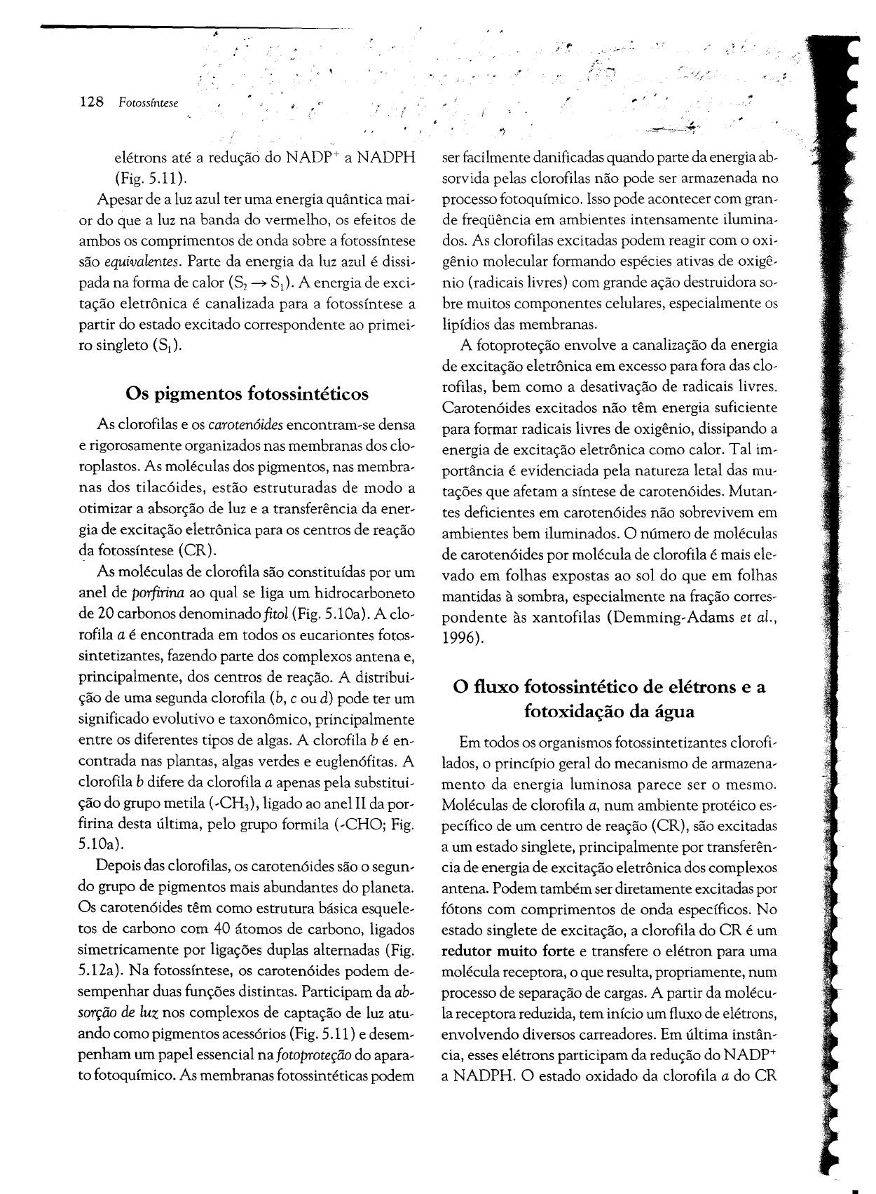 <p>•</p><p>128 Fotossíntese</p><p>elétrons até a redução do NADP+ a NADPH</p><p>(Fig.5.11).</p><p>Apesar de a luz azul ter uma energia quântica mai</p><p>or do que a luz na banda do vermelho, os efeitos de</p><p>ambos os comprimentos de onda sobre a fotossíntese</p><p>são equivalentes. Parte da energia da luz azul é dissi</p><p>pada na forma de calor (SI ~ Si)' A energia de exci</p><p>tação eletrônica é canalizada para a fotossíntese a</p><p>partir do estado excitado correspondente ao primei</p><p>ro singleto (Si)'</p><p>Os pigmentos fotossintéticos</p><p>As clorofilas e os carotenóides encontram-se densa</p><p>e rigorosamente organizados nas membranas dos clo</p><p>roplastos. As moléculas dos pigmentos, nas membra</p><p>nas dos tilacóides, estão estruturadas de modo a</p><p>otimizar a absorção de luz e a transferência da ener</p><p>gia de excitação eletrônica para os centros de reação</p><p>da fotossíntese (CR).</p><p>As moléculas de clorofila são constituídas por um</p><p>anel de porfirina ao qual se liga um hidrocarboneto</p><p>de 20 carbonos denominado fitol (Fig. 5.1 Oa). A clo</p><p>rofila a é encontrada em todos os eucariontes fotos</p><p>sintetizantes, fazendo parte dos complexos antena e,</p><p>principalmente, dos centros de reação. A distribui</p><p>ção de uma segunda clorofila (b, c ou d) pode ter um</p><p>significado evolutivo e taxonômico, principalmente</p><p>entre os diferentes tipos de algas. A clorofila b é en</p><p>contrada nas plantas, algas verdes e euglenófitas. A</p><p>clorofila b difere da clorofila a apenas pela substitui</p><p>ção do grupo metila (-CH3), ligado ao anel II da por</p><p>firina desta última, pelo grupo formila (-CHOj Fig.</p><p>5.lOa).</p><p>Depois das clorofilas, os carotenóides são o segun</p><p>do grupo de pigmentos mais abundantes do planeta.</p><p>Os carotenóides têm como estrutura básica esquele</p><p>tos de carbono com 40 átomos de carbono, ligados</p><p>simetricamente por ligações duplas alternadas (Fig.</p><p>5.12a). Na fotossíntese, os carotenóides podem de</p><p>sempenhar duas funções distintas. Participam da ab</p><p>sorção de luz nos complexos de captação de luz atu</p><p>ando como pigmentos acessórios (Fig. 5.11) e desem</p><p>penham um papel essencial na fotoproteção do apara</p><p>to fotoquímico. As membranas fotossintéticas podem</p><p>:"""1</p><p>ser facilmente danificadas quando parte da energia ab</p><p>sorvida pelas clorofilas não pode ser armazenada no</p><p>processo fotoquímico. Isso pode acontecer com gran</p><p>de freqüência em ambientes intensamente ilumina</p><p>dos. As clorofilas excitadas podem reagir com o oxi</p><p>gênio molecular formando espécies ativas de oxigê</p><p>nio (radicais livres) com grande ação destruidora so</p><p>bre muitos componentes celulares, especialmente os</p><p>lipídios das membranas.</p><p>A fotoproteção envolve a canalização da energia</p><p>de excitação eletrônica em excesso para fora das clo</p><p>rofilas, bem como a desativação de radicais livres.</p><p>Carotenóides excitados não têm energia suficiente</p><p>para formar radicais livres de oxigênio, dissipando a</p><p>energia de excitação eletrônica como calor. Tal im</p><p>portância é evidenciada pela natureza letal das mu</p><p>tações que afetam a síntese de carotenóides. Mutan</p><p>tes deficientes em carotenóides não sobrevivem em</p><p>ambientes bem iluminados. O número de moléculas</p><p>de carotenóides por molécula de clorofila é mais ele</p><p>vado em folhas expostas ao sol do que em folhas</p><p>mantidas à sombra, especialmente na fração corres</p><p>pondente às xamofilas (Demming-Adams et al.,</p><p>1996).</p><p>O fluxo fotossintético de elétrons e a</p><p>fotoxidação da água</p><p>Em todos os organismos fotossintetizantes clorofi</p><p>lados, o princípio geral do mecanismo de armazena</p><p>mento da energia luminosa parece ser o mesmo.</p><p>Moléculas de clorofila a, num ambiente protéico es</p><p>pecífico de um centro de reação (CR), são excitadas</p><p>a um estado singlete, principalmente por transferên</p><p>cia de energia de excitação eletrônica dos complexos</p><p>antena. Podem também ser diretamente excitadas por</p><p>fótons com comprimentos de onda específicos. No</p><p>estado singlete de excitação, a clorofila do CR é um</p><p>redutor muito forte e transfere o elétron para uma</p><p>molécula receptora, o que resulta, propriamente, num</p><p>processo de separação de cargas. A partir da molécu</p><p>la receptora reduzida, tem início um fluxo de elétrons,</p><p>envolvendo diversos carreadores. Em última instân</p><p>cia, esses elétrons participam da redução do NADP+</p><p>a NADPH. O estado oxidado da clorofila a do CR</p><p>,-</p><p>•</p><p>B</p><p>A CAROTENOS</p><p>f3-Caroteno</p><p>o:-Caroteno</p><p>XANTOFILAS</p><p>Zeaxantina</p><p>Luteína</p><p>300 400</p><p>,., .</p><p>• •</p><p>• t, •. .</p><p>:--; j}6BOnml</p><p>Oxidante</p><p>Forte lI\I 12 hv"</p><p>e simétrica.</p><p>Fig. 5.15 O tradicional esquema Z representando o fluxo fotossintético de elétrons. Este diagrama associa os carreadores</p><p>de elétrons do sistema fotoquímico aos seus respectivos potenciais redox e níveis de energia .</p><p>Fig. 5.14 Representação linear do transporte de elétrons através dos complexos fotossintéticos supramoleculares nas</p><p>membranas dos tilacóides. (Hopkins, 1998, modificado.)</p><p>•</p><p>132 Fotossíntese</p><p>de elétrons na fotossíntese esteve baseada no esque</p><p>ma Z, modelo originalmente proposto por Hill &</p><p>Bendall em 1960.</p><p>o FOTOSSISTEMA II</p><p>O FSll é constituído por um complexo transmem</p><p>brana formado por cerca de 22 proteínas. Funcional</p><p>mente, o complexo protéico do CR do FSll é muito</p><p>semelhante ao das bactérias fotossintéticas púrpura</p><p>anaeróbias não-sulfurosas, cuja estrutura cristalina foi</p><p>deter