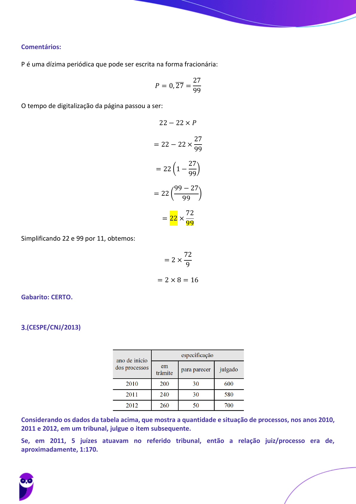 <p>Comentários:</p><p>P é uma dízima periódica que pode ser escrita na forma fracionária:</p><p>𝑃 = 0, 27̅̅̅̅ =</p><p>27</p><p>99</p><p>O tempo de digitalização da página passou a ser:</p><p>22 − 22 × 𝑃</p><p>= 22 − 22 ×</p><p>27</p><p>99</p><p>= 22 (1 −</p><p>27</p><p>99</p><p>)</p><p>= 22(</p><p>99 − 27</p><p>99</p><p>)</p><p>= 22 ×</p><p>72</p><p>99</p><p>Simplificando 22 e 99 por 11, obtemos:</p><p>= 2 ×</p><p>72</p><p>9</p><p>= 2 × 8 = 16</p><p>Gabarito: CERTO.</p><p>(CESPE/CNJ/2013)</p><p>Considerando os dados da tabela acima, que mostra a quantidade e situação de processos, nos anos 2010,</p><p>2011 e 2012, em um tribunal, julgue o item subsequente.</p><p>Se, em 2011, 5 juízes atuavam no referido tribunal, então a relação juiz/processo era de,</p><p>aproximadamente, 1:170.</p><p>Equipe Exatas Estratégia Concursos</p><p>Aula 00</p><p>Câmara Municipal de Guarulhos-SP - Matemática Financeira (Nível Superior) - 2023 (Pós-Edital)</p><p>www.estrategiaconcursos.com.br</p><p>75</p><p>269</p>
