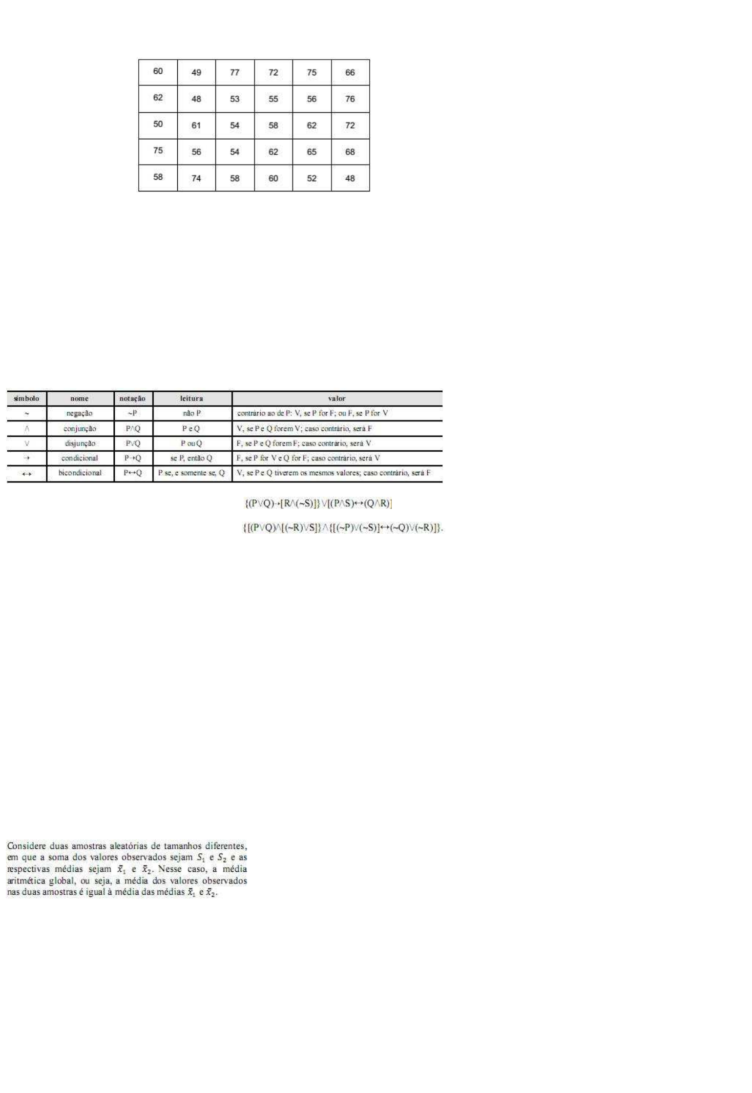 <p>703. Id: 117060 Ano: 2014 Bancas: CETRO Instituições: Prefeitura de São Paulo - SP Provas: Auditor Fiscal Municipal -</p><p>Conhecimentos Básicos Disciplina: Matemática Assuntos: 7.1 Equações do 1º grau e Sistemas de Equações</p><p>A tabela mostra a distribuição do atendimento domiciliar de cada um dos 30 agentes de saúde de um município.</p><p>A porcentagem de agentes cujo atendimento é maior ou igual a 53 casas ou menor e igual a 62 casas é de</p><p>a) 60%.</p><p>b) 50%.</p><p>c) 40%.</p><p>d) 30%.</p><p>e) 20%.</p><p>704. Id: 223823 Ano: 2012 Bancas: CESPE/ CEBRASPE Instituições: TCE-ES Provas: Auditor de Controle Externo Disciplina:</p><p>Raciocínio Lógico Matemático (RLM) Assuntos: 1.1.1 Sentenças e Proposições, 1.1.3 Proposições Simples e Compostas, Conectivos</p><p>lógicos, 1.2 Equivalências e Negações Lógicas</p><p>Proposições são sentenças que podem ser julgadas como verdadeiras - V - ou falsas - F -, de forma que um julgamento exclui o outro, e são</p><p>simbolizadas por letras maiúsculas, como P, Q, R e S. A partir de proposições conhecidas, novas proposições podem ser construídas usando-se símbolos</p><p>especiais. Alguns desses símbolos são apresentados na tabela abaixo.</p><p>Considerando as definições acima e a proposição ,julgue os itens a seguir.</p><p>A negação da referida proposição é a proposição</p><p>( ) Certo</p><p>( ) Errado</p><p>705. Id: 200471 Ano: 2013 Bancas: FCC Instituições: DPE-RS Provas: Analista - Engenharia Civil Disciplina: Matemática</p><p>Assuntos: 7.1 Equações do 1º grau e Sistemas de Equações</p><p>Em uma empresa, 2/3 dos funcionários são homens e 3/5 falam inglês. Sabendo que 1/12 dos funcionários são mulheres que não falam inglês, pode-se</p><p>concluir que os homens que falam inglês representam, em relação ao total de funcionários, uma fração equivalente a</p><p>a) 3/10</p><p>b) 7/20</p><p>c) 2/5</p><p>d) 9/20</p><p>e) 1/2</p><p>Direitos autorais reservados (Lei 9610/98). Proibida a reprodução, venda ou compartilhamento deste arquivo. Uso individual</p><p>Cópia registrada para (CPF:)</p><p>706. Id: 212597 Ano: 2013 Bancas: CESPE/ CEBRASPE Instituições: ANP Provas: Especialista em Regulação Disciplina: Estatística</p><p>Assuntos: 2 Estatística Descritiva, 2.6 Medidas de Posição ou Tendência Central</p><p>No que concerne aos procedimentos de análise estatística de dados, julgue os itens seguintes.</p><p>( ) Certo</p><p>( ) Errado</p><p>707. Id: 316166 Ano: 2010 Bancas: FCC Instituições: TRT - 9ª REGIÃO (PR) Provas: Analista Judiciário - Fisioterapia Disciplina:</p><p>Raciocínio Lógico Matemático (RLM) Assuntos: 7 Raciocínio Matemático, 2 Sequências Lógicas de Números, Letras, Palavras e Figuras</p><p>Em um ambulatório há um armário fechado com um cadeado cujo segredo é um número composto de 6 dígitos. Necessitando abrir tal armário, um</p><p>funcionário não conseguia lembrar a sequência de dígitos que o abriria; lembrava apenas que a soma dos dígitos que ocupavam as posições pares era</p><p>igual à soma dos dígitos nas posições ímpares.</p><p>As alternativas que seguem apresentam sequências de seis dígitos, em cada uma das quais estão faltando dois dígitos. A única dessas sequências que</p><p>pode ser completada de modo a resultar em um possível segredo para o cadeado é:</p><p>a) 9 2 _ _ 6 2</p><p>b) 7 _ 7 _ 7 1</p><p>c) 6 _ 9 0 _ 5</p><p>Firefox https://www.exponencialconcursos.com.br/questoes/main/imprimir_meus_cadernos_html/875467</p><p>136 of 197 28/05/2021 20:53</p>