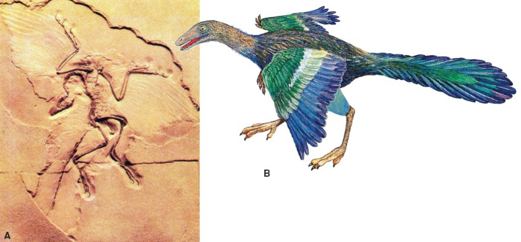 <p>Os zoólogos há muito já reconheceram a similaridade entre as aves e os répteis não aves. O crânio das aves e dos répteis</p><p>conecta-se com a primeira vértebra cervical por um único côndilo occipital (uma pequena rótula óssea: mamíferos têm duas</p><p>dessas rótulas). As aves e os répteis não aves têm um único osso na orelha média, o estribo (os mamíferos têm três ossos na</p><p>orelha média). Ambos têm um maxilar consistindo em cinco ou seis ossos, enquanto o maxilar dos mamíferos tem um osso</p><p>mandibular, o dentário. Ambos excretam seus resíduos nitrogenados na forma de ácido úrico, enquanto os mamíferos o fazem</p><p>como ureia. As aves e os répteis não aves põem ovos grandes com muito vitelo, e o embrião desenvolve-se inicialmente por</p><p>clivagem superficial.</p><p>O renomado zoólogo inglês, Thomas Henry Huxley, ficou tão impressionado com essas e muitas outras afinidades</p><p>anatômicas e fisiológicas que chamou as aves de “répteis glorificados” e classificou-as em um grupo de dinossauros</p><p>denominados terópodes (ver Capítulo 26), que apresentavam diversas características semelhantes às das aves (Figuras 27.2 e</p><p>27.3). Os dinossauros terópodes compartilham muitos caracteres derivados com as aves, e o mais óbvio deles é um pescoço</p><p>alongado, móvel e em forma de “S”.</p><p>Figura 27.1 Archaeopteryx, uma ave primitiva de 147 milhões de anos. A. Molde do segundo e mais perfeito</p><p>fóssil de Archaeopteryx, que foi descoberto em uma pedreira de calcário na Baviera. Foram descobertos 11</p><p>espécimes de Archaeopteryx, o mais recente descrito em 2011. B. Reconstrução de Archaeopteryx.</p><p>Figura 27.2 Evolução das aves modernas. Das 40 ordens de aves atuais, são mostradas as 9 mais importantes.</p><p>A mais antiga ave conhecida, Archaeopteryx, viveu no período Jurássico Superior, há 147 milhões de anos.</p><p>Apenas Archaeopteryx compartilha muitos caracteres especializados do seu esqueleto com os menores</p><p>dinossauros terópodes, e é considerado como tendo evoluído dentro do clado dos terópodes. A evolução das</p><p>ordens modernas de aves ocorreu, rapidamente, durante o período Cretáceo e início do Terciário.</p><p>Figura 27.3 Cladograma de Saurischia, mostrando as relações de vários táxons com as aves modernas. São</p><p>mostrados poucos caracteres derivados compartilhados, principalmente relacionados com o voo, que foram</p><p>usados para construir a genealogia. Os ornitísquios são o grupo-irmão de todos os saurísquios e todos são</p><p>membros do clado Archosauria (ver Figuras 26.1 e 26.2).</p><p>As penas precederam ambos – as aves e o voo. Os dromeossauros, um grupo de terópodes que inclui o Velociraptor,</p><p>compartilham muitos caracteres derivados adicionais com as aves, incluindo a fúrcula (clavículas fusionadas) e os ossos</p><p>lunares do punho, que permitem movimentos giratórios, posteriormente usados no voo (Figura 27.3). Uma evidência adicional,</p><p>ligando as aves aos dromeossauros, veio de fósseis descritos recentemente de depósitos do Jurássico Superior e Cretáceo</p><p>Inferior da província de Liaoning, China. Esses fósseis extraordinários de dromeossauros incluem alguns com filamentos,</p><p>como o Sinosauropteryx, e alguns com penas, como Protarchaeopteryx e Caudipteryx. Os filamentos eram estruturas ocas,</p><p>semelhantes ao estágio inicial do desenvolvimento das penas modernas (Figura 27.5). Todavia, esses dromeossauros</p><p>emplumados não podiam voar, pois tinham membros anteriores curtos e as penas com vexilos simétricos (as penas de voo das</p><p>aves modernas voadoras são assimétricas). Claramente, esses filamentos e penas primitivos serviam diferentes propósitos,</p><p>talvez provendo termorregulação ou críptica, ou usados em exibições da corte. Alguns dromeossauros, como o arborícola</p><p>Microraptor, provavelmente usavam suas penas para planar ou controlar saltos entre as árvores. Mais tarde, as penas</p><p>passaram por exaptação* (Capítulo 6) para voo ativo. Os fósseis da Espanha e da Argentina, que representam aves mais</p><p>derivadas que Archaeopteryx, documentam o desenvolvimento da quilha do esterno e da álula, a perda dos dentes e a fusão de</p><p>ossos característica das aves modernas. Uma abordagem filogenética da classificação agrupa as aves com os dinossauros</p><p>terópodes. Desse ponto de vista, os dinossauros não estão extintos – eles estão conosco hoje como aves! Definem-se “aves”</p><p>como o clado que contém o ancestral do Archaeopteryx, as aves vivas e todos os seus descendentes. As sinapomorfias para</p><p>este clado incluem um comprimento de cauda reduzido, um cerebelo maior e diversas características esqueléticas do crânio,</p><p>vértebras e apêndices.</p><p>As aves atuais (Neornithes) são divididas em dois grupos: (1) Paleognathae (Gr. palaios, antigo, + gnathos, maxila), as</p><p>grandes aves não voadoras similares aos avestruzes e os quivis, frequentemente chamadas de aves ratitas, que têm o esterno</p><p>achatado com músculos peitorais pouco desenvolvidos, e os tinamídeos, e (2) Neognathae (Gr. neos, novo, + gnathos,</p><p>maxila), todas as outras aves, quase todas voadoras que têm um esterno com quilha, ao qual se fixam poderosos músculos de</p><p>voo. Existem várias aves neognatas não voadoras, algumas das quais sem quilha no esterno (Figura 27.4). A incapacidade de</p><p>voar surgiu independentemente em muitos grupos de aves; o registro fóssil revela corruíras, pombas, papagaios, grous, alcas,</p><p>patos e, até mesmo, uma coruja não voadores. Os pinguins não voam, embora utilizem suas asas para “voar” na água (ver</p><p>Figura 10.8). Geralmente, a incapacidade de voar evoluiu em ilhas sem grandes predadores terrestres. As aves não voadoras</p><p>que habitam os continentes, hoje, são os grandes paleognatas (avestruz, ema, casuar, 