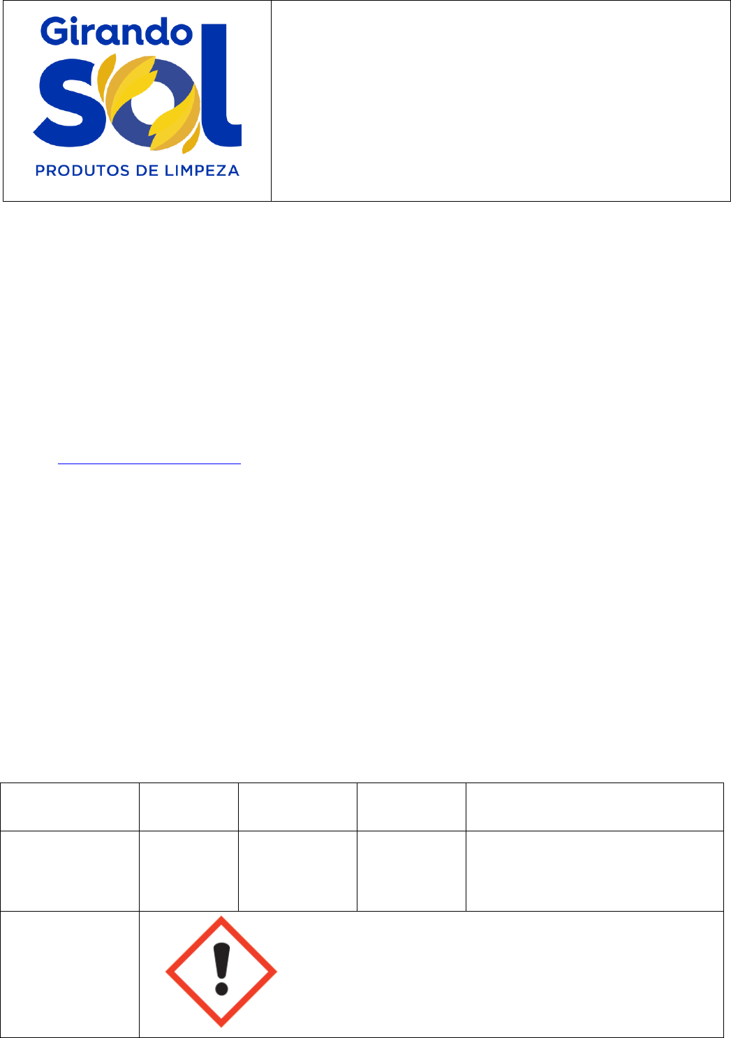 <p>FISPQ - FICHA DE INFORMAÇÕES DE SEGURANÇA</p><p>DE PRODUTO QUÍMICO.</p><p>(DE ACORDO COM A NBR 14725-4:2014)</p><p>PRODUTO: SABÃO EM BARRA GLICERINADO NEUTRO</p><p>GIRANDO SOL</p><p>FISPQ Nº: 17 PÁGINA: 1/5</p><p>REVISÃO Nº: 10</p><p>DATA DA ÚLTIMA REVISÃO: 05/05/2020</p><p>1. IDENTIFICAÇÃO DO PRODUTO E DA EMPRESA</p><p>1.1. IDENTIFICAÇÃO DO PRODUTO:</p><p>- Nome do produto: SABÃO EM BARRA GLICERINADO NEUTRO GIRANDO SOL.</p><p>1.2. IDENTIFICAÇÃO DA EMPRESA:</p><p>- Empresa: Ind. e Com. de Produtos de Limpeza Girando Sol Ltda.</p><p>- Endereço: Rua Arthur José Schroeder 780, Bairro São Caetano, Arroio do Meio – Rio</p><p>Grande do Sul, Brasil - CEP: 95940-000.</p><p>- Telefone de Contato: (51) 3716 9400 ou 0800 701 7169.</p><p>- Site: www.girandosol.com.br</p><p>- Emergência toxicológicas: CIT/RS 0XX51.2139.9200 ou 0800.721.3000.</p><p>2. IDENTIFICAÇÃO DE PERIGOS</p><p>- Perigos mais importantes: Produto nocivo quando ingerido.</p><p>- Efeitos adversos à saúde humana: O contato do produto puro com os olhos pode</p><p>provocar conjuntivite e em contato prolongado com a pele pode provocar dermatite. Produto</p><p>irritante para os olhos e mucosas, evitar o contato.</p><p>- Efeitos ambientais: A dispersão no meio ambiente pode contaminar a área. Evitar a</p><p>entrada em cursos de água.</p><p>- Perigos físicos e químicos: Produto estável nas condições de uso convencionais.</p><p>- Classificação de perigo do produto químico: Produto Saneante Domissanitário de Risco</p><p>I, Resolução - RDC 59 de 17 de dezembro de 2010 da ANVISA.</p><p>- Sistema de classificação utilizado:</p><p>* Norma ABNT – NBR 14725-4:2014.</p><p>* Resolução - RDC 59 de 17 de dezembro de 2010 da ANVISA.</p><p>- Elementos apropriados da rotulagem:</p><p>Classe de</p><p>Perigo</p><p>Categoria</p><p>Palavra de</p><p>Advertência</p><p>Frase de</p><p>Perigo</p><p>Frase de Precaução</p><p>Sensibilização a</p><p>pele</p><p>2</p><p>Atenção</p><p>Irritante para</p><p>os olhos e</p><p>mucosas</p><p>Em caso de</p><p>contato com os olhos, lave-os</p><p>imediatamente com água em</p><p>abundância</p><p>Pictograma</p><p>http://www.girandosol.com.br/</p><p>FISPQ - FICHA DE INFORMAÇÕES DE SEGURANÇA</p><p>DE PRODUTO QUÍMICO.</p><p>(DE ACORDO COM A NBR 14725-4:2014)</p><p>PRODUTO: SABÃO EM BARRA GLICERINADO NEUTRO</p><p>GIRANDO SOL</p><p>FISPQ Nº: 17 PÁGINA: 2/5</p><p>REVISÃO Nº: 10</p><p>DATA DA ÚLTIMA REVISÃO: 05/05/2020</p><p>3. COMPOSIÇÃO E INFORMAÇÕES SOBRE OS INGREDIENTES</p><p>- Tipo de produto: Preparado/mistura.</p><p>- Nome químico: Preparado à base de Ácidos Graxos de Gordura Animal e Vegetal.</p><p>- Sinônimos: Sabão em Barra.</p><p>- Natureza química: Orgânico.</p><p>- Composição: Sebo Bovino, Sabão Base de Coco, Glicerina, Alcalinizante, Coadjuvante,</p><p>Sequestrante, Cargas, Corante, Fragrância e Veículo.</p><p>- Ingredientes ou impurezas que contribuam para o perigo: Não possui ingredientes</p><p>que contribuem para o perigo.</p><p>4. MEDIDAS DE PRIMEIROS SOCORROS</p><p>- Contato com os olhos: Mantenha as pálpebras separadas e lave imediatamente os olhos,</p><p>com água corrente em abundância, durante no mínimo 15 minutos e caso persistir a irritação</p><p>procure socorro médico levando o rótulo do produto.</p><p>- Contato com a pele: Lavar as partes atingidas com água corrente. Remova as roupas e</p><p>sapatos impregnados com o produto, lavando-os antes de reutilizar.</p><p>- Em caso de ingestão: Não provocar vômito e consultar de imediato o Centro de</p><p>Intoxicações (Fone CIT/RS 0XX51 2139.9200 ou 0800.721 3000) ou o médico, levando a</p><p>embalagem do produto. Enxágue imediatamente a boca com água corrente.</p><p>- Inalação: Nenhum efeito conhecido. Caso necessário remover o paciente para local</p><p>arejado.</p><p>5. MEDIDAS DE COMBATE A INCÊNDIO</p><p>- Meios de extinção: Produto não inflamável. Porém se ocorrer princípio de incêndio com</p><p>outros materiais utilizar extintor de água spray, espuma, pó químico seco ou dióxido de</p><p>carbono (CO2) que devem ser aplicados de acordo com as técnicas especificadas pelo</p><p>fabricante.</p><p>- Perigos específicos da substância ou mistura: Produto não inflamável.</p><p>- Medidas de proteção da equipe de combate a incêndio: Em função da magnitude do</p><p>incêndio, poderá ser necessário o uso de roupa protetora completa e equipamento de</p><p>respiração autônomo. Não dever ser direcionado jato de água diretamente sobre o produto</p><p>em chamas, pois este poderá espalhar- se e aumentar a intensidade do fogo. Recipientes</p><p>envolvidos no incêndio podem ser resfriados com água neblina.</p><p>6. MEDIDAS DE CONTROLE PARA DERRAMAMENTO OU VAZAMENTO</p><p>- Precauções pessoais, equipamentos de proteção e procedimentos de emergência:</p><p>Evitar contato com os olhos, pele, roupas e inalação. Utilizar equipamento de proteção</p><p>individual (EPI): óculos de proteção, calçado de segurança ou bota de borracha ou PVC, luvas</p><p>de látex ou nitrílicas.</p><p>- Precauções ao meio ambiente: Evite que o produto derramado atinja cursos d’água,</p><p>rede de esgotos e vegetação. Seguir orientações da legislação local.</p><p>FISPQ - FICHA DE INFORMAÇÕES DE SEGURANÇA</p><p>DE PRODUTO QUÍMICO.</p><p>(DE ACORDO COM A NBR 14725-4:2014)</p><p>PRODUTO: SABÃO EM BARRA GLICERINADO NEUTRO</p><p>GIRANDO SOL</p><p>FISPQ Nº: 17 PÁGINA: 3/5</p><p>REVISÃO Nº: 10</p><p>DATA DA ÚLTIMA REVISÃO: 05/05/2020</p><p>- Métodos e materiais para a contenção e limpeza: Conter o derrame e isolar a área.</p><p>Recolher e colocar os resíduos recuperados em recipientes adequados para reciclar ou</p><p>eliminar.</p><p>7. MANUSEIO E ARMAZENAMENTO</p><p>- Medidas técnicas apropriadas para o manuseio: Evitar o contato prolongado com a</p><p>pele. Evitar contato direto com olhos e mucosas. Não ingerir o produto.</p><p>- Medidas de