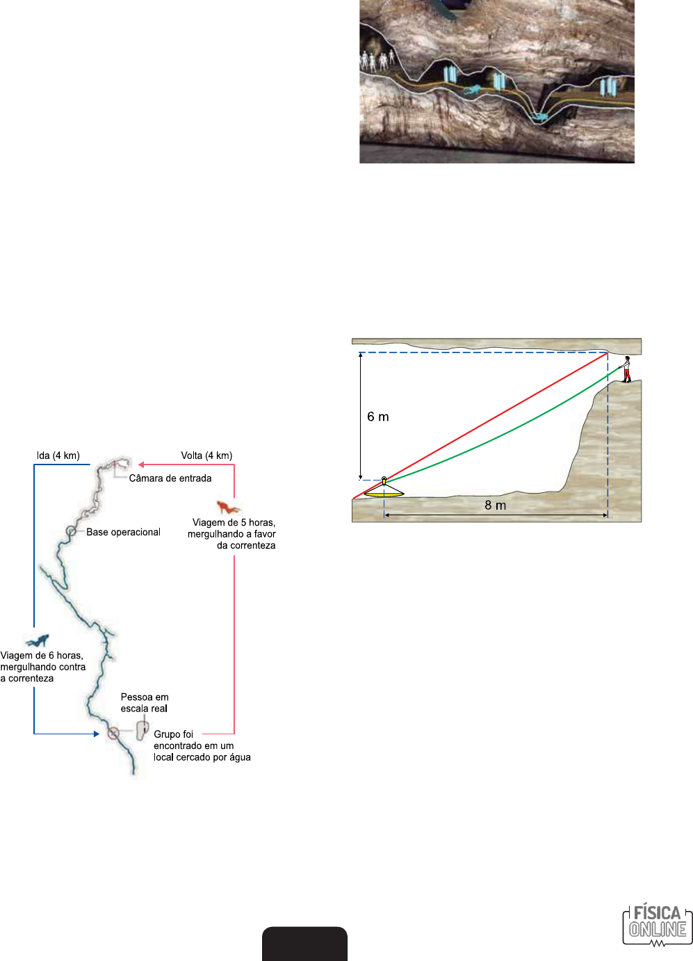 <p>47</p><p>Fí</p><p>si</p><p>ca</p><p>-</p><p>1.</p><p>00</p><p>0</p><p>Q</p><p>ue</p><p>st</p><p>õe</p><p>s</p><p>9.</p><p>O resgate dos jovens tailandeses</p><p>Terminado o treino de futebol, 12 integrantes dos Javalis</p><p>Selvagens e seu técnico correram para a caverna de</p><p>Tham Luang, onde comemorariam o aniversário de um</p><p>dos integrantes do time.</p><p>No interior da caverna, a equipe foi surpreendida pelas</p><p>enxurradas de uma forte chuva repentina, que bloquea-</p><p>ram a entrada e forçaram os jovens a se infiltrarem 4 km</p><p>para o interior da caverna.</p><p>Ao constatar-se a localização do grupo, teve início uma</p><p>busca complexa, envolvendo mergulhadores e profissio-</p><p>nais de vários lugares do mundo.</p><p>Diversas opções de resgate foram descartadas por seus</p><p>riscos, e a opção escolhida foi a de que os jovens teriam</p><p>que aprender técnicas básicas de mergulho e, ajudados</p><p>pelos mergulhadores e pela equipe de apoio, chegariam</p><p>até a entrada da caverna.</p><p>Em uma grande câmara seca no interior da caverna foi</p><p>instalada uma base operacional. Para garantir a energia</p><p>elétrica do local, uma extensão de 1 km de comprimento</p><p>trazia energia elétrica dos geradores instalados fora da</p><p>caverna.</p><p>A viagem de ida e volta leva 11 horas</p><p>Abaixo e à direita, percurso mais profundo e difícil do</p><p>mergulho, em formato de sifão, com trinta metros abaixo</p><p>da água.</p><p>(https://planetim.com.br. Adaptado.)</p><p>Esquema do sistema elaborado para erguer as macas</p><p>(em vermelho, a corda presa nas rochas para guiar a</p><p>subida da maca).</p><p>www.bbc.com. (Adaptado).</p><p>Todo o percurso era complexo. Um trecho difícil do</p><p>mergulho, e também o mais profundo, envolvia a sub-</p><p>mersão a 30 m abaixo do nível da água, transpondo um</p><p>trecho em formato de sifão. Apesar do uso de lanternas</p><p>potentes, a única segurança para a rota a ser seguida</p><p>era garantida por uma corda estendida pelo interior dos</p><p>túneis alagados.</p><p>Abaixo e à direita, percurso mais profundo e difícil do</p><p>mergulho, em formato de sifão, com trinta metros abaixo</p><p>da água.</p><p>(https://planetim.com.br. Adaptado.)</p><p>Esquema do sistema elaborado para erguer as macas</p><p>(em vermelho, a corda presa nas rochas para guiar a</p><p>subida da maca).</p><p>Em trechos secos, onde deveriam ser realizadas es-</p><p>caladas, a equipe de resgate instalou um sistema de</p><p>cordas, que permitia a subida de cada jovem, deitado</p><p>em uma maca.</p><p>Abaixo e à direita, percurso mais profundo e difícil do</p><p>mergulho, em formato de sifão, com trinta metros abaixo</p><p>da água.</p><p>(https://planetim.com.br. Adaptado.)</p><p>Esquema do sistema elaborado para erguer as macas</p><p>(em vermelho, a corda presa nas rochas para guiar a</p><p>subida da maca).</p><p>Concomitante a uma trégua das chuvas e feitos todos os</p><p>acertos logísticos, os jovens foram resgatados graças ao</p><p>empenho e ao profissionalismo de todos os envolvidos.</p><p>Considere o esquema elaborado para erguer a maca.</p><p>Supondo que em um dos resgates o conjunto maca e</p><p>jovem tivesse 90 kg e utilizando g = 10 m/s2, o valor</p><p>absoluto do trabalho da força peso sobre o conjunto du-</p><p>rante o içamento, desde o ponto mais baixo até alcançar</p><p>o patamar superior, seria</p><p>A) 4.500 J.</p><p>B) 2.700 J.</p><p>C) 7.200 J.</p><p>D) 5.400 J.</p><p>E) 9.000 J.</p>