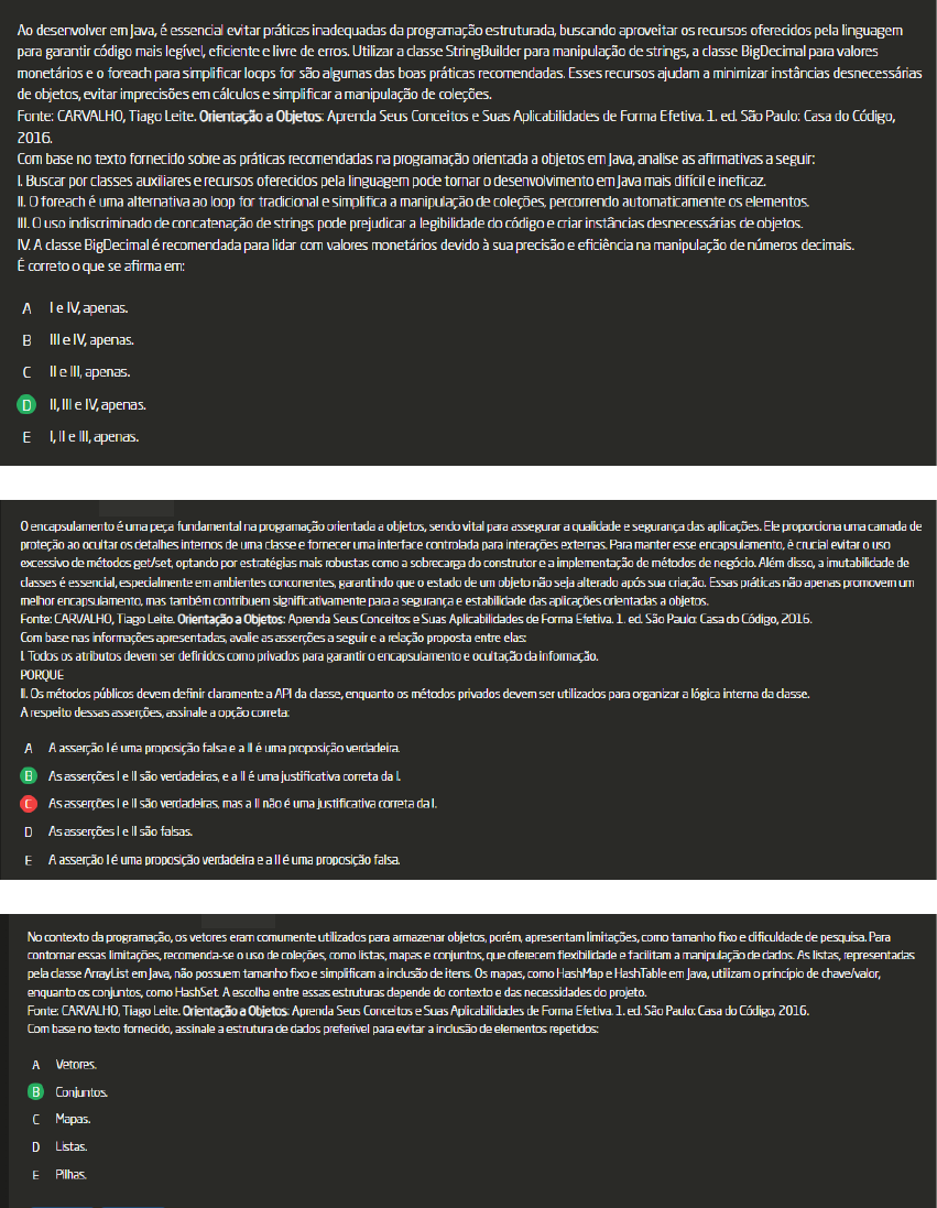 <p>Ao desenvolver em Java, é essencial evitar práticas inadequadas da programação estruturada, buscando aproveitar os recursos oferecidos pela linguagem para garantir código mais legível, eficiente e livre de erros. Utilizar a classe StringBuilder para manipulação de strings, a classe BigDecimal para valores monetários e foreach para simplificar loops for são algumas das boas práticas recomendadas. Esses recursos ajudam a minimizar instâncias desnecessárias de objetos, evitar imprecisões em cálculos e simplificar a manipulação de coleções. Fonte: CARVALHO, Tiago Leite. Orientação a Objetos: Aprenda Seus Conceitos e Suas Aplicabilidades de Forma 1. ed. São Paulo: Casa do Código, 2016. Com base no texto fornecido sobre as práticas recomendadas na programação orientada a objetos em Java, analise as afirmativas a seguir: Buscar por classes auxiliares e recursos oferecidos pela linguagem pode tornar desenvolvimento em Java mais difícil e II. 0 foreach é uma alternativa ao loop for tradicional e simplifica a manipulação de coleções, percorrendo automaticamente elementos. III. indiscriminado de concatenação de strings pode prejudicar a legibilidade do código e criar instâncias desnecessárias de objetos IV. A classe BigDecimal é recomendada para lidar com valores monetários devido à sua precisão e eficiência na manipulação de números decimais. É correto que se afirma em: A le IV, apenas. B III e IV, apenas. II e III, apenas. D II, III e IV, apenas. E I, e III, apenas. é uma peça fundamental na programação orientada a objetos, sendo vital para assegurar a qualidade e segurança das aplicações Ele proporciona uma camada de proteção ao ocultar os detalhes internos de uma classe e fornecer uma interface controlada para interações Para manter esse encapsulamento é crucial evitar excessivo de métodos get/set, optando por estratégias mais robustas como a sobrecarga do construtor e a implementação de métodos de negócio. Além disso, a imutabilidade de classes é essencial, especialmente em ambientes concorrentes, garantindo que estado de um objeto não seja alterado após sua criação. Essas práticas não apenas promovem um melhor encapsulamento, mas também contribuem significativamente para a segurança e estabilidade das aplicações orientadas a Fonte: Tiago Leite. Orientação a Aprenda Seus Conceitos e Suas Aplicabilidades de Forma 1 ed São Paulo: Casa do Código, 2016. Com base nas informações apresentadas, avalie as asserções a seguir e a relação proposta entre elas: Todos atributos devem ser definidos como privados para garantir encapsulamento e ocultação da PORQUE II. Os métodos públicos devem definir claramente a API da classe, enquanto os métodos privados devem ser utilizados para organizar a lógica interna da classe. A respeito dessas asserções, assinale a opção correta: A A asserção lé uma proposição falsa e a é uma proposição As asserções le são verdadeiras, e al é uma justificativa correta da I. As asserções II são verdadeiras, mas a não é uma justificativa correta da I. D As asserções são E A asserção lé uma proposição verdadeira e allé uma proposição falsa. No contexto da programação, vetores eram comumente utilizados para armazenar objetos, porém, apresentam limitações, como tamanho fixo e dificuldade de pesquisa Para contornar essas limitações, recomenda-se uso de coleções, como listas, mapas e conjuntos, que oferecem flexibilidade e facilitam a manipulação de As listas, representadas pela classe ArrayList em Java, não possuem tamanho fixo e simplificam a inclusão de Os mapas, como HashMap e HashTable em Java, utilizam princípio de chave/valor, enquanto os conjuntos, como A escolha entre essas estruturas depende do contexto e das necessidades do projeto. Fonte: CARVALHO, Tiago Leite. Orientação a Aprenda Seus Conceitos e Suas Aplicabilidades de Forma Efetiva São Casa do Código, 2016. Com base no texto fornecido, assinale a estrutura de dados preferível para evitar a inclusão de elementos repetidos: A Vetores Mapas D E</p><p>A Programação Orientada a Objetos (POO) é uma abordagem de desenvolvimento de software que modela objetos do mundo Ela utiliza conceitos como abstração, que simplifica a complexidade por meio de modelos encapsulamento, que oculta detalhes e que permite criar novas classes com base em classes Além disso, a associação une objetos com interesses Fonte: adaptado CARVALHO, Tiago Leite Orientação a Aprenda seus conceitos e suas aplicabilidades de forma efetiva. 1. São Paulo: Casa do Código, 2016. Na biblioteca, diversas classes são fundamentais para adequado gerenciamento de recursos e Entre destacam-se "Livro", "Autor", "Pessoa" e Um exemplo notável éo autor "Guimarães Rosa", cuja obra "Grande está disponível para A classe "Livro" possui atributos como "nome", "cargo" e "data de empréstimo", além dos métodos e "listarAutor()", permitindo uma gestão eficiente das operações de empréstimo e fornecendo informações sobre os autores das obras. Com base no exposto, analise as afirmativas a Pessoa herda característica de Livros II. A classe Autor é uma associação da classe Livro. III. A classe Livros encapsula atributos e Funcionário e Autor herdam características de correto que se afirma III IV, II, IV, II III, D le IV, E III, Na programação orientada a objetos, tanto as interfaces quanto as classes abstratas desempenham papéis fundamentais, porém com distinções cruciais. Enquanto as classes abstratas estabelecem hierarquias de subtipos, definindo um modelo com métodos concretos e abstratos, as interfaces especificam acordos que devem ser implementados por outras fornecendo uma abordagem flexível para interações entre objetos É importante ressaltar que tanto as abstratas quanto as interfaces não podem ser utilizadas para criar objetos Fonte: CARVALHO, Tiago Orientação a Objetos Aprenda Seus Conceitos e