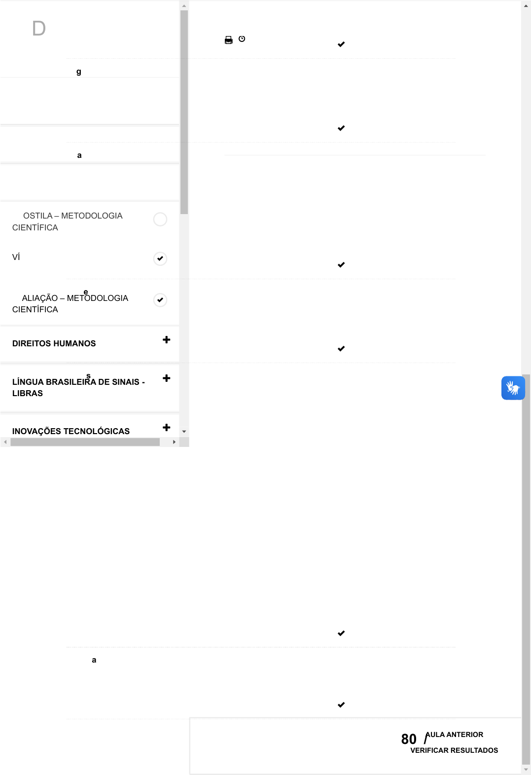 <p>07/10/2024 10:39 Course Status – Educaminas</p><p>https://ava.educaminas.com.br/course-status/ 1/1</p><p> 2 HORAS</p><p>AVALIAÇÃO –</p><p>METODOLOGIA</p><p>CIENTÍFICA</p><p></p><p>ADMINISTRAÇÃO</p><p>PÚBLICA</p><p>AMBIENTAÇÃO NO PORTAL DO</p><p>ALUNO</p><p></p><p>ÉTICA GERAL E PROFISSIONAL </p><p>METODOLOGIA CIENTÍFICA </p><p>APOSTILA – METODOLOGIA</p><p>CIENTÍFICA</p><p>VÍDEO AULA – METODOLOGIA</p><p>CIENTÍFICA</p><p></p><p>AVALIAÇÃO – METODOLOGIA</p><p>CIENTÍFICA</p><p></p><p>DIREITOS HUMANOS </p><p>LÍNGUA BRASILEIRA DE SINAIS -</p><p>LIBRAS</p><p></p><p>INOVAÇÕES TECNOLÓGICAS </p><p>AULA ANTERIOR</p><p>VERIFICAR RESULTADOS</p><p>80 / 100</p><p>PONTUAÇÃO TOTAL: 10PONTUAÇÃO OBTIDA 10</p><p>É uma suposta resposta ao problema a ser investigado. A origem das hipóteses poderia estar na</p><p>observação assistemática dos fatos, nos resultados de outras pesquisas, nas teorias existentes, ou na</p><p>simples intuição (GIL, 1999).</p><p>PONTUAÇÃO TOTAL: 10PONTUAÇÃO OBTIDA 10</p><p>Segundo a ABNT marque a alternativa CORRETA que relaciona as regras gerais de formatação:</p><p>Resposta Marcada :</p><p>Elementos pré-textuais: Iniciar no anverso da folha (somente frente), exceto a autorização do autor para a</p><p>reprodução do trabalho e a ficha catalográfica que é impressa no verso da folha de rosto.</p><p>PONTUAÇÃO TOTAL: 10PONTUAÇÃO OBTIDA 10</p><p>Citação é a menção, no texto, de informação extraída de outra fonte para esclarecer, ilustrar ou</p><p>sustentar o assunto apresentado, podendo aparecer no texto ou em notas de rodapé. Todas as</p><p>citações do texto devem constar nas Referências, assim como todos os documentos relacionados</p><p>nas Referências devem ser citados no texto. É uma obrigação e respeito aos ‘direitos autorais’.</p><p>Marque a alternativa que NÃO está de acordo com os modos básicos de se apresentar a citação:</p><p>Resposta Marcada :</p><p>Citação de citação: não se aplica referência direta ou indireta de um texto em que não se teve acesso ao</p><p>original.</p><p>PONTUAÇÃO TOTAL: 10PONTUAÇÃO OBTIDA 10</p><p>São elementos para enriquecer o texto acadêmico: as citações, as notas de rodapé, as alíneas, as</p><p>ilustrações, tabelas e gráficos. Assim, as citações podem seguir os sistemas:</p><p>Resposta Marcada :</p><p>Númerico ou autor-data.</p><p>PONTUAÇÃO TOTAL: 10PONTUAÇÃO OBTIDA 10</p><p>Analise as afirmativas sobre conceitos de pesquisa científica e assinale V para verdadeiro e F para</p><p>falso.</p><p>( ) Pesquisa metodológica: Quando são criados métodos e instrumentos para captar informações</p><p>e se chegar a determinado fim. Esse tipo é mais ligado a caminhos, formas, maneiras e</p><p>procedimentos para se chegar a alguma solução.</p><p>( ) Pesquisa exploratória: O único objetivo desse tipo é descrever características de alguma</p><p>população ou fenômeno. Ela é a base para análises posteriores, mas não tem a responsabilidade</p><p>de fazer nenhuma correlação entre os dados encontrados.</p><p>( ) Pesquisa descritiva: É utilizada quando ainda não se tem muitas informações sobre o campo</p><p>que se pretende abordar. Por isso, naturalmente, ela não é baseada em hipóteses, já que as</p><p>informações necessárias para isso ainda serão descobertas.</p><p>( ) Pesquisa intervencionista: Quando o objetivo não é apenas apresentá-la e/ou descrevê-la, mas</p><p>interferir de algum modo, propondo e implementando soluções para os problemas encontrados,</p><p>ela é definida como intervencionista.</p><p>Marque a alternativa correta.</p><p>Resposta Marcada :</p><p>V, F, F, V.</p><p>PONTUAÇÃO TOTAL: 10PONTUAÇÃO OBTIDA 10</p><p>Sobre as ilustrações, marque a alternativa INCORRETA:</p><p>Resposta Marcada :</p><p>A identificação das ilustrações deve aparecer na parte inferior da página.</p><p>Total</p><p>https://ava.educaminas.com.br/membros/00853649758/course/course-results/?action=216215</p>