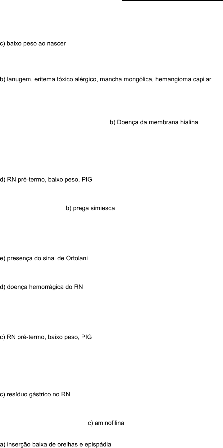 <p>BANCO P1 PEDIATRIA</p><p>NEONATOLOGIA:</p><p>1 – Um RN com Peso = 2350g pode ser classificado como:</p><p>a) prematuro</p><p>b) prematuro e baixo peso ao nascer</p><p>c) baixo peso ao nascer</p><p>d) muito baixo peso ao nascer</p><p>2 – No exame físico do RN consideramos normais os seguintes achados:</p><p>a) mancha mongólica, artéria umbilical única, edema de mãos e pés e fontanela deprimida</p><p>b) lanugem, eritema tóxico alérgico, mancha mongólica, hemangioma capilar</p><p>c) suturas separadas, hidrocele, eritema tóxico alérgico, vérnix caseoso</p><p>d) vérnix caseoso, eritema tóxico alérgico, icterícia e edema de mãos e pés</p><p>e) descamação de pele, suturas separadas, quisto gengival e icterícia</p><p>3 – Das patologias neonatais descritas abaixo qual apresenta maior índice de mortalidade?</p><p>a) Taquipnéia transitória do RN b) Doença da membrana hialina c) Pneumonia congênita</p><p>d) Icterícia neonatal</p><p>4 – RN de 35 semanas de IG (Capurro), apresenta os seguintes dados antropométricos: P=1890g, Comp=42 cm, PC=31 cm,</p><p>PT=30 cm. Na avaliação dos percentis, todos estão abaixo do percentil 10. Classifique este RN:</p><p>a) RN a termo, AIG</p><p>b) RN pré-termo, baixo peso, GIG</p><p>c) RN pós-termo, muito baixo peso, PIG</p><p>d) RN pré-termo, baixo peso, PIG</p><p>e) RN a termo, baixo peso, GIG</p><p>5 – São achados normais do exame físico do RN, exceto:</p><p>a) milium facial b) prega simiesca c) apêndices pré-auriculares d) mancha mongólica</p><p>6 – O diagnóstico clínico precoce da luxação congênita do quadril é feito na:</p><p>a) ausência do reflexo de reptação</p><p>b) ausência do sinal de Barlow</p><p>c) Ausência do reflexo de apoio plantar</p><p>d) presença de pé torto congênito</p><p>e) presença do sinal de Ortolani</p><p>7 – A administração de vitamina K logo após o nascimento é uma medida que visa prevenção de:</p><p>a) oftalmia gonocócica b) icterícia neonatal c) doença estafilocócica neonatal</p><p>d) doença hemorrágica do RN e) herpes congênito</p><p>8 – RN com 35 sem de ig (Capurro) apresenta os seguintes achado antropométricos: P = 1890g, Comp = 42 cm, PC = 31 cm</p><p>e PT = 30 cm. Na avaliação os percentis de peso, comprimento e perímetro cefálico estão abaixo de 2 desvios-padrão da</p><p>curva de crescimento. Classifique o RN:</p><p>a) RN a termo, AIG</p><p>b) RN pré-termo, baixo peso, GIG</p><p>c) RN pré-termo, baixo peso, PIG</p><p>d) RN pré-termo, muito baixo peso, PIG</p><p>e) RN a termo, muito baixo peso, PIG</p><p>9 – Alguns achados são bastante sugestivos de necrose e devem ser considerados indicação de tratamento cirúrgico na</p><p>enterocolite necrosante, com exceção de:</p><p>a) massa abdominal palpável fixa</p><p>b) eritema progressivo da parede abdominal</p><p>c) resíduo gástrico no RN</p><p>d) alça intestinal persistentemente dilatada</p><p>e) gás na veia porta em associação com acidose metabólica persistente</p><p>10 – Qual a droga de escolha para o tratamento da apnéia do prematuro?</p><p>a) surfactante b) bromoprida c) aminofilina d) corticóide</p><p>11 – Em relação ao exame físico do RN, são características normais, exceto:</p><p>a) inserção baixa de orelhas e epispádia</p><p>Sony</p><p>Realce</p><p>Sony</p><p>Realce</p><p>Sony</p><p>Realce</p><p>Sony</p><p>Realce</p><p>Sony</p><p>Realce</p><p>Sony</p><p>Realce</p><p>Sony</p><p>Realce</p><p>Sony</p><p>Realce</p><p>Sony</p><p>Realce</p><p>Sony</p><p>Realce</p><p>Sony</p><p>Realce</p><p>b) RN com 40 semanas e descamação de pele</p><p>c) edema bipalpebral e bossa serossanguínea</p><p>d) mancha mongólica e petéquias na face</p><p>e) pérolas de epstein e vérnix caseoso em dobras</p><p>12 – Os RNs abaixo têm indicação de alojamento conjunto, exceto:</p><p>a) RN com 38 semanas, 2900g, apgar 7/8, com dificuldade de mamar no seio da mãe</p><p>b) RN nascido de parto cesáreo, com 48 horas de vida e ictérico na face</p><p>c) RN de 35 semanas, 2100g, com reflexos presentes</p><p>d) RN de 32 semanas, 1950g, apgar 5/7, FR 67mrpm, com 10h de vida</p><p>e) RN de 34 semanas, 2050g, parto vaginal, bolsa rota há 24 horas, ativo e eupnéico</p><p>13 – RN a termo, em BEG, apresenta na primeiras 48 horas de vida máculas eritematosas, pápulas e pústulas disseminadas</p><p>na face, tronco e membros inferiores e superiores. O esfregaço obtido de uma pústula revelou presença de eosinófilos. O</p><p>diagnóstico provável é:</p><p>a) melanose pustulosa transitória neonatal</p><p>b) eritema tóxico neonatal</p><p>c) miliária neonatal</p><p>d) herpes simples neonatal</p><p>e) impetigo neonatal</p><p>DESENVOLVIMENTO E CRESCIMENTO:</p><p>53 – Dentre as faixas etárias abaixo, qual apresenta a etapa do desenvolvimento mais adequada?</p><p>a) 7m – senta sem apoio b) 9m – pinça delicada c) 4m – reflexo de moro d) 5m – engatinha</p><p>e) 3m – reflexo de preensão plantar</p><p>54 – Dentre os reflexos arcaicos do RN, citado abaixo, qual leva mais tempo para desaparecer?</p><p>a) reflexo de moro</p><p>b) reflexo de fuga à asfixia</p><p>c) reflexo cutâneo plantar</p><p>d) reflexo de marcha</p><p>55 – Em relação ao crescimento infantil é correto afirmar:</p><p>a) O crescimento linfóide aumenta até os anos escolares e depois involui</p><p>b) A criança triplica seu peso de nascimento ao redor dos 10 meses de idade</p><p>c) O crescimento genital é praticamente residual até a idade de 8 anos e após esta idade aumenta muito</p><p>d) A criança aumenta cerca de 15 cm no primeiro ano de vida</p><p>e) Considera-se que uma criança apresenta baixa estatura quando sua estatura encontra-se abaixo do percentil 10.</p><p>56 – Menino de 12 meses de idade, peso do nascimento de 3500g, estatura de 50 cm e PC de 34 cm. Como seria o crescimento</p><p>esperado para os 12 meses?</p><p>a) 10,5kg, 75 cm, 46 cm b) 12kg, 80 cm, 49 cm c) 9kg, 75cm, 44cm d) 10,5kg, 80c