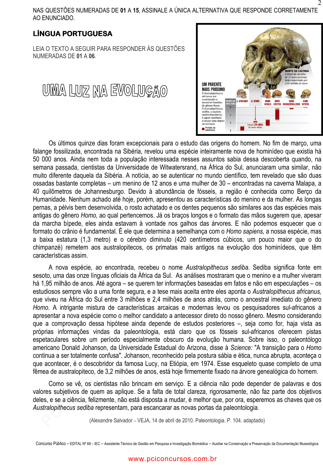 <p>pcimarkpci MDAwMDowMDAwOjAwMDA6MDAwMDowMDAwOmZmZmY6YzkzNzoyZTRm:V2VkLCAyMyBPY3QgMjAyNCAxOToyOTowMyAtMDMwMA==</p><p>www.pciconcursos.com.br</p><p>Concurso Público – EDITAL Nº 68 – IEC – Assistente Técnico de Gestão em Pesquisa e Investigação Biomédica – Auxiliar na Conservação e Preservação da Documentação Museológica</p><p>2</p><p>NAS QUESTÕES NUMERADAS DE 01 A 15, ASSINALE A ÚNICA ALTERNATIVA QUE RESPONDE CORRETAMENTE</p><p>AO ENUNCIADO.</p><p>LÍNGUA PORTUGUESALÍNGUA PORTUGUESALÍNGUA PORTUGUESALÍNGUA PORTUGUESA</p><p>LEIA O TEXTO A SEGUIR PARA RESPONDER ÀS QUESTÕES</p><p>NUMERADAS DE 01 A 06.</p><p>Os últimos quinze dias foram excepcionais para o estudo das origens do homem. No fim de março, uma</p><p>falange fossilizada, encontrada na Sibéria, revelou uma espécie inteiramente nova de hominídeo que existia há</p><p>50 000 anos. Ainda nem toda a população interessada nesses assuntos sabia dessa descoberta quando, na</p><p>semana passada, cientistas da Universidade de Witwatersrand, na África do Sul, anunciaram uma similar, não</p><p>muito diferente daquela da Sibéria. A notícia, ao se autenticar no mundo científico, tem revelado que são duas</p><p>ossadas bastante completas – um menino de 12 anos e uma mulher de 30 – encontradas na caverna Malapa, a</p><p>40 quilômetros de Johannesburgo. Devido à abundância de fósseis, a região é conhecida como Berço da</p><p>Humanidade. Nenhum achado até hoje, porém, apresentou as características do menino e da mulher. As longas</p><p>pernas, a pélvis bem desenvolvida, o rosto achatado e os dentes pequenos são similares aos das espécies mais</p><p>antigas do gênero Homo, ao qual pertencemos. Já os braços longos e o formato das mãos sugerem que, apesar</p><p>da marcha bípede, eles ainda estavam à vontade nos galhos das árvores. E não podemos esquecer que o</p><p>formato do crânio é fundamental. É ele que determina a semelhança com o Homo sapiens, a nossa espécie, mas</p><p>a baixa estatura (1,3 metro) e o cérebro diminuto (420 centímetros cúbicos, um pouco maior que o do</p><p>chimpanzé) remetem aos australopitecos, os primatas mais antigos na evolução dos hominídeos, que têm</p><p>características assim.</p><p>A nova espécie, ao encontrada, recebeu o nome Australopithecus sediba. Sediba significa fonte em</p><p>sesoto, uma das onze línguas oficiais da África da Sul. As análises mostraram que o menino e a mulher viveram</p><p>há 1,95 milhão de anos. Até agora – se querem ter informações baseadas em fatos e não em especulações – os</p><p>estudiosos sempre vão a uma fonte segura, e a tese mais aceita entre eles aponta o Australopithecus africanus,</p><p>que viveu na África do Sul entre 3 milhões e 2,4 milhões de anos atrás, como o ancestral imediato do gênero</p><p>Homo. A intrigante mistura de características arcaicas e modernas levou os pesquisadores sul-africanos a</p><p>apresentar a nova espécie como o melhor candidato a antecessor direto do nosso gênero. Mesmo considerando</p><p>que a comprovação dessa hipótese ainda depende de estudos posteriores –, seja como for, haja vista as</p><p>próprias informações vindas da paleontologia, está claro que os fósseis sul-africanos oferecem pistas</p><p>espetaculares sobre um período especialmente obscuro da evolução humana. Sobre isso, o paleontólogo</p><p>americano Donald Johanson, da Universidade Estadual do Arizona, disse à Science: "A transição para o Homo</p><p>continua a ser totalmente confusa". Johanson, reconhecido pela postura sábia e ética, nunca abrupta, aconteça o</p><p>que acontecer, é o descobridor da famosa Lucy, na Etiópia, em 1974. Esse esqueleto quase completo de uma</p><p>fêmea de australopiteco, de 3,2 milhões de anos, está hoje firmemente fixado na árvore genealógica do homem.</p><p>Como se vê, os cientistas não brincam em serviço. E a ciência não pode depender de palavras e dos</p><p>valores subjetivos de quem as aplique. Se a falta de total clareza, rigorosamente, não faz parte dos objetivos</p><p>deles, e se a ciência, felizmente, não está disposta a mudar, é melhor que, por ora, esperemos as chaves que os</p><p>Australopithecus sediba representam, para escancarar as novas portas da paleontologia.</p><p>(Alexandre Salvador – VEJA, 14 de abril de 2010. Paleontologia. P. 104. adaptado)</p><p>www.pciconcursos.com.br</p><p>pcimarkpci MDAwMDowMDAwOjAwMDA6MDAwMDowMDAwOmZmZmY6YzkzNzoyZTRm:V2VkLCAyMyBPY3QgMjAyNCAxOToyOTowMyAtMDMwMA==</p><p>www.pciconcursos.com.br</p><p>Concurso Público – EDITAL Nº 68 – IEC – Assistente Técnico de Gestão em Pesquisa e Investigação Biomédica – Auxiliar na Conservação e Preservação da Documentação Museológica</p><p>3</p><p>01. No último parágrafo, o autor faz uso da seguinte construção:</p><p>“E a ciência não pode depender apenas de palavras e dos valores subjetivos de quem as aplique.”. Isso significa</p><p>que</p><p>A) a ciência tem caráter subjetivo, uma vez que depende de opinião, ou seja, obedece a padrões individuais.</p><p>B) as palavras tomam significado de acordo com padrões individuais.</p><p>C) a ciência, assim como a palavra, caracteriza-se pela univocidade.</p><p>D) a ciência e as palavras modificam os valores de quem as enuncia.</p><p>02. “A notícia, ao se autenticar no mundo científico, tem revelado que são duas ossadas bastante completas ...”</p><p>(1º parágrafo).</p><p>A forma verbal do segmento de texto acima mostra uma ação:</p><p>A) que se iniciou em passado próximo e terminou no presente.</p><p>B) que se repete no passado e se interrompe no presente.</p><p>C) repetida com continuidade até o presente em que falamos.</p><p>D) que se iniciou no presente com continuidade hipotética no futuro.</p><p>03. Avalie as afirmativas a seguir, a respeito dos elementos linguísticos do texto:</p><p>1. Se usássemos o pronome nos anteposto ao verbo esquecer em “