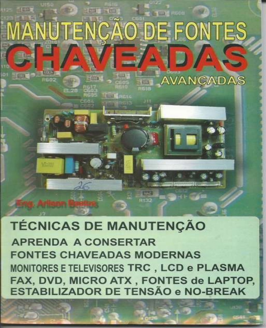 <p>Eng. Arilson Bastos - Manutenção de Fontes Chaveadas Avançadas ii</p><p>Eng. Arilson Bastos</p><p>Manutenção</p><p>de</p><p>Fontes Chaveadas</p><p>Avançadas</p><p>Rio de Janeiro – RJ</p><p>Eng. Arilson Bastos</p><p>Manutenção de Fontes Chaveadas</p><p>Avançadas</p><p>Capa: Omiro Lopes</p><p>Ilustrações-Editoração Eletrônica: Evandro C. F. Lanzillota</p><p>Revisora: Adriana Franco</p><p>ISBN - 978-85-99920-04-6</p><p>Copyright 2008 by Arilson Bastos</p><p>Todos os direitos reservados. Proibida a reprodução total ou parcial, por</p><p>qualquer meio ou processo, especialmente por sistemas gráficos, microfílmicos,</p><p>fotográficos, reprográficos, videográficos. Vedada a memorização e/ou</p><p>recuperação total ou parcial por meio eletrônico, sistema de processamento de</p><p>dados e a inclusão de qualquer parte da obra em qualquer programa juscibernético.</p><p>Essas proibições se aplicam também às características gráficas da obra e à sua</p><p>editoração. A violação dos direitos autorais é punível como crime (art. 184 e</p><p>parágrafos, do Código Penal, cf. Lei n</p><p>0</p><p>6.895, de 17/12/1980) com pena de prisão</p><p>e multa, conjuntamente com busca e apreensão e indenizações diversas (artigos</p><p>122, 123, 124, 126, da Lei n</p><p>0</p><p>5.988, de 14/12/1973, Lei dos Direitos Autorais).</p><p>Este livro foi registrado na Fundação Biblioteca Nacional.</p><p>Eng. Arilson Bastos - Manutenção de Fontes Chaveadas Avançadas ii</p><p>MARCAS REGISTRADAS</p><p>Várias marcas registradas são citadas no decorrer deste livro. Mais</p><p>do que simplesmente listar esses nomes e informar quem possui seus</p><p>direitos de exploração ou ainda de imprimir logotipos, o autor declara estar</p><p>utilizando tais nomes apenas para fins editoriais e declara estar utilizando</p><p>parte de alguns circuitos eletrônicos os quais foram levantados em</p><p>pesquisas de laboratório e literaturas já editadas e expostas ao comércio</p><p>livre editorial, exclusivamente para fins didáticos, em benefício exclusivo</p><p>do detentor da marca registrada, sem intenção de infringir as regras básicas</p><p>de autenticidade de sua utilização e direitos autorais.</p><p>ADVERTÊNCIA</p><p>O editor e autor não se responsabilizam por quaisquer erros,</p><p>omissões que por ventura sejam identificados ou possa causar danos por</p><p>mau uso destas informações. Sugerimos que o leitor ao realizar qualquer</p><p>manutenção siga a todos os procedimentos com cautela, e atenção para que</p><p>não aconteçam acidentes que possam danificar os equipamentos nem</p><p>tampouco afetar a segurança física do técnico reparador.</p><p>“A educação tecnológica é o início do caminho</p><p>para o sucesso profissional.”</p><p>Arilson Bastos</p><p>SOBRE O AUTOR</p><p>O Eng. Arilson Bastos é professor das Universidades Gama Filho/RJ</p><p>e Veiga de Almeida/RJ, onde ministra disciplinas da área de eletrônica.</p><p>Eng. Arilson Bastos - Manutenção de Fontes Chaveadas Avançadas iii</p><p>PREFÁCIO</p><p>Hoje em dia, qualquer eletrodoméstico que o leitor adquira ou</p><p>tenha no seu lar, por exemplo, televisão, monitor de vídeo, micro system,</p><p>DVD player, videocassete, fax, telefone sem fio, microcomputador, CD</p><p>player e etc, com certeza possuem uma fonte interna que alimenta os</p><p>circuitos eletro-eletrônicos, e esta fonte naturalmente possui tecnologias</p><p>lineares e/ou não lineares.</p><p>A eletrônica se transforma a cada minuto; a tecnologia é</p><p>ultrapassada a passos largos, que às vezes nos atropela. Por muitas vezes</p><p>não há tempo hábil para nós técnicos aperfeiçoarmos e acompanharmos a</p><p>evolução tecnológica; aí é que “mora o perigo”.</p><p>Se o técnico que é da antiga, ou seja, já possui longa experiência</p><p>em manutenção de aparelhos eletrônicos e não se requalificou, não se</p><p>atualizou, este está prestes a fechar as portas ao mercado, visto que toda a</p><p>tecnologia mudou, os conceitos foram substituídos, os circuitos eletrônicos</p><p>ficaram mais complexos.</p><p>A nossa proposta com este livro, é trazer ao caro leitor o desvendar</p><p>do antigo tabú de que “fonte chaveada” é um segredo.</p><p>O objetivo é abrir os caminhos para a informação técnica sobre as</p><p>fontes lineares e as não lineares que são as fontes modernas chamadas de</p><p>fontes chaveadas. Devemos ressaltar que além de apresentarmos a teoria</p><p>básica necessária para o entendimento, compreensão e assimilação do</p><p>assunto, oferecemos ao leitor alguns circuitos de fontes com as suas</p><p>análises de funcionamento para que possam fazer as comparações</p><p>necessárias e dessa forma facilitar o aprendizado.</p><p>Inserimos também no escopo deste livro as técnicas de manutenção</p><p>das fontes chaveadas, complementando dessa forma os estudos teóricos e</p><p>práticos, que acreditamos serem altamente relevantes ao técnico reparador.</p><p>Sabemos que todo aparelho eletrônico tem embutido em si mesmo,</p><p>pelo menos uma uma fonte de alimentação. Isto porque a energia da rede</p><p>elétrica, para poder ser aproveitada, precisa primeiro ser transformada em</p><p>tensão contínua para depois vir a alimentar e abastecer os circuitos do</p><p>aparelho. A fonte de alimentação, como o nome diz, vem possibilitar o</p><p>fornecimento da energia necessária para o aparelho.</p><p>Um aparelho poderá ter mais de uma fonte de alimentação,</p><p>dependendo da necessidade dos seus circuitos internos. Cada tipo de</p><p>circuito solicita uma determinada tensão específica para poder funcionar.</p><p>Eng. Arilson Bastos - Manutenção de Fontes Chaveadas Avançadas iv</p><p>Assim, por exemplo, um aparelho digital poderá ter várias fontes de 5V,</p><p>12V e 3,3V (são as tensões mais comuns nestes aparelhos). Surge então, a</p><p>necessidade de controlar estas te