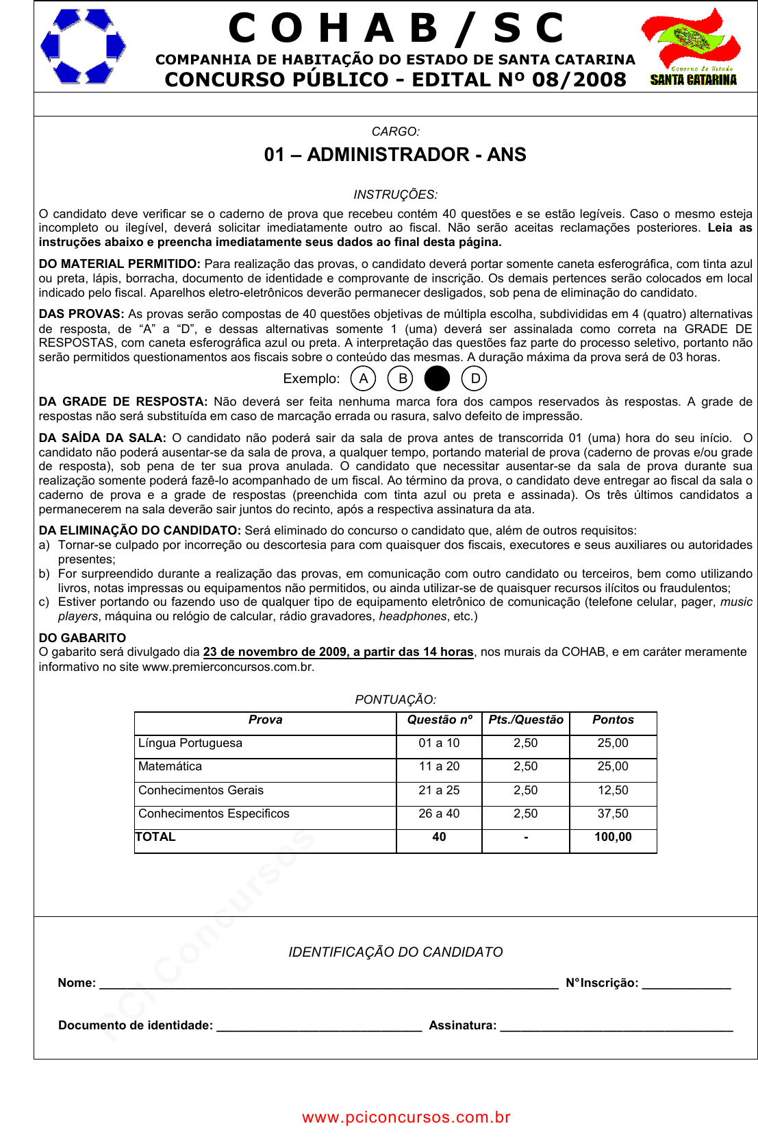 <p>pcimarkpci MDAwMDowMDAwOjAwMDA6MDAwMDowMDAwOmZmZmY6OTU0ZTpiYjZm:V2VkLCAyMyBPY3QgMjAyNCAyMToyNDoxNiAtMDMwMA==</p><p>www.pciconcursos.com.br</p><p>C O H A B / S C</p><p>COMPANHIA DE HABITAÇÃO DO ESTADO DE SANTA CATARINA CONCURSO PÚBLICO - EDITAL Nº 08/2008</p><p>CARGO:</p><p>01 – ADMINISTRADOR - ANS</p><p>INSTRUÇÕES:</p><p>O candidato deve verificar se o caderno de prova que recebeu contém 40 questões e se estão legíveis. Caso o mesmo esteja</p><p>incompleto ou ilegível, deverá solicitar imediatamente outro ao fiscal. Não serão aceitas reclamações posteriores. Leia as</p><p>instruções abaixo e preencha imediatamente seus dad os ao final desta página.</p><p>DO MATERIAL PERMITIDO: Para realização das provas, o candidato deverá portar somente caneta esferográfica, com tinta azul</p><p>ou preta, lápis, borracha, documento de identidade e comprovante de inscrição. Os demais pertences serão colocados em local</p><p>indicado pelo fiscal. Aparelhos eletro-eletrônicos deverão permanecer desligados, sob pena de eliminação do candidato.</p><p>DAS PROVAS: As provas serão compostas de 40 questões objetivas de múltipla escolha, subdivididas em 4 (quatro) alternativas</p><p>de resposta, de “A” a “D”, e dessas alternativas somente 1 (uma) deverá ser assinalada como correta na GRADE DE</p><p>RESPOSTAS, com caneta esferográfica azul ou preta. A interpretação das questões faz parte do processo seletivo, portanto não</p><p>serão permitidos questionamentos aos fiscais sobre o conteúdo das mesmas. A duração máxima da prova será de 03 horas.</p><p>Exemplo: A B C D</p><p>DA GRADE DE RESPOSTA: Não deverá ser feita nenhuma marca fora dos campos reservados às respostas. A grade de</p><p>respostas não será substituída em caso de marcação errada ou rasura, salvo defeito de impressão.</p><p>DA SAÍDA DA SALA: O candidato não poderá sair da sala de prova antes de transcorrida 01 (uma) hora do seu início. O</p><p>candidato não poderá ausentar-se da sala de prova, a qualquer tempo, portando material de prova (caderno de provas e/ou grade</p><p>de resposta), sob pena de ter sua prova anulada. O candidato que necessitar ausentar-se da sala de prova durante sua</p><p>realização somente poderá fazê-lo acompanhado de um fiscal. Ao término da prova, o candidato deve entregar ao fiscal da sala o</p><p>caderno de prova e a grade de respostas (preenchida com tinta azul ou preta e assinada). Os três últimos candidatos a</p><p>permanecerem na sala deverão sair juntos do recinto, após a respectiva assinatura da ata.</p><p>DA ELIMINAÇÃO DO CANDIDATO: Será eliminado do concurso o candidato que, além de outros requisitos:</p><p>a) Tornar-se culpado por incorreção ou descortesia para com quaisquer dos fiscais, executores e seus auxiliares ou autoridades</p><p>presentes;</p><p>b) For surpreendido durante a realização das provas, em comunicação com outro candidato ou terceiros, bem como utilizando</p><p>livros, notas impressas ou equipamentos não permitidos, ou ainda utilizar-se de quaisquer recursos ilícitos ou fraudulentos;</p><p>c) Estiver portando ou fazendo uso de qualquer tipo de equipamento eletrônico de comunicação (telefone celular, pager, music</p><p>players, máquina ou relógio de calcular, rádio gravadores, headphones, etc.)</p><p>DO GABARITO</p><p>O gabarito será divulgado dia 23 de novembro de 2009, a partir das 14 horas , nos murais da COHAB, e em caráter meramente</p><p>informativo no site www.premierconcursos.com.br.</p><p>PONTUAÇÃO:</p><p>Prova Questão nº Pts./Questão Pontos</p><p>Língua Portuguesa 01 a 10 2,50 25,00</p><p>Matemática 11 a 20 2,50 25,00</p><p>Conhecimentos Gerais 21 a 25 2,50 12,50</p><p>Conhecimentos Especificos 26 a 40 2,50 37,50</p><p>TOTAL 40 - 100,00</p><p>IDENTIFICAÇÃO DO CANDIDATO</p><p>Nome: _____________________________________________ ______________________ N° Inscrição: _____________</p><p>Documento de identidade: __________________________ ____ Assinatura: _________________________________ _</p><p>www.pciconcursos.com.br</p><p>pcimarkpci MDAwMDowMDAwOjAwMDA6MDAwMDowMDAwOmZmZmY6OTU0ZTpiYjZm:V2VkLCAyMyBPY3QgMjAyNCAyMToyNDoxNiAtMDMwMA==</p><p>www.pciconcursos.com.br</p><p>COHAB/SC</p><p>CONCURSO PÚBLICO - EDITAL Nº 08/2008</p><p>01 – ADMINISTRADOR - ANS</p><p>PROVA DE LÍNGUA PORTUGUESA</p><p>Leia o texto atentamente:</p><p>1. Há milênios, muito antes desse corpo de conheci-</p><p>2. mento que hoje chamamos de ciência existir, a relação</p><p>3. dos seres humanos com o mundo era bem diferente.</p><p>4. A Natureza era respeitada e idolatrada, e__única</p><p>5. responsável pela sobrevivência de nossa espécie,</p><p>6. a qual vivia basicamente da caça e de uma agricultura</p><p>7. bastante rudimentar. Na esperança de que catástrofes</p><p>8. naturais, tais como vulcões, tempestades ou furacões</p><p>9. não destruíssem as suas casas e plantações, ou</p><p>10. matassem os animais e peixes, várias culturas</p><p>11. atribuíram aspectos divinos __ Natureza. Os</p><p>12. pormenores desse processo de deificação da Natureza</p><p>13. variam de acordo com __localização, com o clima ou</p><p>14. com o grau de isolamento de um determinado grupo.</p><p>15. Em certas culturas, vários deuses controlavam (ou até</p><p>16. personificavam) as diferentes manifestações naturais,</p><p>17. enquanto em outras a própria Natureza era divina, a</p><p>18. “Deusa-Mãe”. Rituais e oferendas procuravam</p><p>19. conquistar a simpatia divina, garantindo assim a</p><p>20. sobrevivência do grupo. Através dessa relação com os</p><p>21. deuses, os indivíduos buscavam ordenar sua</p><p>22. existência, dando sentido __ fenômenos misteriosos e</p><p>23. ameaçadores. Por outro lado, a relação com eles tinha</p><p>24. também uma função social, impondo valores morais e</p><p>25. éticos que eram fundamentais para a coesão do grupo.</p><p>Marcelo Gleiser. A Dança do Universo. 