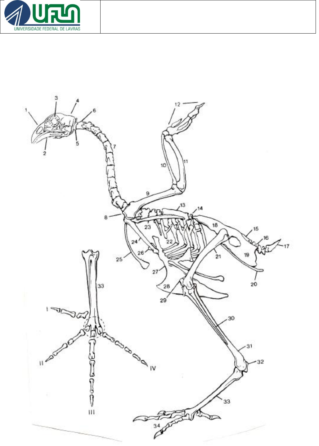 <p>DEPARTAMENTO DE MEDICINA VETERINÁRIA</p><p>Curso de Medicina Veterinária</p><p>GMV 204 – Anatomia Veterinária I</p><p>1</p><p>Prof. Gregório Corrêa Guimarães</p><p>Tema: roteiro de anatomia comparada dos ossos do membro torácico</p><p>AVES</p><p>Na imagem acima identifique cada osso do membro torácico (utilize setas).</p><p>DEPARTAMENTO DE MEDICINA VETERINÁRIA</p><p>Curso de Medicina Veterinária</p><p>GMV 204 – Anatomia Veterinária I</p><p>2</p><p>Membro torácico das aves</p><p>- Articulação do ombro (8)</p><p>- Escápula (23)</p><p>- Coracoide (24)</p><p>- Clavícula (25): a fusão das clavículas forma uma projeção denominada fúrcula</p><p>- Úmero (9)</p><p>- Rádio (10)</p><p>- Ulna (11)</p><p>- Mão (12)</p><p>→ o carpo das aves é formado por dois ossos (radial e ulnar do carpo);</p><p>→ os ossos da fileira distal do carpo se fusionam com os ossos metacárpicos para formar os ossos</p><p>carpometacárpicos (II, III e IV fusionados);</p><p>→ três dedos (II, III e IV)</p><p>DEPARTAMENTO DE MEDICINA VETERINÁRIA</p><p>Curso de Medicina Veterinária</p><p>GMV 204 – Anatomia Veterinária I</p><p>3</p><p>EQUINOS</p><p> ESCÁPULA</p><p>- mais estreita e mais alongada do que a dos bovinos (menos triangular)</p><p>- acrômio: ausente ou rudimentar</p><p> ÚMERO</p><p>- presença do tubérculo intermédio: situado entre os tubérculos maior e menor</p><p>- sulcos intertuberculares: lateral e medial</p><p> RÁDIO</p><p>- tuberosidade do rádio: bem desenvolvida</p><p>- rádio e ulna: fusionados</p><p>- espaço interósseo proximal: presente</p><p>- espaço interósseo distal: ausente</p><p>- processo estiloide lateral: é do rádio e não da ulna</p><p> ULNA</p><p>- sem processo estiloide</p><p> CARPO (exibe de 7 a 8 ossos)</p><p>- fileira proximal: radial, intermédio, ulnar e acessório do carpo</p><p>- fileira distal: cárpicos I (inconstante), II, III e IV</p><p>- não são observadas fusões ósseas como no carpo de ruminantes</p><p> METACARPO (3 ossos)</p><p>- metacárpico III: principal osso metacárpico</p><p>- metacárpicos II e IV: rudimentares (articulados na face palmar do metacárpico III)</p><p> DEDOS</p><p>- somente o III é desenvolvido</p><p>- possui 2 sesamoides proximais e 1 distal</p><p>- falanges: proximal, média e distal</p><p>→ os acidentes ósseos de maior importância estão na falange distal:</p><p>- face parietal</p><p>- face palmar ou solear</p><p>- face proximal ou articular</p><p>- margem coronária</p><p>- margem solear</p><p>DEPARTAMENTO DE MEDICINA VETERINÁRIA</p><p>Curso de Medicina Veterinária</p><p>GMV 204 – Anatomia Veterinária I</p><p>4</p><p>- processo extensor</p><p>- processos palmares lateral e medial</p><p>- forame ou incisura do processo palmar</p><p>- sulco parietal</p><p>- incisura/linha semilunar</p><p>- face / área flexora</p><p>- forame solear (lateral e medial)</p><p>- canal solear</p><p>Nas imagens a seguir tente identificar outros acidentes ósseos além daqueles descritos neste roteiro.</p><p>Utilize setas!</p><p>Ossos do membro torácico equino.</p><p>Vista lateral Vista medial</p><p>DEPARTAMENTO DE MEDICINA VETERINÁRIA</p><p>Curso de Medicina Veterinária</p><p>GMV 204 – Anatomia Veterinária I</p><p>5</p><p>Escápula – vista lateral</p><p>DEPARTAMENTO DE MEDICINA VETERINÁRIA</p><p>Curso de Medicina Veterinária</p><p>GMV 204 – Anatomia Veterinária I</p><p>6</p><p>Escápula – vista medial</p><p>DEPARTAMENTO DE MEDICINA VETERINÁRIA</p><p>Curso de Medicina Veterinária</p><p>GMV 204 – Anatomia Veterinária I</p><p>7</p><p>Úmero</p><p>Vista cranial Vista lateral</p><p>DEPARTAMENTO DE MEDICINA VETERINÁRIA</p><p>Curso de Medicina Veterinária</p><p>GMV 204 – Anatomia Veterinária I</p><p>8</p><p>Úmero</p><p>Vista caudal Vista medial</p><p>DEPARTAMENTO DE MEDICINA VETERINÁRIA</p><p>Curso de Medicina Veterinária</p><p>GMV 204 – Anatomia Veterinária I</p><p>9</p><p>Rádio e ulna</p><p>Vista cranial Vista lateral</p><p>DEPARTAMENTO DE MEDICINA VETERINÁRIA</p><p>Curso de Medicina Veterinária</p><p>GMV 204 – Anatomia Veterinária I</p><p>10</p><p>Rádio e ulna</p><p>Vista caudal Vista medial</p><p>DEPARTAMENTO DE MEDICINA VETERINÁRIA</p><p>Curso de Medicina Veterinária</p><p>GMV 204 – Anatomia Veterinária I</p><p>11</p><p>Mão (carpo, metacárpicos, falanges e ossos sesamoides)</p><p>Vista dorsal Vista palmar</p><p>DEPARTAMENTO DE MEDICINA VETERINÁRIA</p><p>Curso de Medicina Veterinária</p><p>GMV 204 – Anatomia Veterinária I</p><p>12</p><p>Falange distal</p><p>DEPARTAMENTO DE MEDICINA VETERINÁRIA</p><p>Curso de Medicina Veterinária</p><p>GMV 204 – Anatomia Veterinária I</p><p>13</p><p>CÃES E GATOS</p><p> ESCÁPULA</p><p>- espinha da escápula: sem túber da espinha destacado</p><p>- acrômio: bem desenvolvido (palpável)</p><p>→ acrômio prolonga-se distalmente: esta projeção denomina-se processo hamato (cães e gatos)</p><p>→ no gato o acrômio apresenta ainda uma projeção caudal denominada processo supra-hamato</p><p>- clavícula: rudimentar no gato onde se apresenta como um bastão ósseo fino e curvo (ausente no cão)</p><p> ÚMERO</p><p>- Cão: forame supratroclear (localizado entre as fossas radial e do olécrano)</p><p>- Gato: forame supracondilar (localizado proximalmente ao epicôndilo medial)</p><p> RÁDIO</p><p>- é independente da ulna</p><p>- cabeça do rádio: circunferência articular (permite movimentos de rotação entre o rádio e a ulna: cão e</p><p>gato)</p><p>- incisura ulnar: é a superfície articular situada distalmente e lateralmente para receber o processo estiloide</p><p>da ulna</p><p> ULNA</p><p>- bem desenvolvida e disposta obliquamente (cruza a face caudal do rádio no sentido mediolateral, assim o</p><p>olécrano situa-se medialmente ao rádio e o processo estiloide lateralmente ao rádio)</p><p>- espaço interósseo amplo e contínuo</p><p>- incisura radial em forma de meia lua (para articulação com a circunferência artic