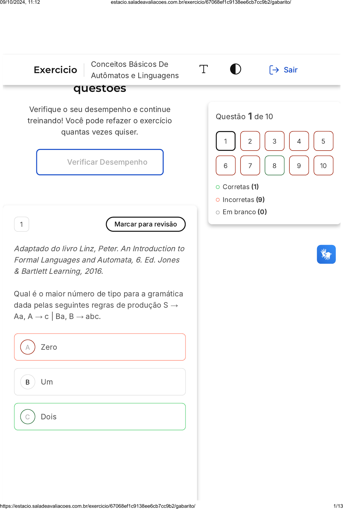 <p>Você acertou 1 de 10</p><p>questões</p><p>Verifique o seu desempenho e continue</p><p>treinando! Você pode refazer o exercício</p><p>quantas vezes quiser.</p><p>Verificar Desempenho</p><p>A</p><p>B</p><p>C</p><p>1 Marcar para revisão</p><p>Adaptado do livro Linz, Peter. An Introduction to</p><p>Formal Languages and Automata, 6. Ed. Jones</p><p>& Bartlett Learning, 2016.</p><p>Qual é o maior número de tipo para a gramática</p><p>dada pelas seguintes regras de produção S →</p><p>Aa, A → c | Ba, B → abc.</p><p>Zero</p><p>Um</p><p>Dois</p><p>Questão 1 de 10</p><p>Corretas �1�</p><p>Incorretas �9�</p><p>Em branco �0�</p><p>1 2 3 4 5</p><p>6 7 8 9 10</p><p>Exercicio</p><p>Conceitos Básicos De</p><p>Autômatos e Linguagens</p><p>Sair</p><p>09/10/2024, 11:12 estacio.saladeavaliacoes.com.br/exercicio/67068ef1c9138ee6cb7cc9b2/gabarito/</p><p>https://estacio.saladeavaliacoes.com.br/exercicio/67068ef1c9138ee6cb7cc9b2/gabarito/ 1/13</p><p>D</p><p>E</p><p>Três</p><p>Quatro</p><p>Resposta incorreta</p><p>Opa! A alternativa correta é a letra</p><p>C. Confira o gabarito comentado!</p><p>Gabarito Comentado</p><p>Todas as gramáticas do tipo 2, livres de</p><p>contexto, devem ter suas regras de</p><p>produção atendendo às seguintes</p><p>restrições: 1. Todas as regras de produção</p><p>devem ser do tipo �Não-terminal) →</p><p>�Terminal ou qualquer combinação de</p><p>terminal e não-terminal); 2. O tamanho do</p><p>não-terminal do lado esquerdo da</p><p>produção deve ser igual a 1, ou seja |Não-</p><p>terminal| � 1. A gramática do enunciado</p><p>atende a essas duas restrições.</p><p>2 Marcar para revisão</p><p>BIO�RIO � 2014 � ETAM � Curso de Formação de</p><p>Técnicos - 2º Semestre</p><p>Dados três conjuntos, A = �1,2,3�, B = �4,5} e C</p><p>= �1,2,4�, observe os pares ordenados</p><p>apresentados graficamente na figura abaixo.</p><p>09/10/2024, 11:12 estacio.saladeavaliacoes.com.br/exercicio/67068ef1c9138ee6cb7cc9b2/gabarito/</p><p>https://estacio.saladeavaliacoes.com.br/exercicio/67068ef1c9138ee6cb7cc9b2/gabarito/ 2/13</p><p>A</p><p>B</p><p>C</p><p>D</p><p>E</p><p>Esses pares correspondem, graficamente, a:</p><p>B X �A ∩ C�</p><p>�A U C� X B</p><p>�A ∩ C� X B</p><p>B X �A U C�</p><p>C X �A U B�</p><p>Resposta incorreta</p><p>Opa! A alternativa correta é a letra</p><p>C. Confira o gabarito comentado!</p><p>Gabarito Comentado</p><p>A fim de que o produto cartesiano de B</p><p>com qualquer outro conjunto fosse</p><p>representado, os pares ordenados devem,</p><p>necessariamente, iniciar com os elementos</p><p>do conjunto B = �4, 5�. Como os pares da</p><p>figura começam com os elementos 1 e 2,</p><p>as alternativas a e d estão incorretas. A</p><p>alternativa ¿e¿ nos obrigaria a ter um par</p><p>ordenado começando com elemento 4. A</p><p>intersecção dos conjuntos A e C contém os</p><p>elementos comuns �1, 2�, uma vez que 3</p><p>não está contido em C. O produto</p><p>09/10/2024, 11:12 estacio.saladeavaliacoes.com.br/exercicio/67068ef1c9138ee6cb7cc9b2/gabarito/</p><p>https://estacio.saladeavaliacoes.com.br/exercicio/67068ef1c9138ee6cb7cc9b2/gabarito/ 3/13</p><p>A</p><p>B</p><p>C</p><p>D</p><p>E</p><p>cartesiano desse conjunto intersecção com</p><p>o conjunto B é: ��1, 4�; �1, 5�; �2, 4�; �2, 5��</p><p>3 Marcar para revisão</p><p>Adaptado do livro Linz, Peter. An Introduction to</p><p>Formal Languages and Automata, 6. Ed. Jones</p><p>& Bartlett Learning, 2016.</p><p>Qual a linguagem gerada pela gramática: G =</p><p>��S, A�, �0, 1�, �S→0S1, S→A, A→0A�, S�.</p><p>0m1m</p><p>λ</p><p>0 1m n</p><p>1 0m m</p><p>1 0m n</p><p>Resposta incorreta</p><p>Opa! A alternativa correta é a letra</p><p>B. Confira o gabarito comentado!</p><p>Gabarito Comentado</p><p>Observe que não existe uma regra de</p><p>produção que possa nos levar a um</p><p>símbolo terminal apenas. Todas as regras</p><p>de produção, se aplicadas, nos levam a</p><p>cadeias compostas de terminais e não</p><p>09/10/2024, 11:12 estacio.saladeavaliacoes.com.br/exercicio/67068ef1c9138ee6cb7cc9b2/gabarito/</p><p>https://estacio.saladeavaliacoes.com.br/exercicio/67068ef1c9138ee6cb7cc9b2/gabarito/ 4/13</p><p>A</p><p>B</p><p>C</p><p>D</p><p>E</p><p>terminais. Sendo impossível gerar cadeias</p><p>formadas apenas de terminais, essa é uma</p><p>linguagem vazia.</p><p>4 Marcar para revisão</p><p>Considere uma cadeia "A" de tamanho 5. O</p><p>número de subcadeias de A que podem ser</p><p>geradas é:</p><p>10</p><p>5</p><p>32</p><p>16</p><p>64</p><p>Resposta incorreta</p><p>Opa! A alternativa correta é a letra</p><p>C. Confira o gabarito comentado!</p><p>Gabarito Comentado</p><p>Para entender a resposta correta, é</p><p>importante lembrar que o número de</p><p>subconjuntos que podem ser formados a</p><p>partir de um conjunto com n elementos é</p><p>dado por 2 . Neste caso, estamos</p><p>considerando uma cadeia "A" de tamanho</p><p>5, ou seja, temos 5 elementos. Aplicando a</p><p>n</p><p>09/10/2024, 11:12 estacio.saladeavaliacoes.com.br/exercicio/67068ef1c9138ee6cb7cc9b2/gabarito/</p><p>https://estacio.saladeavaliacoes.com.br/exercicio/67068ef1c9138ee6cb7cc9b2/gabarito/ 5/13</p><p>A</p><p>B</p><p>C</p><p>D</p><p>E</p><p>fórmula, temos 2 , que resulta em 32.</p><p>Portanto, o número de subcadeias que</p><p>podem ser geradas a partir da cadeia "A" é</p><p>32.</p><p>5</p><p>5 Marcar para revisão</p><p>Adaptado do livro Linz, Peter. An Introduction to</p><p>Formal Languages and Automata, 6. Ed. Jones</p><p>& Bartlett Learning, 2016.</p><p>Qual o tipo da seguinte gramática?</p><p>S → aS/A</p><p>aS → aa</p><p>A → a</p><p>Irrestrito</p><p>Sensível ao Contexto</p><p>Livre de Contexto</p><p>Regular</p><p>Com estrutura de frase</p><p>Resposta incorreta</p><p>Opa! A alternativa correta é a letra</p><p>B. Confira o gabarito comentado!</p><p>Gabarito Comentado</p><p>09/10/2024, 11:12 