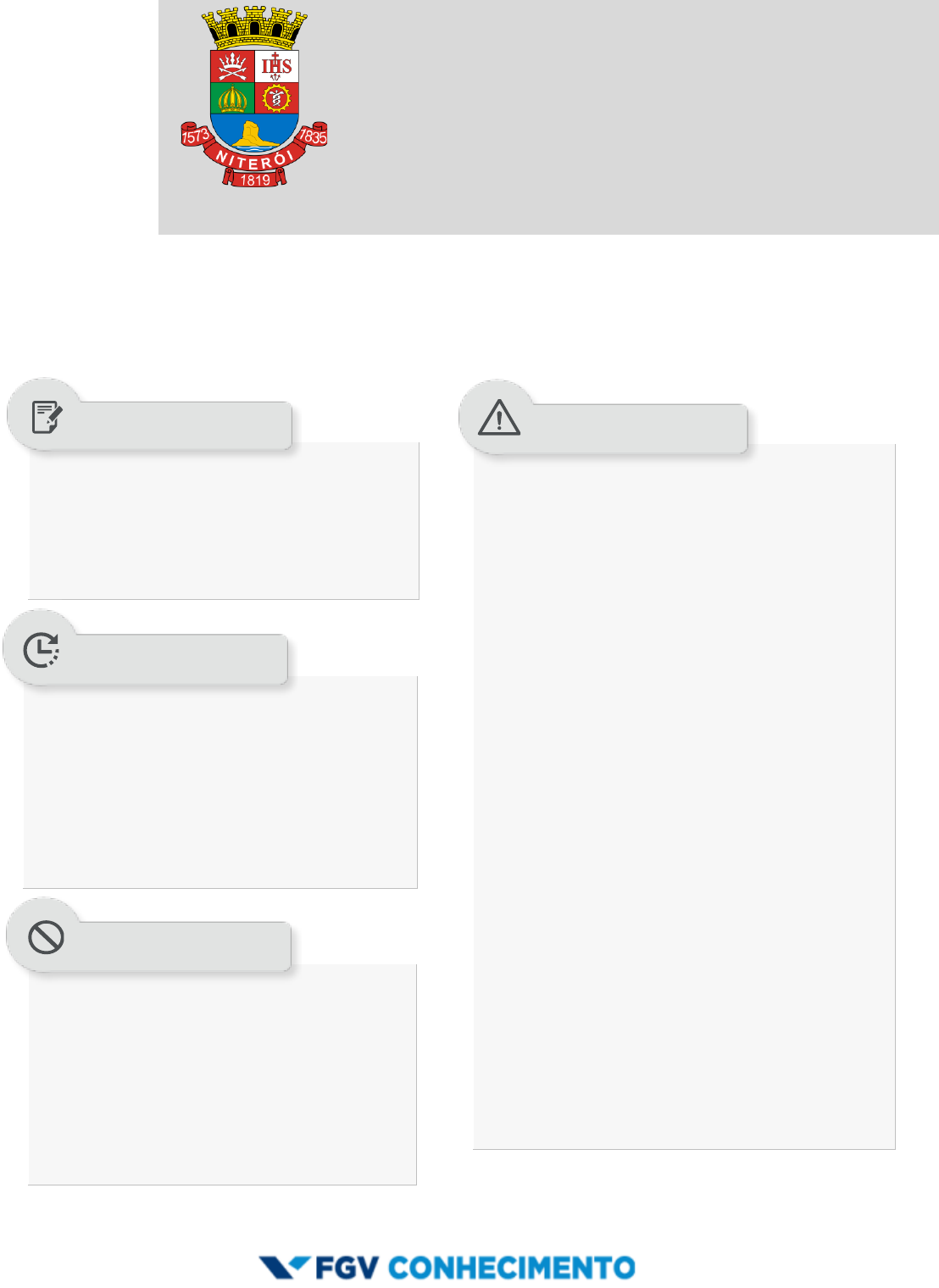 PREFEITURA MUNICIPAL DE NITERÓI SECRETARIA MUNICIPAL DE URBANISMO E MOBILIDADE TARDE AGENTE ADMINISTRATIVO NÍVEL MÉDIO TIPO 4 – AZUL Além deste caderno contendo 70 (setenta) questões objetivas, você receberá do fiscal de prova o cartão de respostas; As questões objetivas têm 5 (cinco) opções de resposta (A, B, C, D e E) e somente uma delas está correta. Verifique se seu caderno de questões está completo, sem repetição de questões ou falhas. Caso contrário, notifique imediatamente o fiscal da sala, para que sejam tomadas as devidas providências; Confira seus dados pessoais, especialmente nome, número de inscrição e documento de identidade e leia atentamente as instruções para preencher o cartão de respostas; Para o preenchimento do cartão de respostas, use somente caneta esferográfica, fabricada em material transparente, com tinta preta ou azul; Assine seu nome apenas no(s) espaço(s) reservado(s) no cartão de respostas; Confira seu cargo, cor e tipo do caderno de questões. Caso tenha recebido caderno de cargo ou cor ou tipo diferente do impresso em seu cartão de respostas, o fiscal deve ser obrigatoriamente informado para o devido registro na ata da sala; Reserve tempo suficiente para o preenchimento do seu cartão de respostas. O preenchimento é de sua responsabilidade e não será permitida a troca do cartão de respostas em caso de erro cometido pelo candidato; Para fins de avaliação, serão levadas em consideração apenas as marcações realizadas no cartão de respostas; A FGV coletará as impressões digitais dos candidatos na lista de presença; Os candidatos serão submetidos ao sistema de detecção de metais quando do ingresso e da saída de sanitários durante a realização das provas. Boa sorte! Você dispõe de 4 (quatro) horas e 30 (trinta) minutos para a realização da prova, já incluído o tempo para a marcação do cartão de respostas; 3 (três) horas após o início da prova, é possível retirar-se da sala, sem levar o caderno de questões; A partir dos 30 (trinta) minutos anteriores ao término da prova é possível retirar-se da sala levando o caderno de questões. Qualquer tipo de comunicação entre os candidatos durante a aplicação da prova; Anotar informações relativas às respostas em qualquer outro meio que não seja o caderno de questões; Levantar da cadeira sem autorização do fiscal de sala; Usar o sanitário ao término da prova, após deixar a sala. SUA PROVA TEMPO NÃO SERÁ PERMITIDO INFORMAÇÕES GERAIS SECRETARIA MUNICIPAL DE URBANISMO E MOBILIDADE DE NITERÓI FGV Agente Administrativo Tipo Azul – Página 3 MÓDULO I Língua Portuguesa 1 “É preciso parar de encarar a Internet como uma rede de computadores. Ela é uma rede de pessoas.” Esse pensamento está construído por dois períodos; nessa estrutura, o segundo período, em relação ao primeiro, funciona como uma (A) adição. (B) explicação. (C) correção. (D) justificativa. (E) ratificação. 2 “A melhor maneira de sair é sempre sair completamente.” Assinale a opção que apresenta a maneira adequada de reescrever-se essa frase de modo a eliminar dela todas as formas verbais. (A) “A melhor forma de saída: a saída completa.” (B) “A melhor maneira de sair: a saída completa.” (C) “A saída completa é a melhor forma de saída.” (D) “A melhor maneira de saída: sair completamente.” (E) “A melhor maneira de saída é sempre a saída completa.” 3 “Aqueles que esquecem o bem e o mal e buscam apenas conhecer os fatos têm mais probabilidade de realizar o bem do que aqueles que veem o mundo pela lente distorcida de seus próprios desejos.” Segundo a ordem de aparecimento na frase, assinale o termo que não estabelece coesão com nenhum termo anterior. (A) que (B) realizar (C) o bem (D) que (E) seus 4 “O que agora é provado foi uma vez apenas imaginado.” Nesta frase, a expressão “uma vez” cria ambiguidade, pois pode ser lida junto ao primeiro bloco ou ao segundo, com sentidos diferentes. Esse tipo de ambiguidade ocorre também em (A) “Pagar o IPVA já custa mais barato.” (B) “Falei com Pedro e Júlia, mas não entrei em sua casa.” (C) “Todos chegaram na hora marcada, menos ela.” (D) “Ela, revoltada, pegou a carta e jogou-a no chão.” (E) “Ficaram todas satisfeitas com a nomeação do Ministro.” 5 “Teoria é quando se sabe tudo e nada funciona. Prática é quando tudo funciona e ninguém sabe porquê. Neste recinto, conjugam- se teoria e prática: nada funciona e ninguém sabe porquê.” Na estruturação desse texto, o erro está (A) no emprego de “Neste” no lugar de “Nesse”. (B) na grafia de “porquê” no lugar de “por quê”. (C) na forma plural “conjugam-se” no lugar de “conjuga-se”. (D) na utilização de dois pontos (:) em lugar da conjunção “pois”. (E) no uso de “e ninguém” em lugar de “mas ninguém”. 6 “Teoria é quando se sabe tudo e nada funciona. Prática é quando tudo funciona e ninguém sabe porquê. Neste recinto, conjugam- se teoria e prática: nada funciona e ninguém sabe porquê.” No texto, os termos sublinhados podem trocar de posição sem alteração de sentido. Assinale a opção em que troca semelhante modifica o sentido da frase. (A) Talento e trabalho – quem tem vence. (B) Quem muito lê e muito anda vai chegar longe. (C) Sou como a lua: a todos encanto e não sou de ninguém. (D) Eu não cheguei a tempo de filmar o avanço de sinal e o atropelamento. (E) Não precisamos apenas de arte e ciência; mas também de paciência. 7 As opções a seguir apresentam expressões constituídas pelo verbo ter + substantivo, que podem ser substituídas por um só verbo de sentido equivalente. Assinale a opção que apresenta, feitas as adaptações necessárias, a substituição inadequada. (A) As características de uma pessoa têm origem em seus pais. / se originam em seus pais. (B) A enciclopédia tem ensinamentos para seus leito